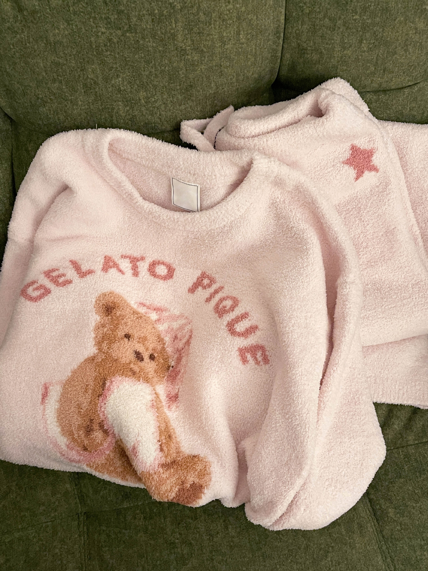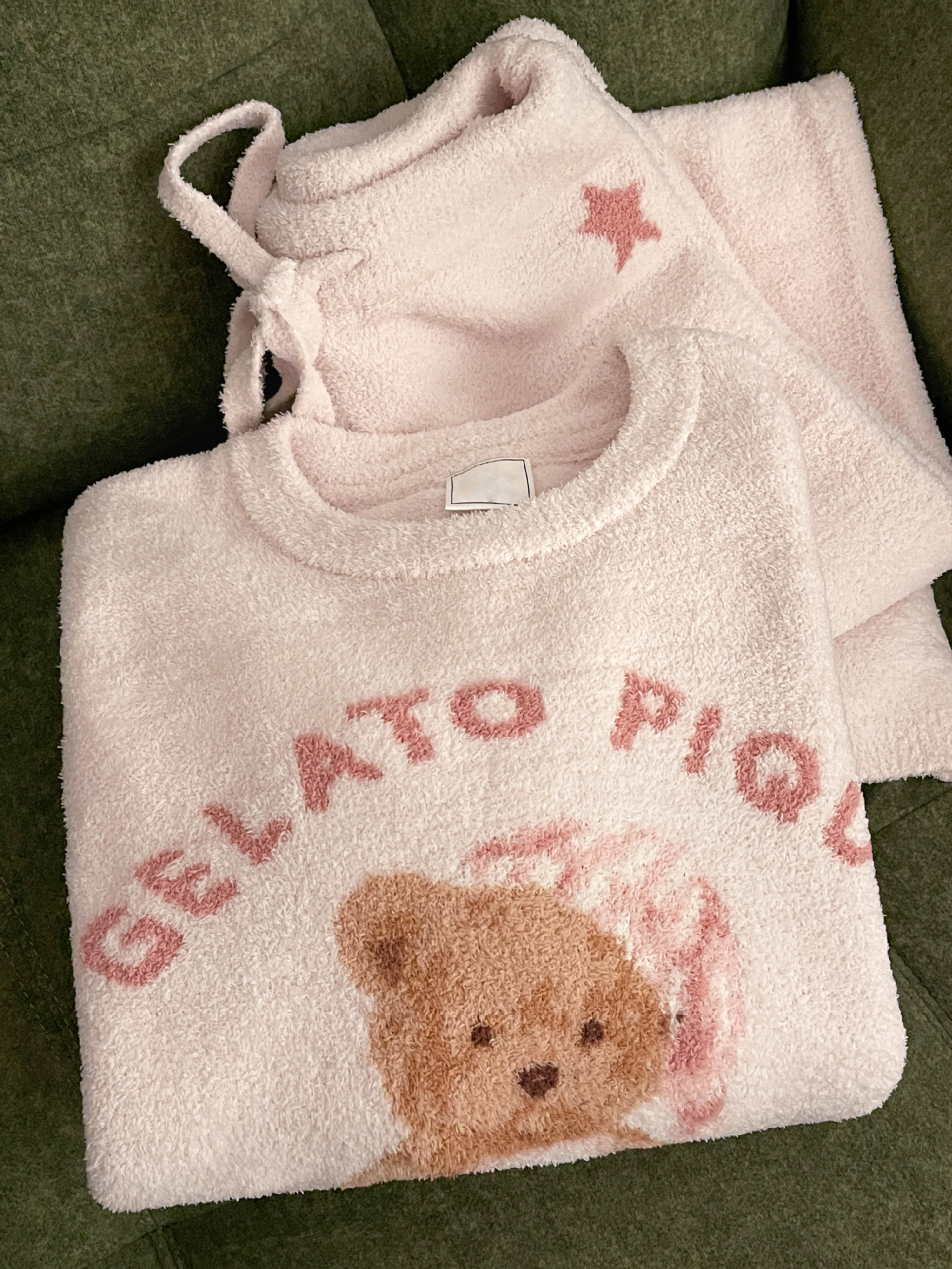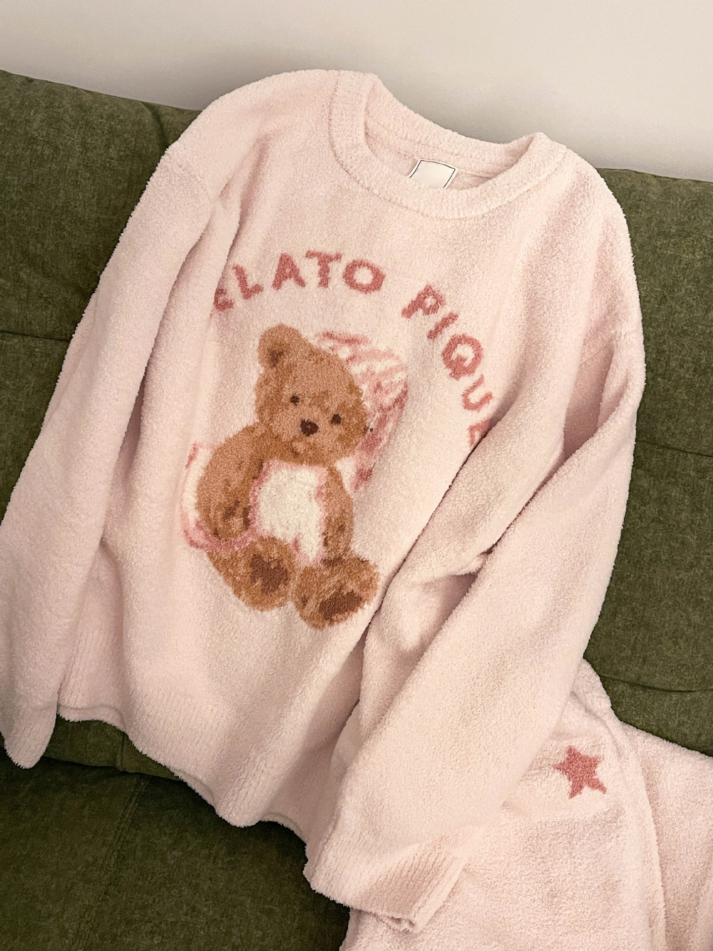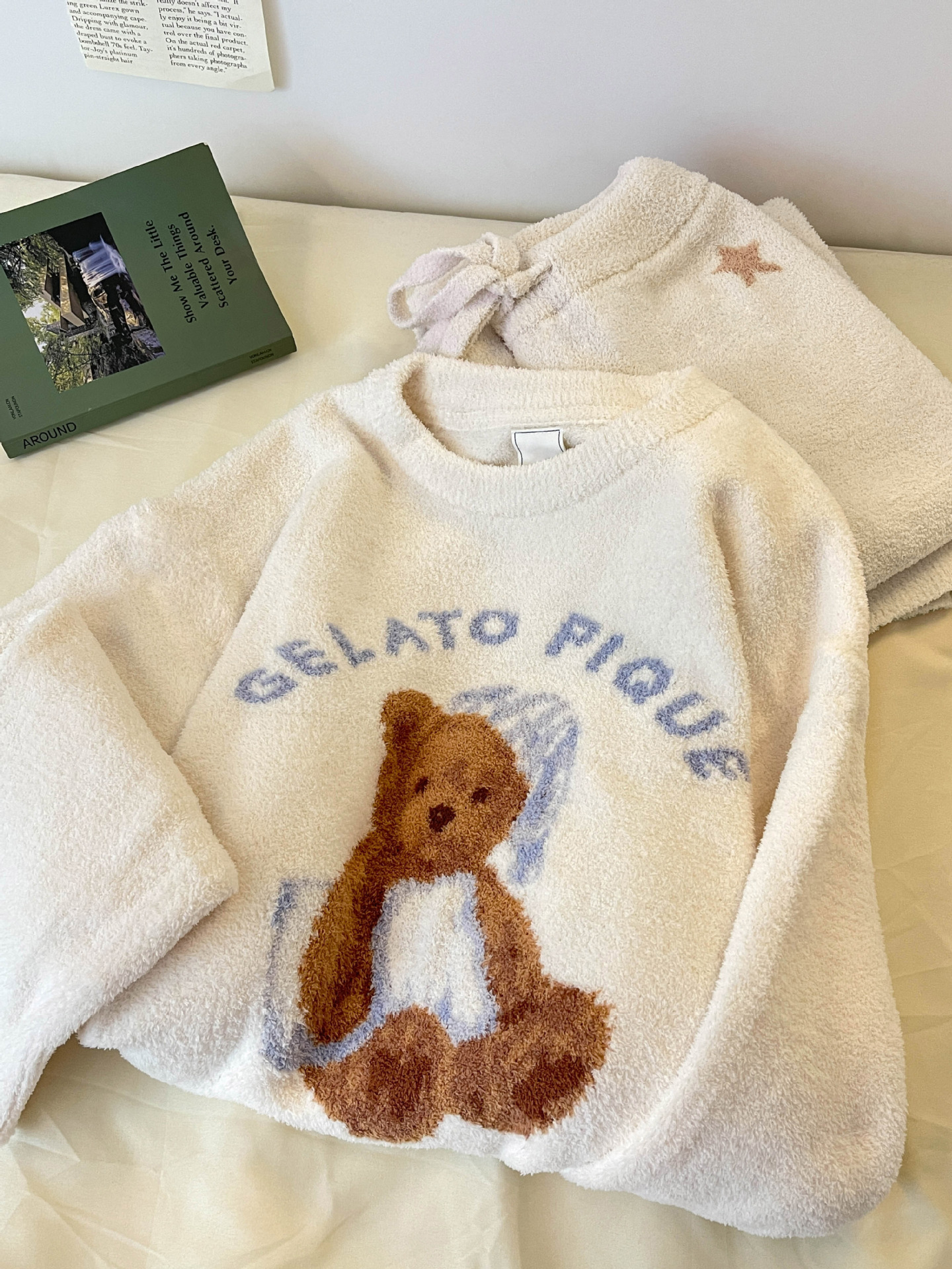 달콤한 핑크 만화 곰 니트 반 벨벳 잠옷 여성의 가을과 겨울 새로운 두꺼운 따뜻한 집 옷 세트