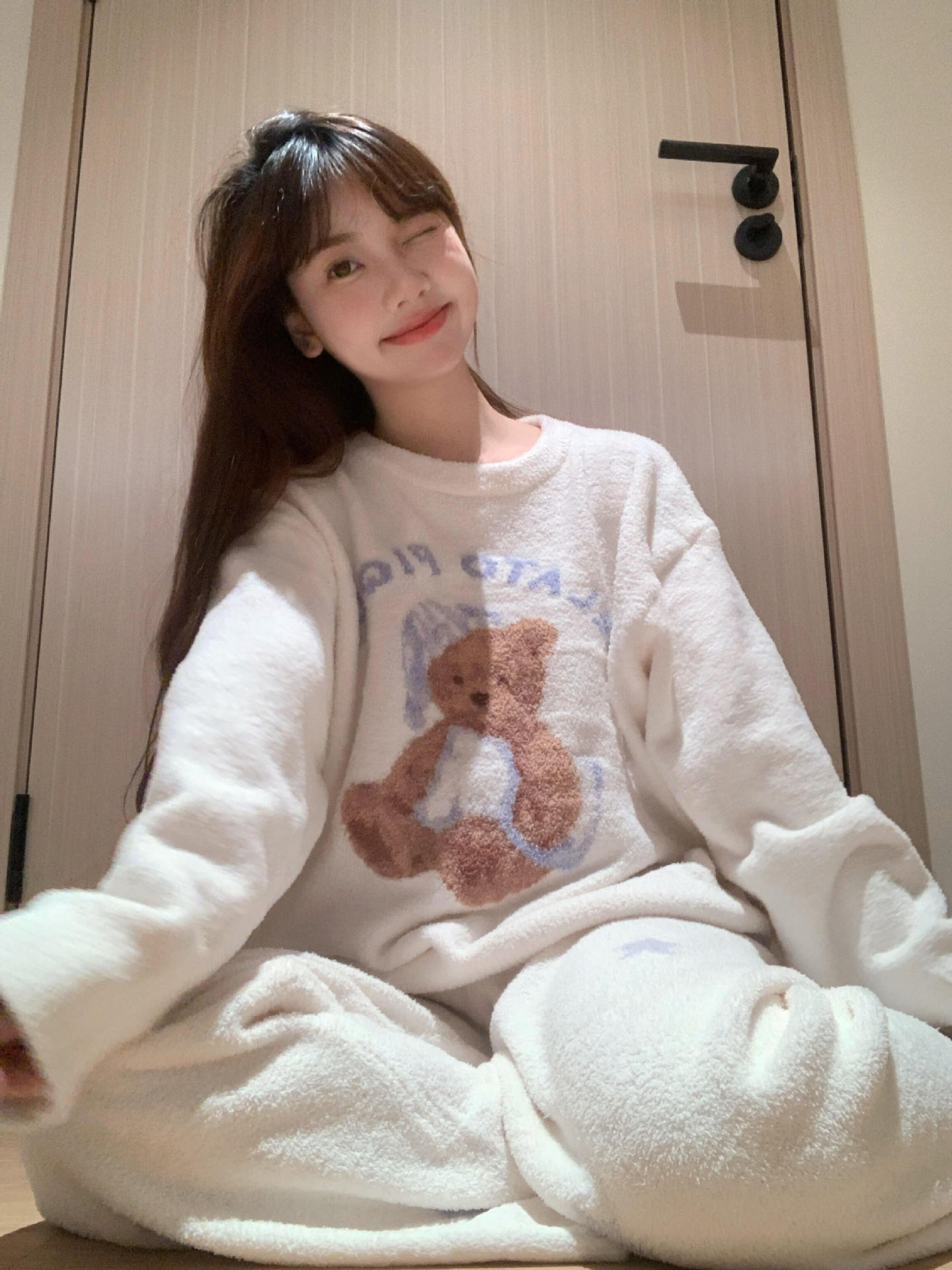 달콤한 핑크 만화 곰 니트 반 벨벳 잠옷 여성의 가을과 겨울 새로운 두꺼운 따뜻한 집 옷 세트스토어 가기
