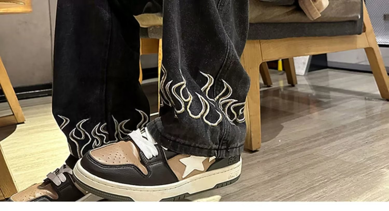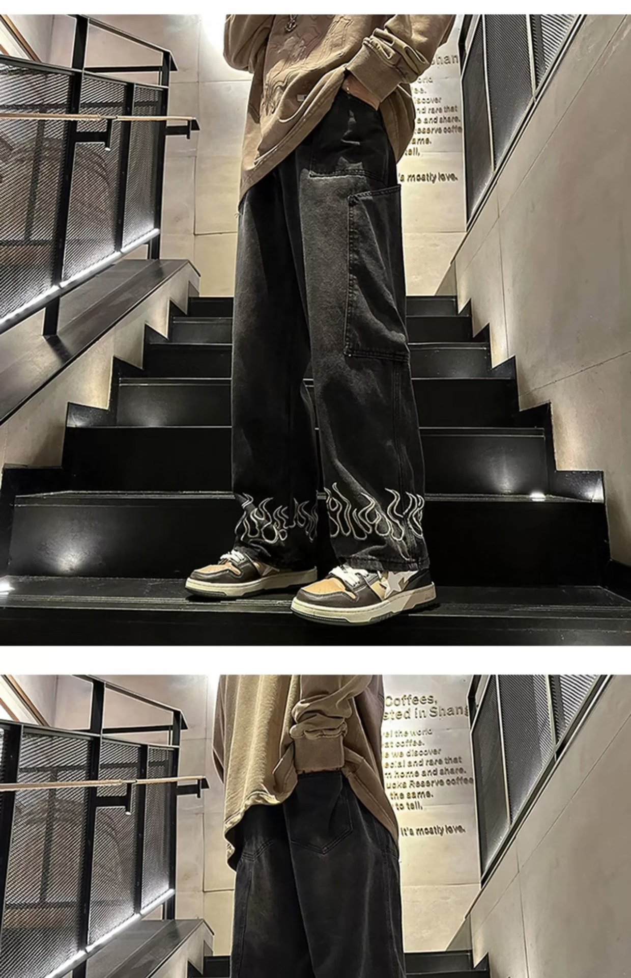 무거운 자수 화염 청바지 빈티지 아메리칸 스타일 루즈 스트레이트 바지 남성용 바이브 하이 스트리트 바지