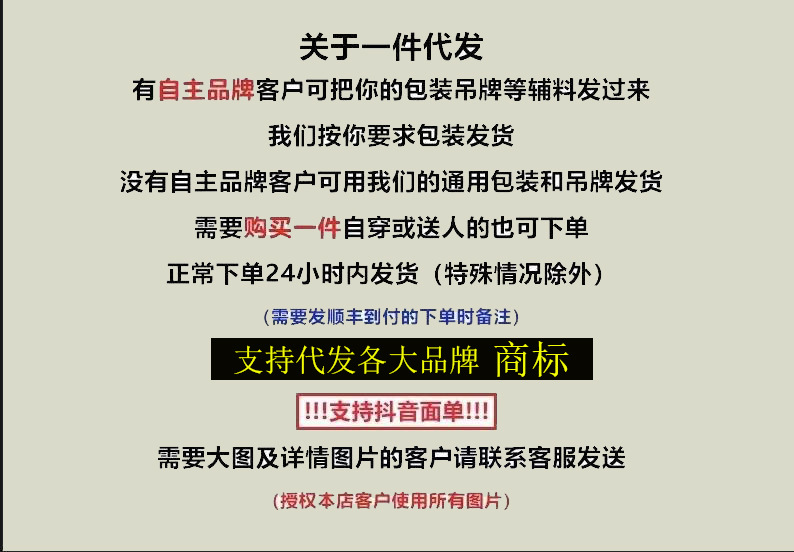 我们保证衣服的质量。款式新颖、性价比高。每一件产品都是检验合格后发货,支持一件代发。支持代发各大品牌商标,大额批发的客户请联系客服。 温馨提示:本店所售产品,发出的衣服均为白坯(无商标 无吊牌 简约包装)。