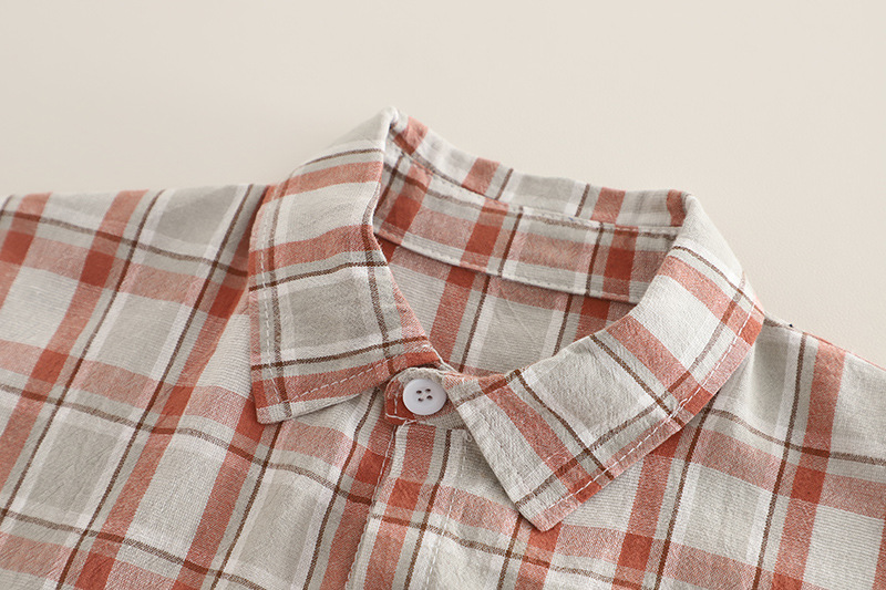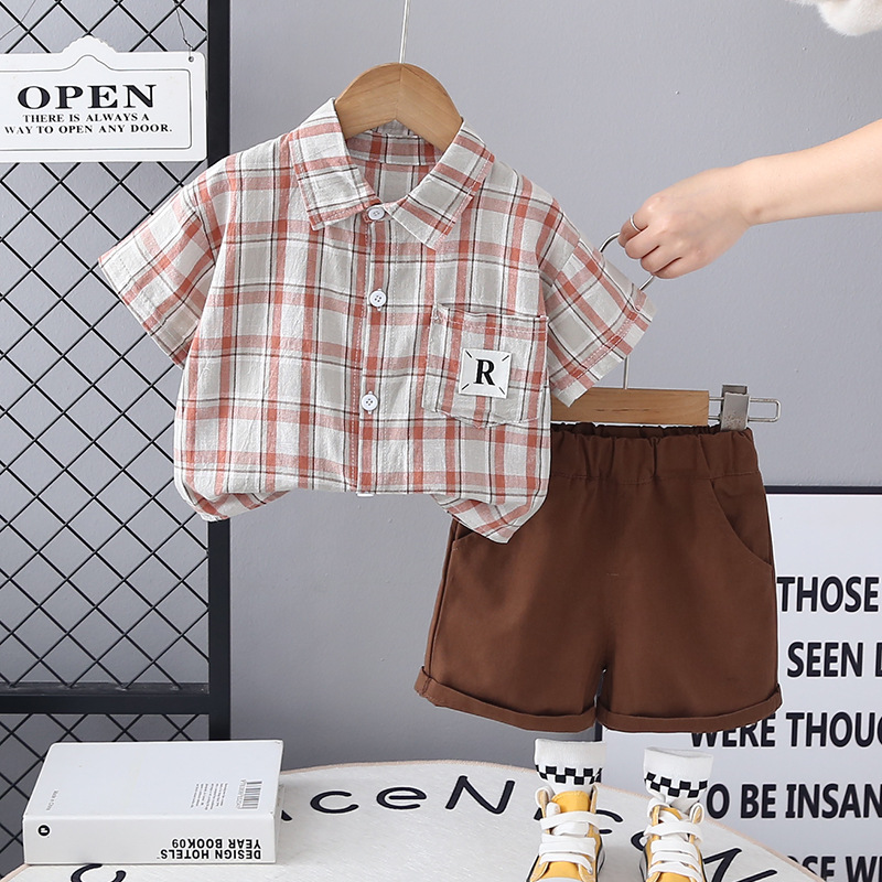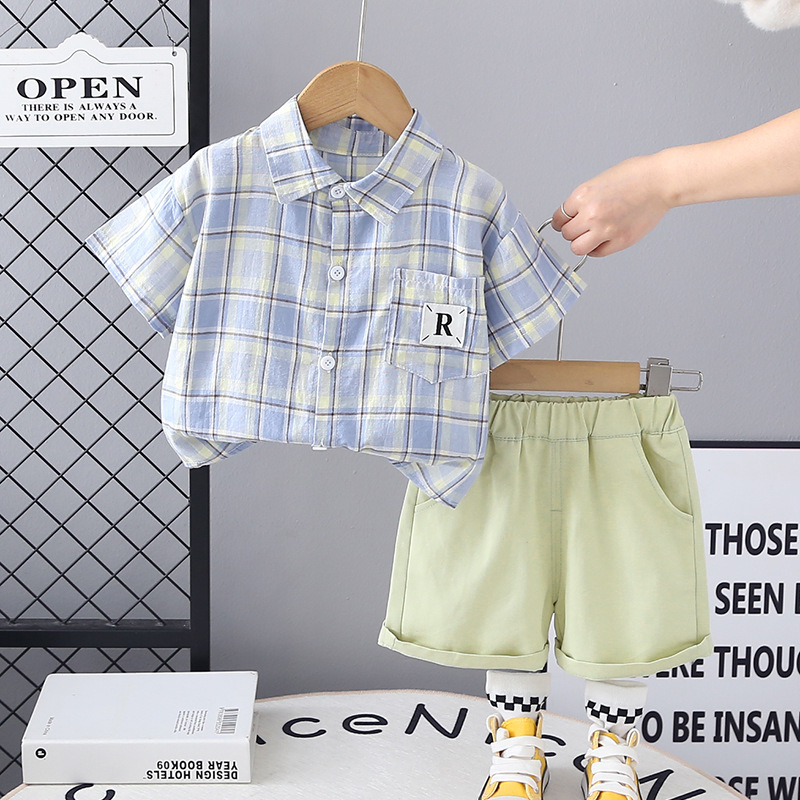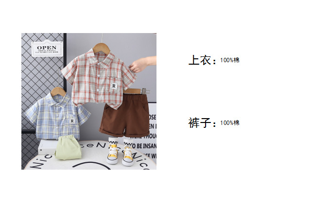 2025 소년 여름 반팔 세트 여름 새로운 유행 어린이 캐주얼 격자 무늬 라벨 투피스 세트 트렌디스토어 가기