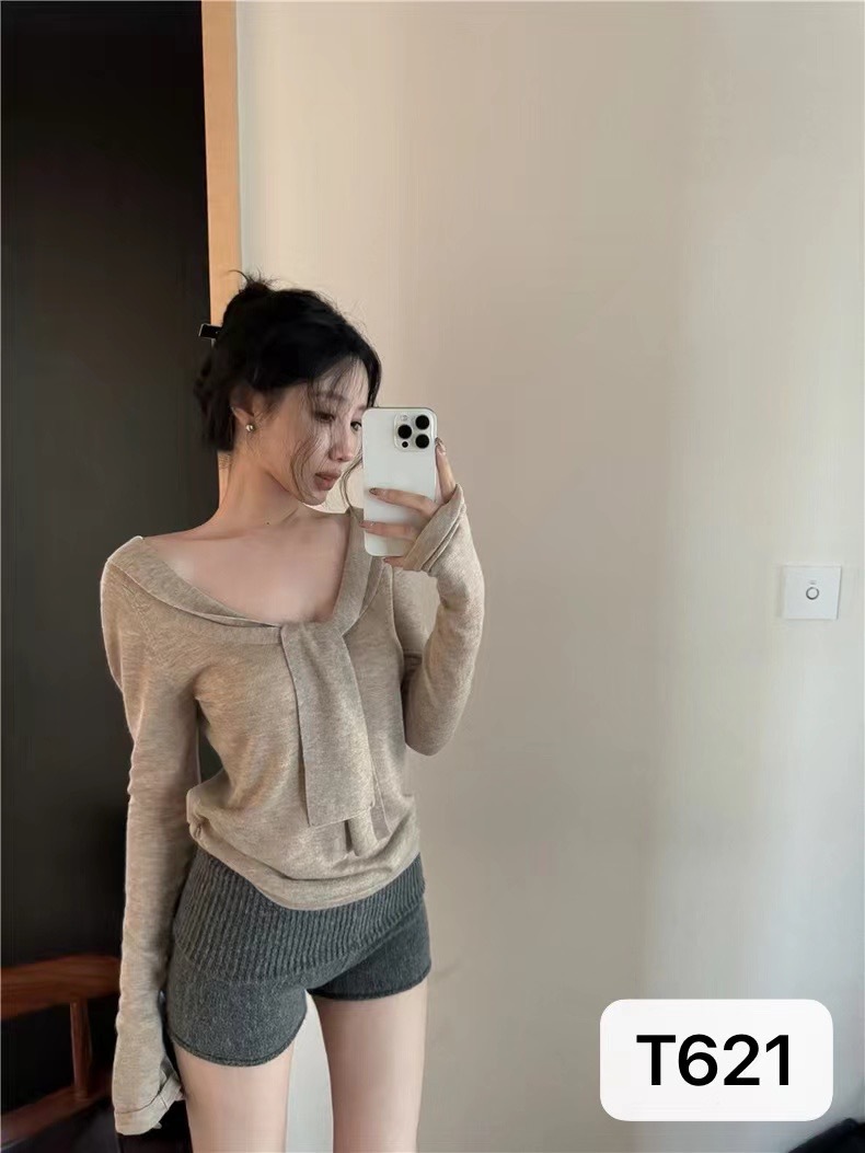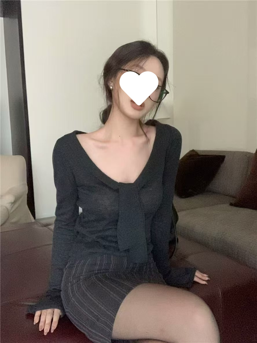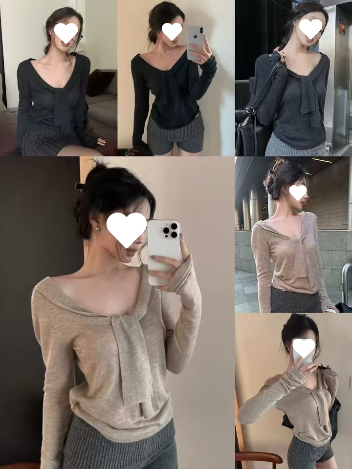 리본 브이넥 긴팔 니트 여성 가을 슬림핏 베이직 티셔츠 단색 시크 만능 상의 공장