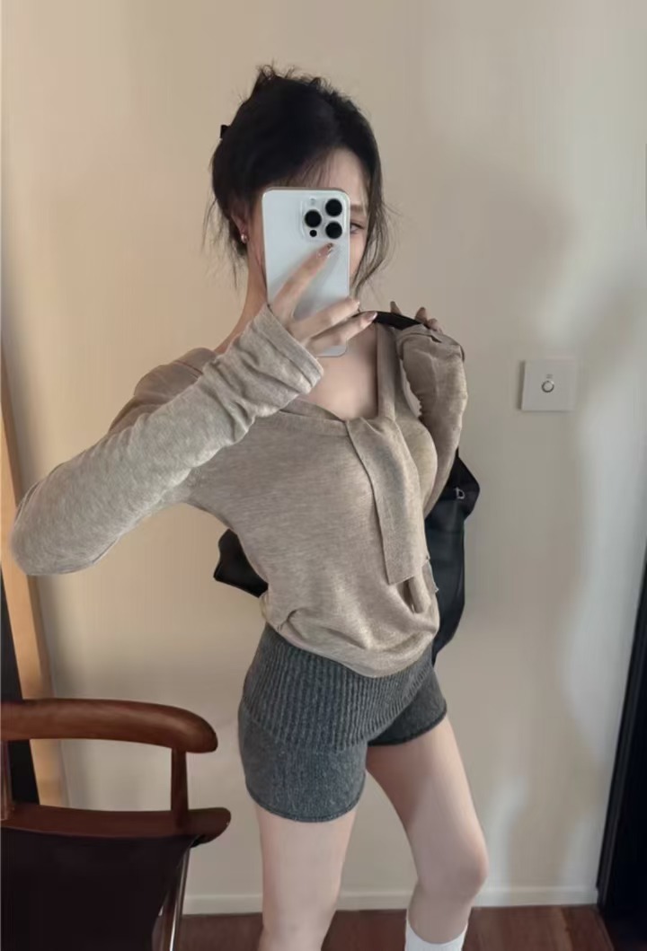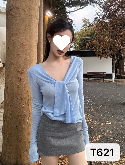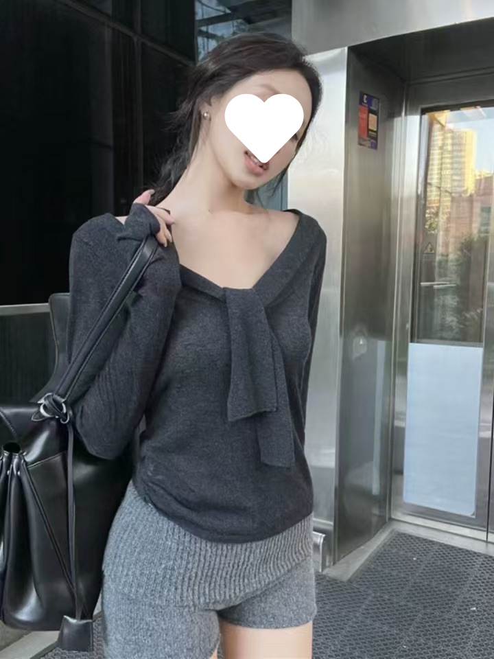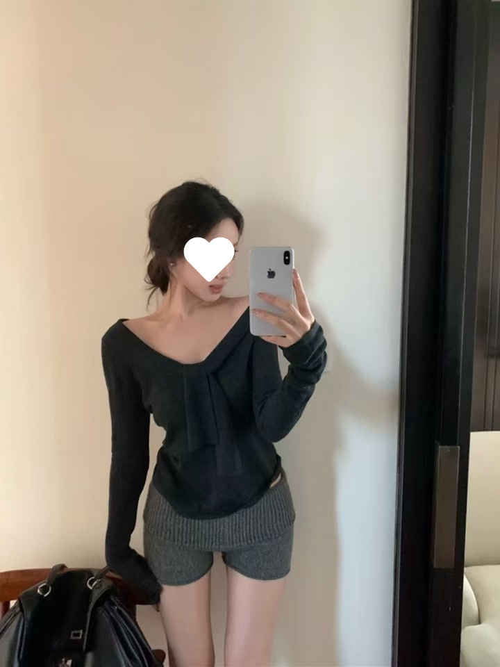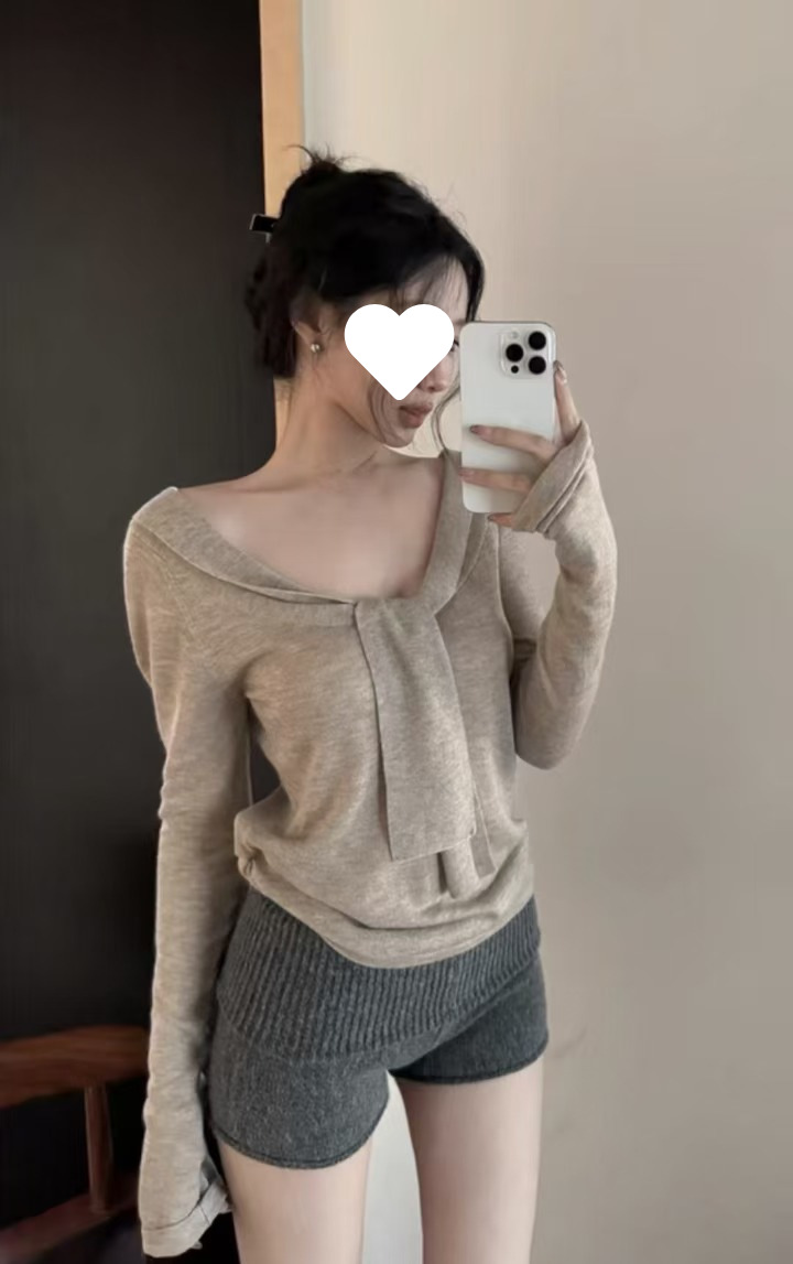 리본 브이넥 긴팔 니트 여성 가을 슬림핏 베이직 티셔츠 단색 시크 만능 상의 공장스토어 가기