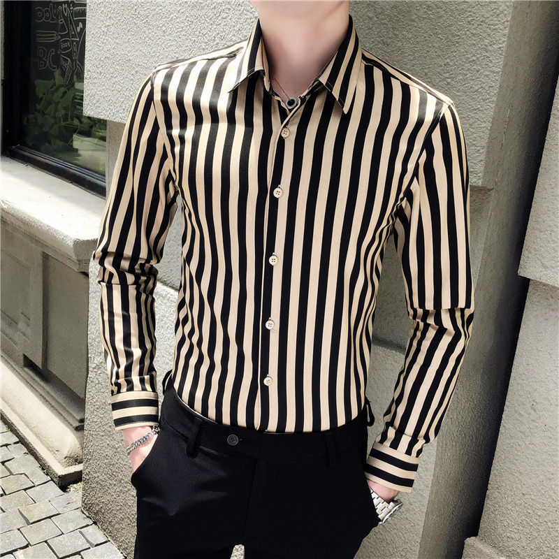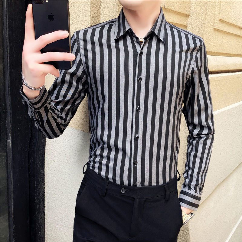 줄무늬 긴팔 셔츠 남자의 얇은 봄과 가을 한국 스타일 젊고 중년의 슬림 핏 비즈니스 셔츠 남성 최고 트렌디스토어 가기