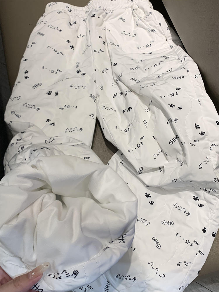 [3 차원 허리 머리] 귀여운 재미 인쇄 따뜻한 면화 바지 여성의 가을과 겨울 기모 두꺼운 느슨한 방풍 넓은 다리