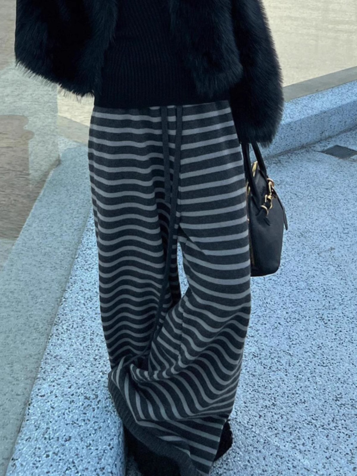 [재고, 입체 허리 머리] 두꺼운 따뜻한 줄무늬 양모 바지 가을과 겨울 게으른 편안한 니트 캐주얼 바지 여성