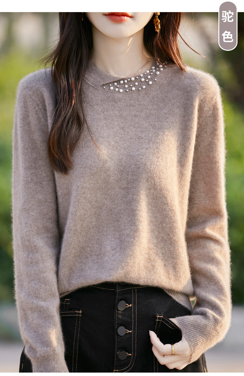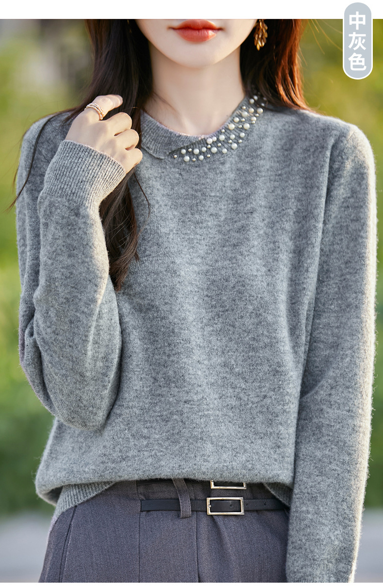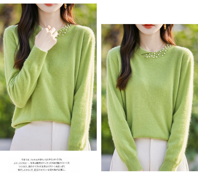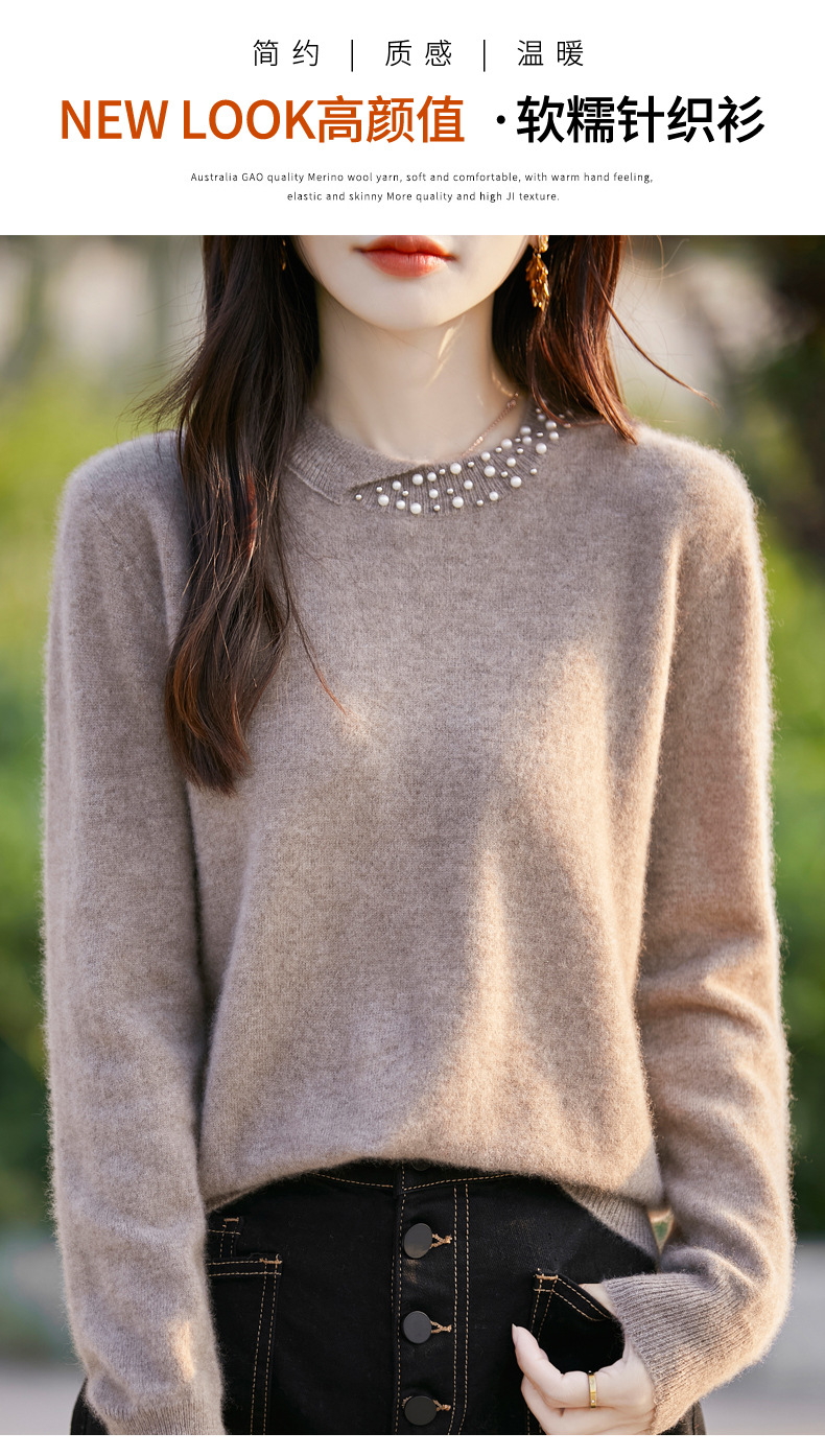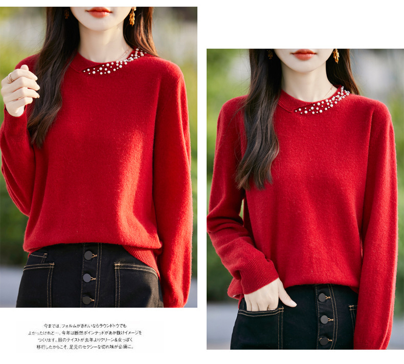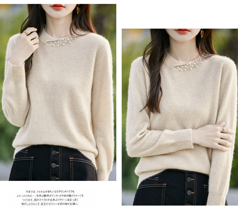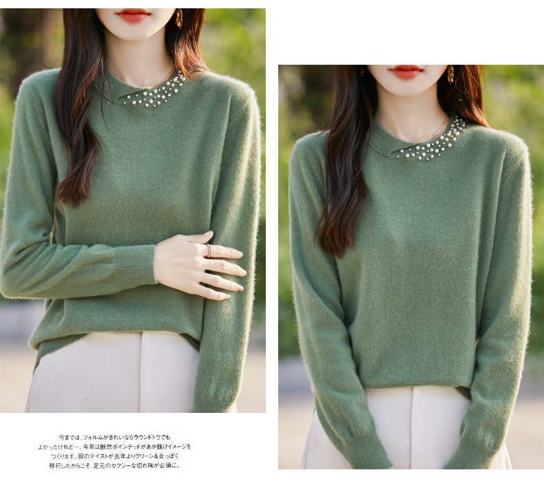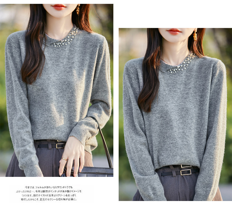 양모 블렌드 24 가을과 겨울 새로운 여성 크루 넥 구슬 느슨한 긴 소매 풀오버 짧은 니트 스웨터베이스 셔츠스토어 가기