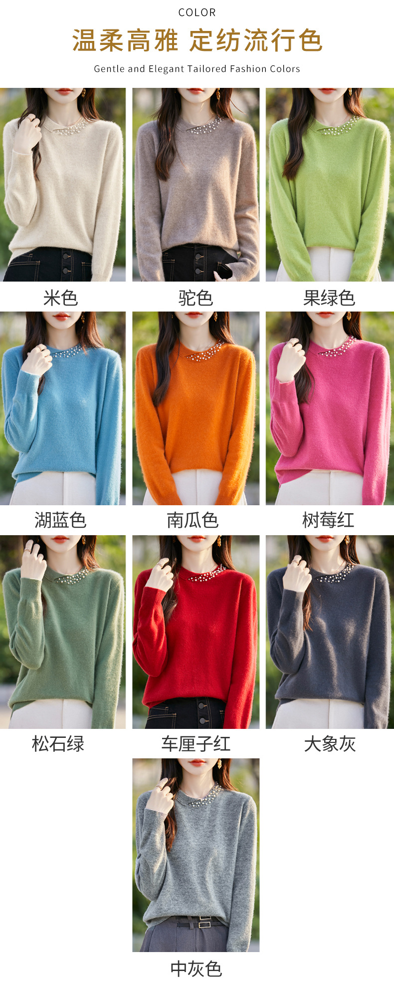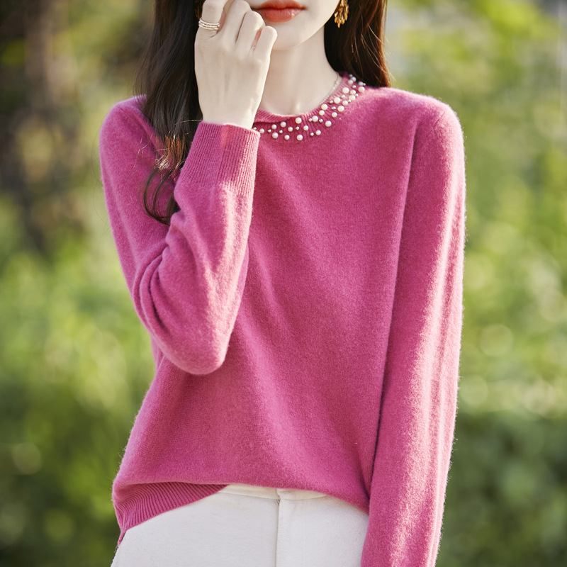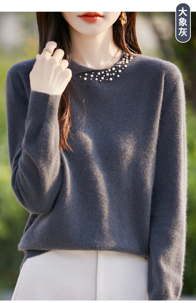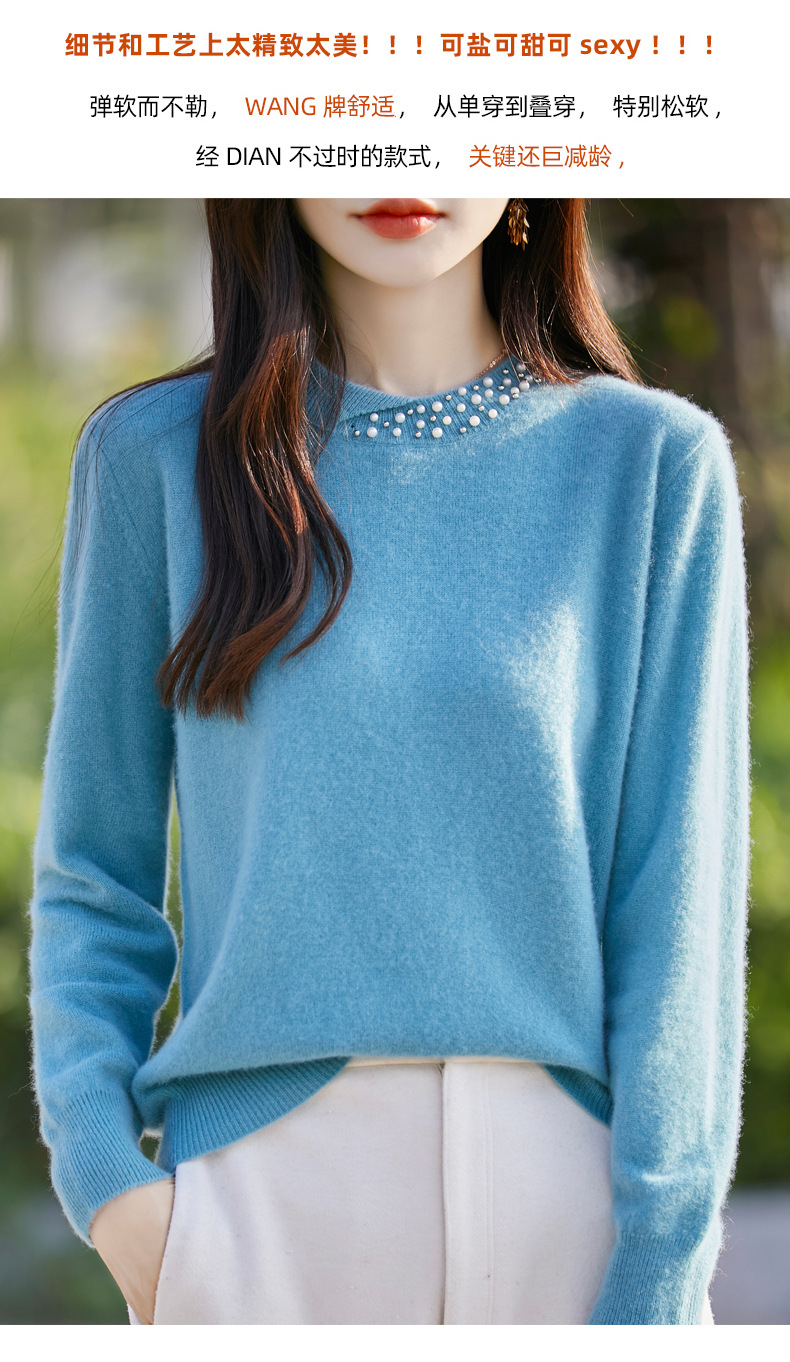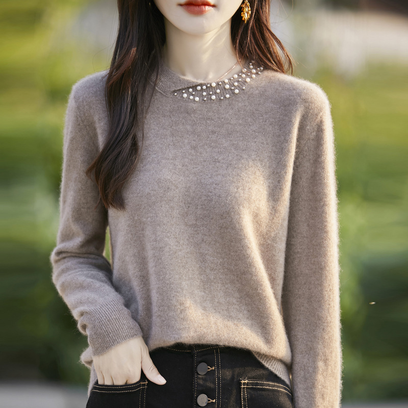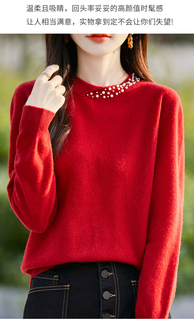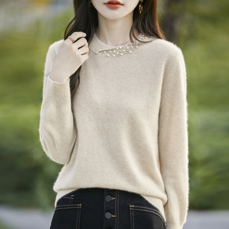 양모 블렌드 24 가을과 겨울 새로운 여성 크루 넥 구슬 느슨한 긴 소매 풀오버 짧은 니트 스웨터베이스 셔츠스토어 가기
