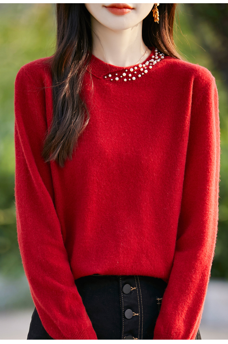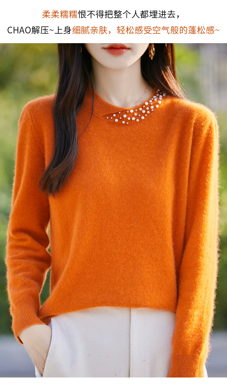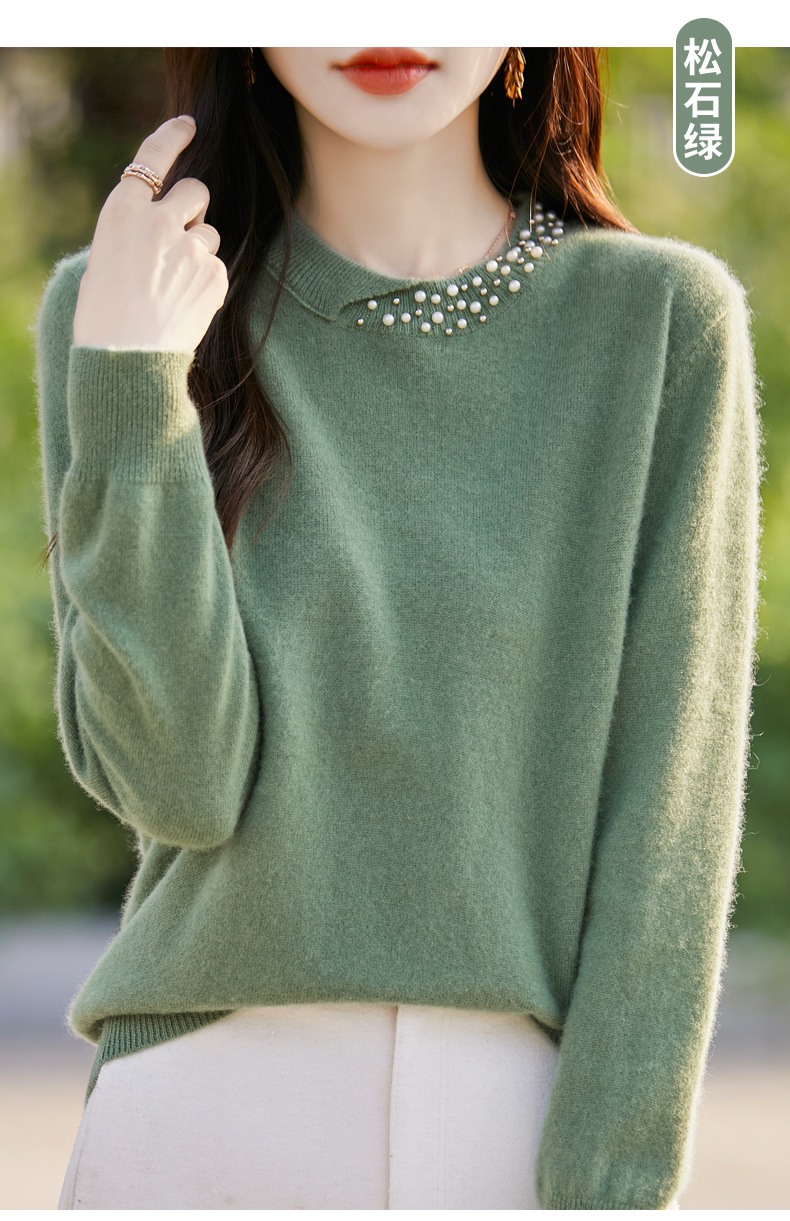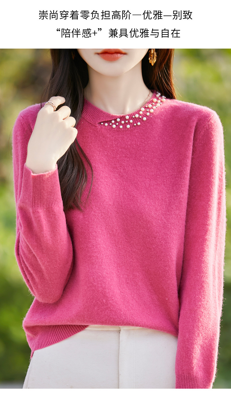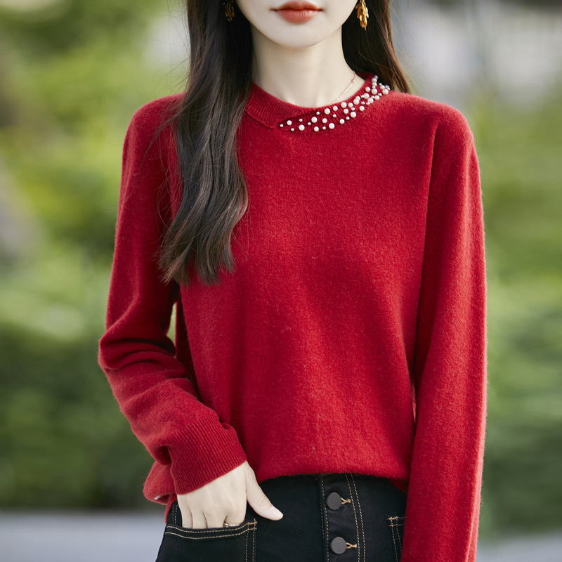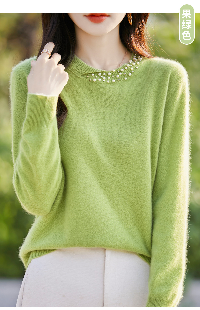 양모 블렌드 24 가을과 겨울 새로운 여성 크루 넥 구슬 느슨한 긴 소매 풀오버 짧은 니트 스웨터베이스 셔츠스토어 가기