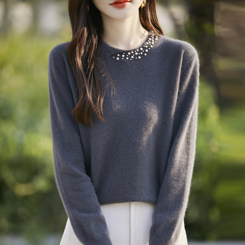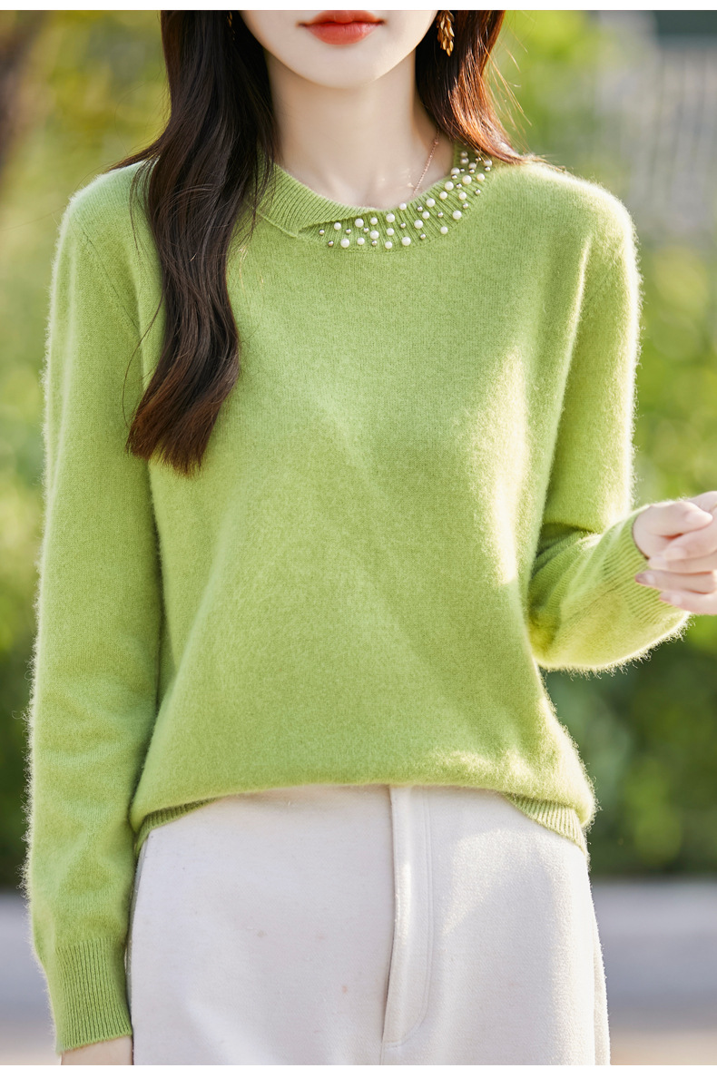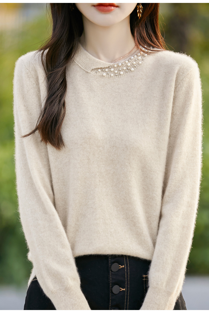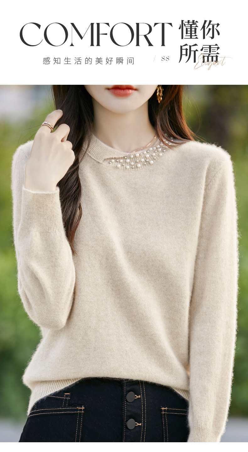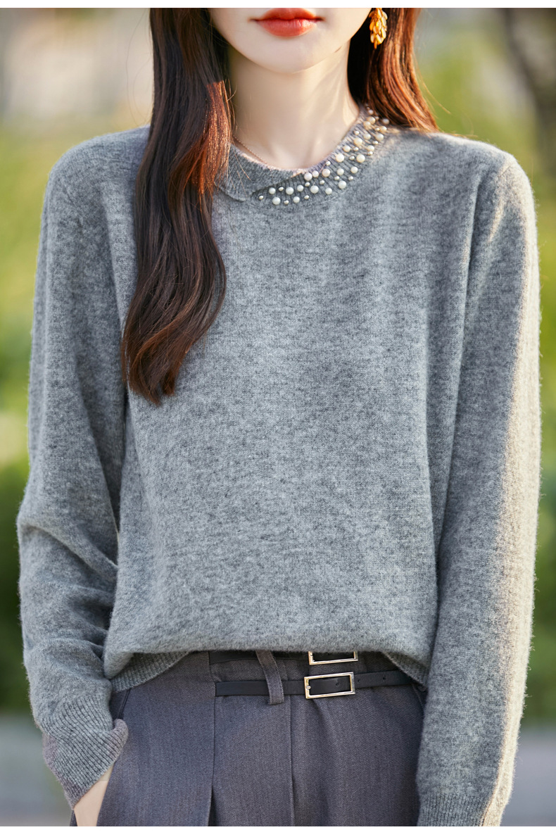 양모 블렌드 24 가을과 겨울 새로운 여성 크루 넥 구슬 느슨한 긴 소매 풀오버 짧은 니트 스웨터베이스 셔츠