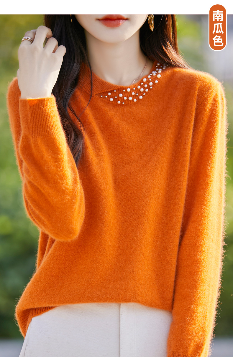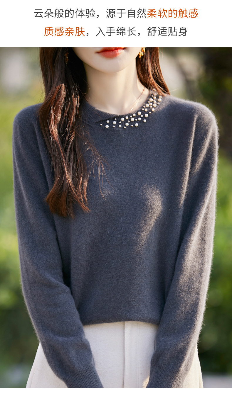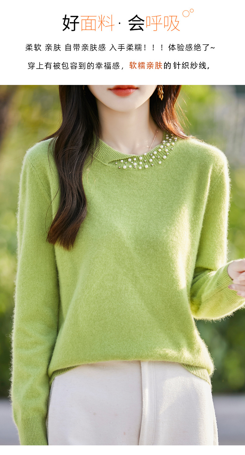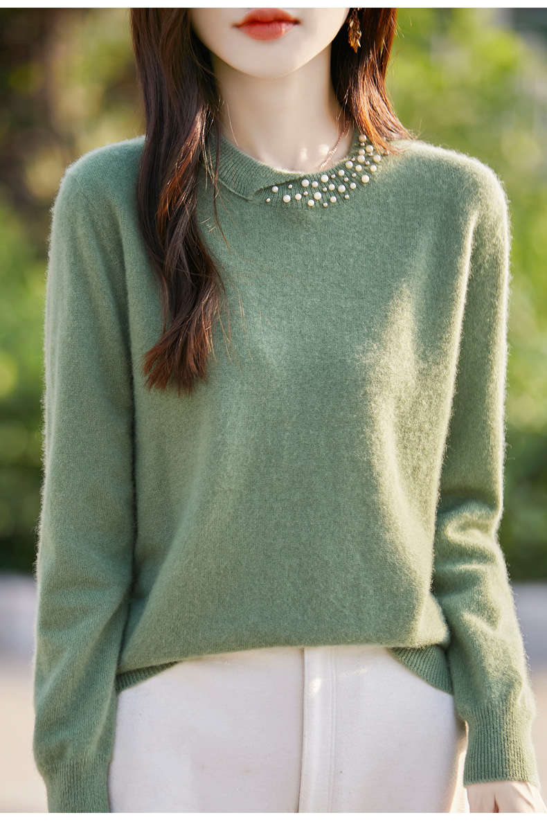 양모 블렌드 24 가을과 겨울 새로운 여성 크루 넥 구슬 느슨한 긴 소매 풀오버 짧은 니트 스웨터베이스 셔츠