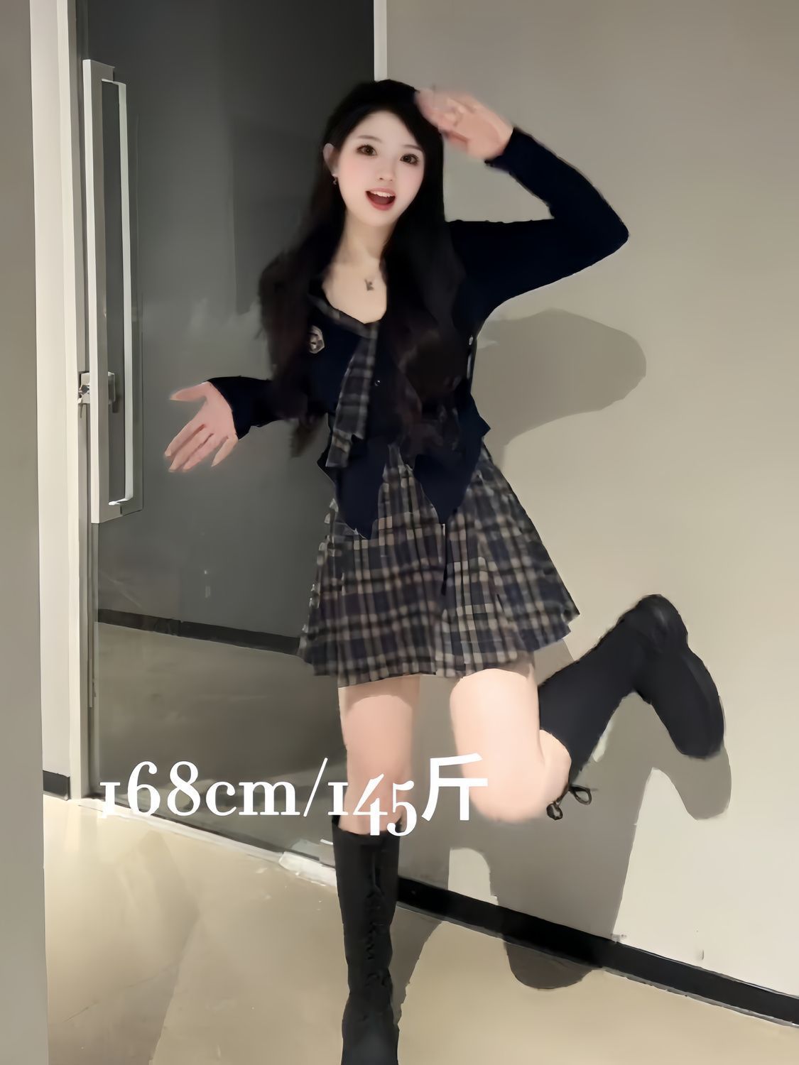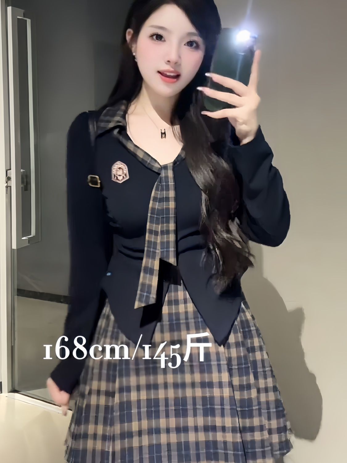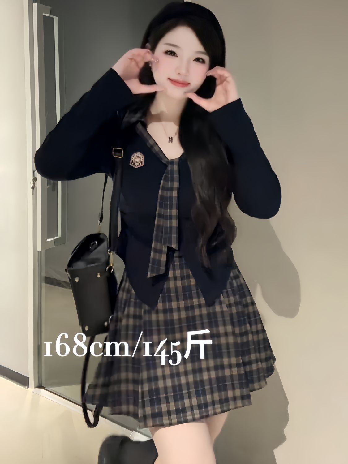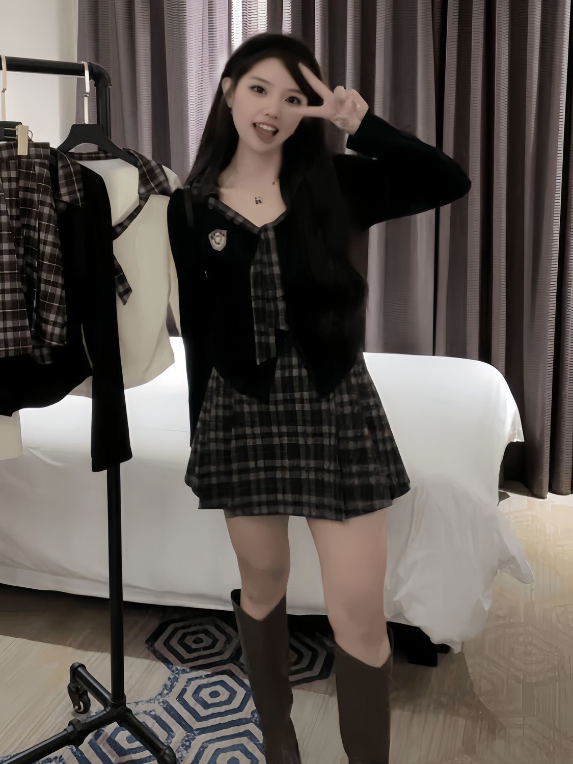 • 블랙 탑 + 체크 스커트 [투피스 세트]