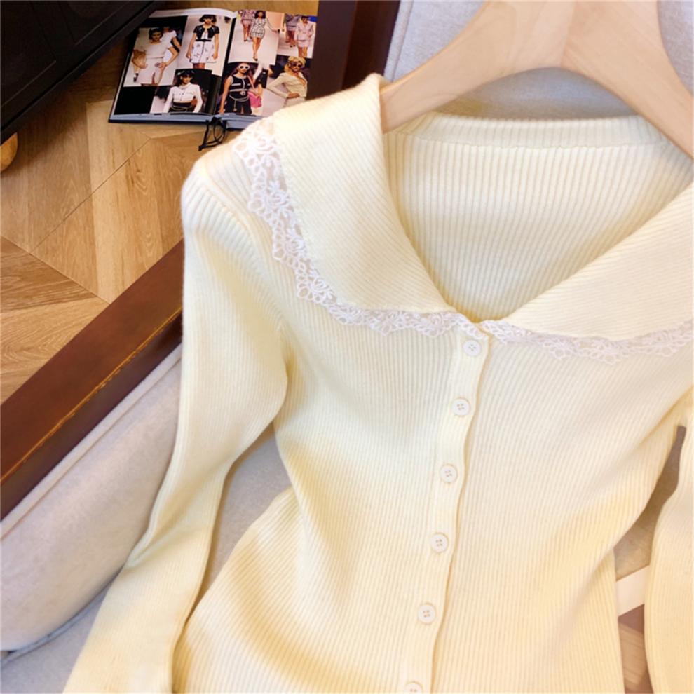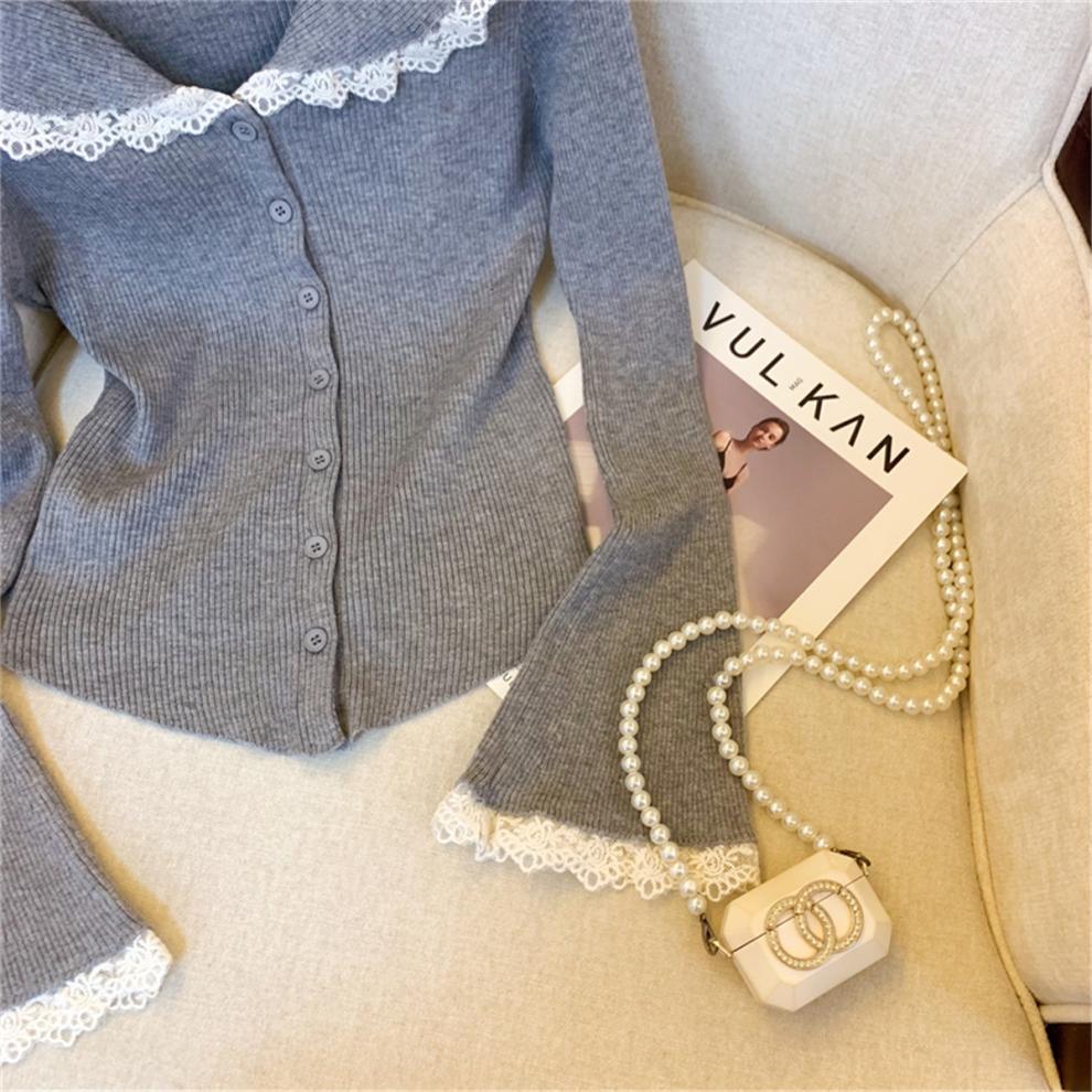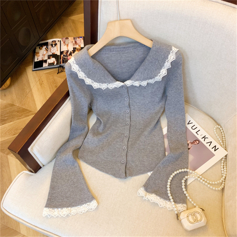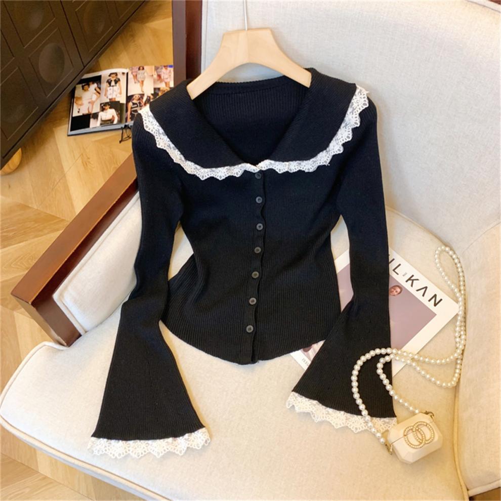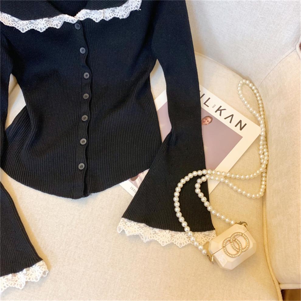 하이 엔드 우아한 슬림 핏 레이스 옷깃 경적 슬리브 니트 카디건 여성의 봄과 가을 새로운 슬림 올 매치 탑스토어 가기