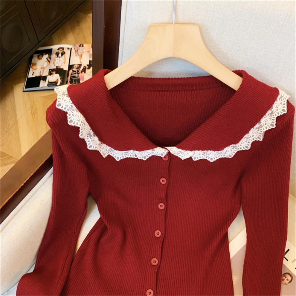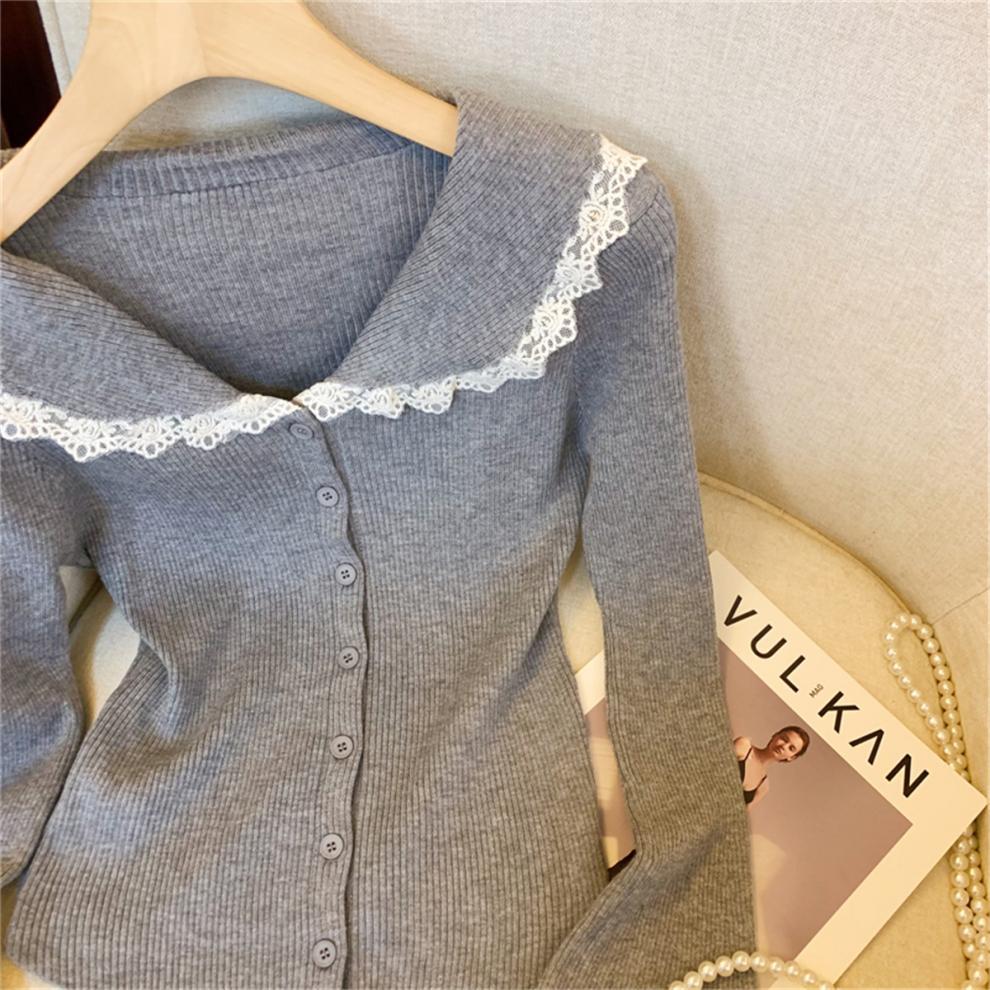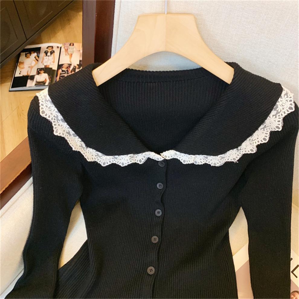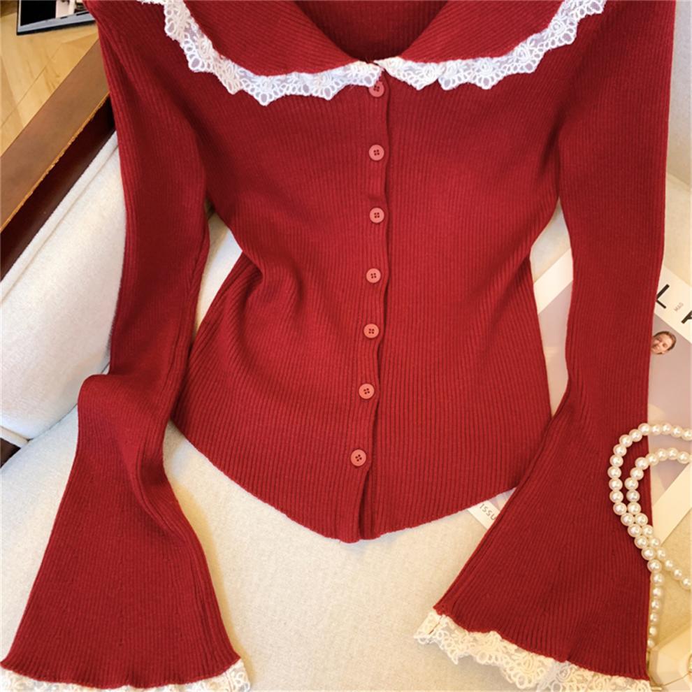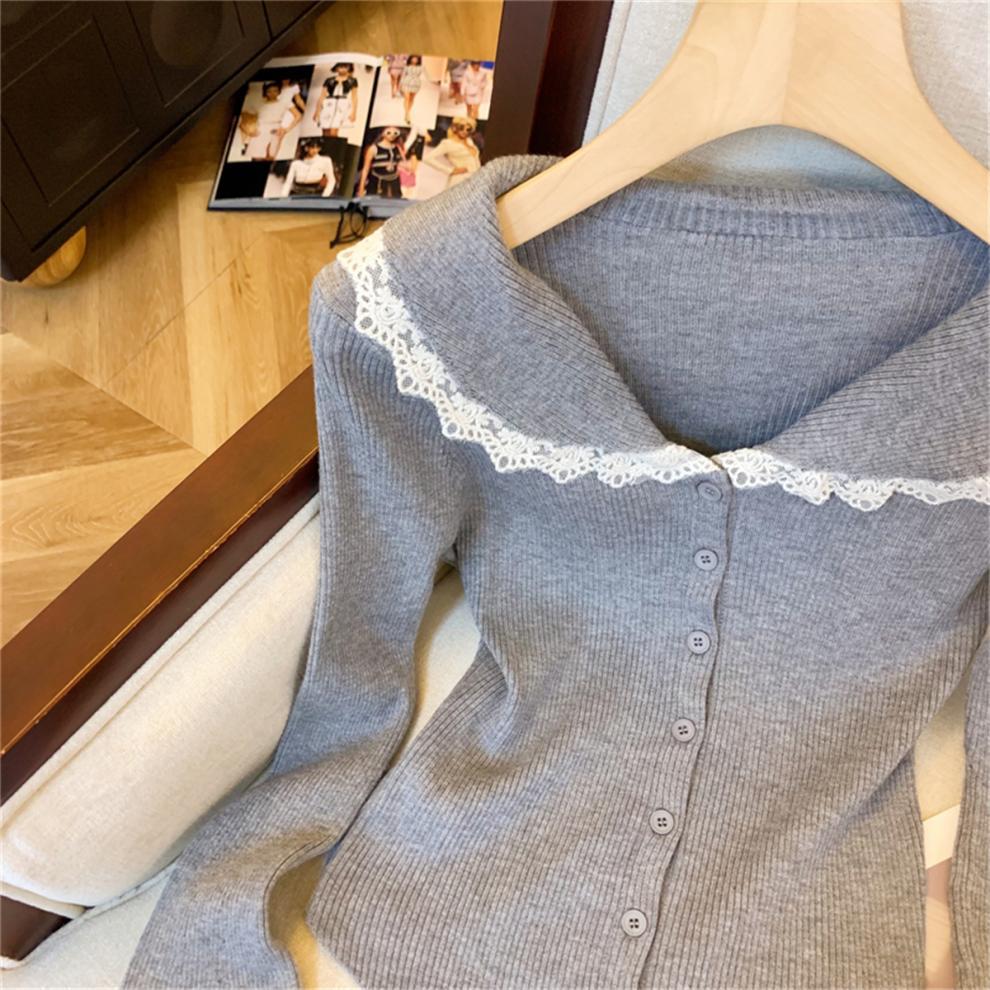 하이 엔드 우아한 슬림 핏 레이스 옷깃 경적 슬리브 니트 카디건 여성의 봄과 가을 새로운 슬림 올 매치 탑스토어 가기