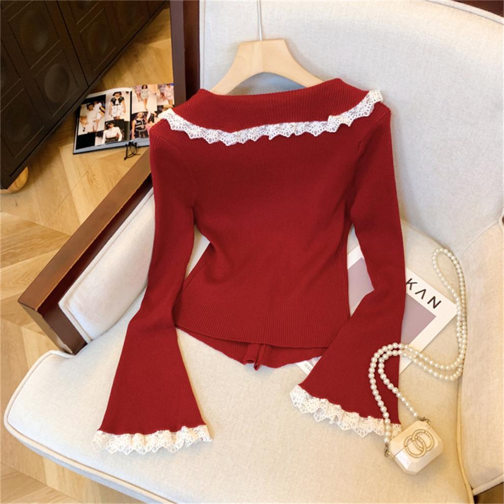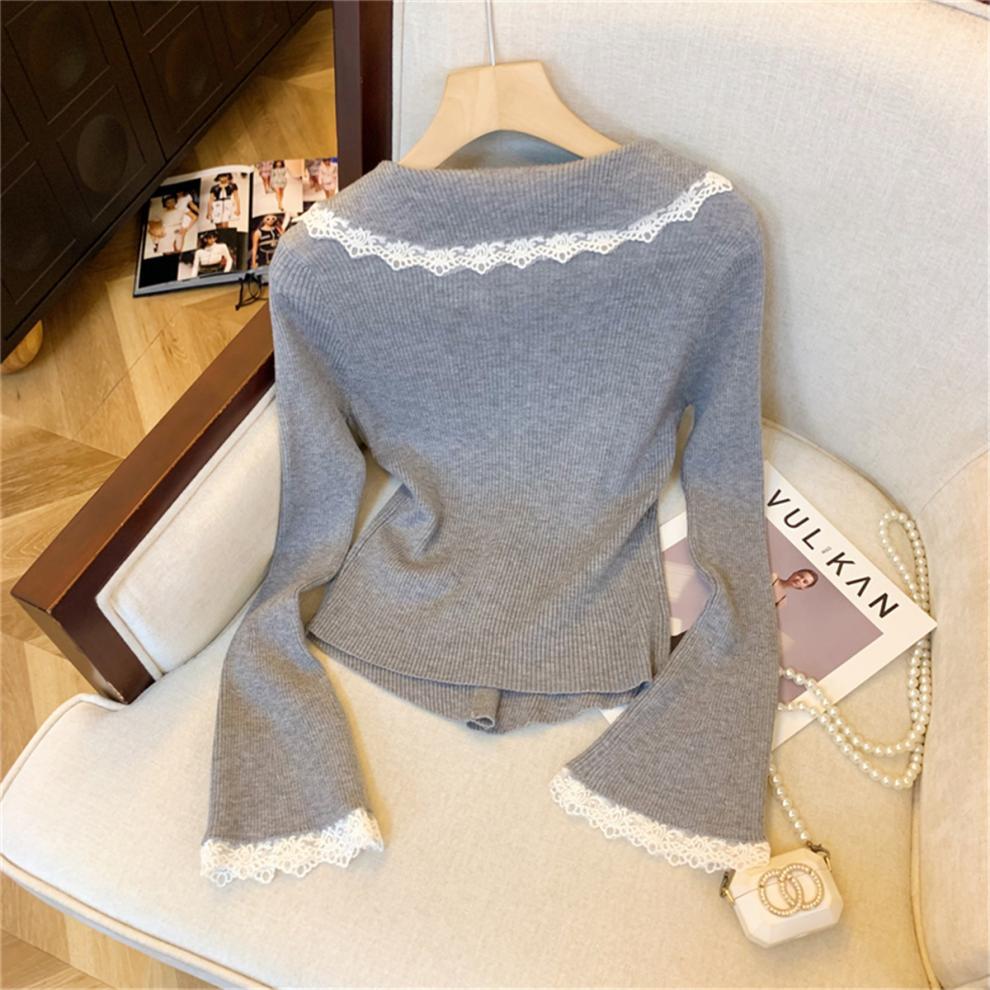 하이 엔드 우아한 슬림 핏 레이스 옷깃 경적 슬리브 니트 카디건 여성의 봄과 가을 새로운 슬림 올 매치 탑