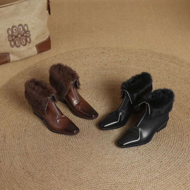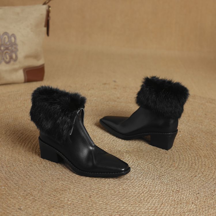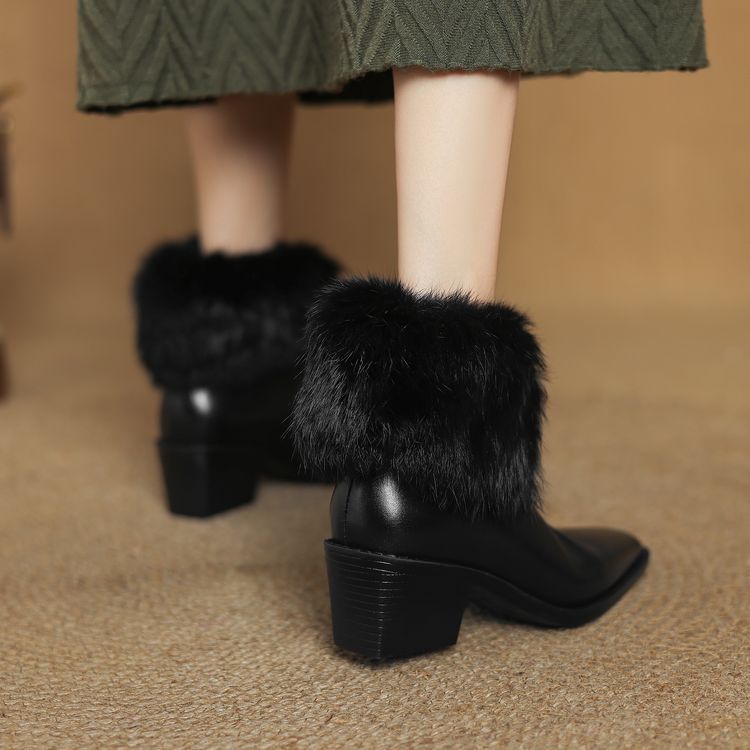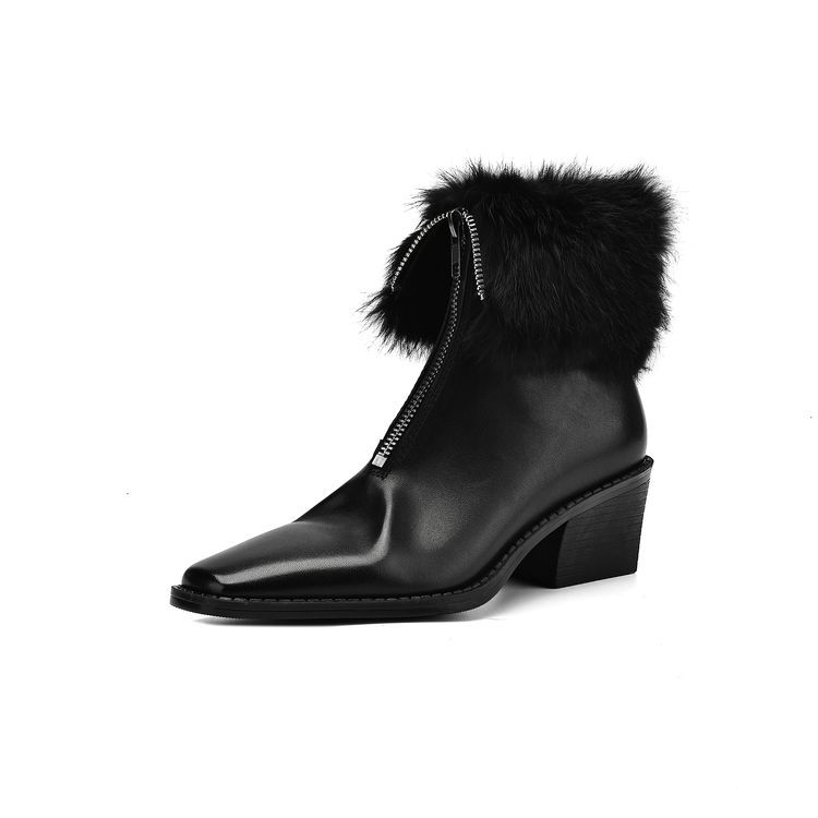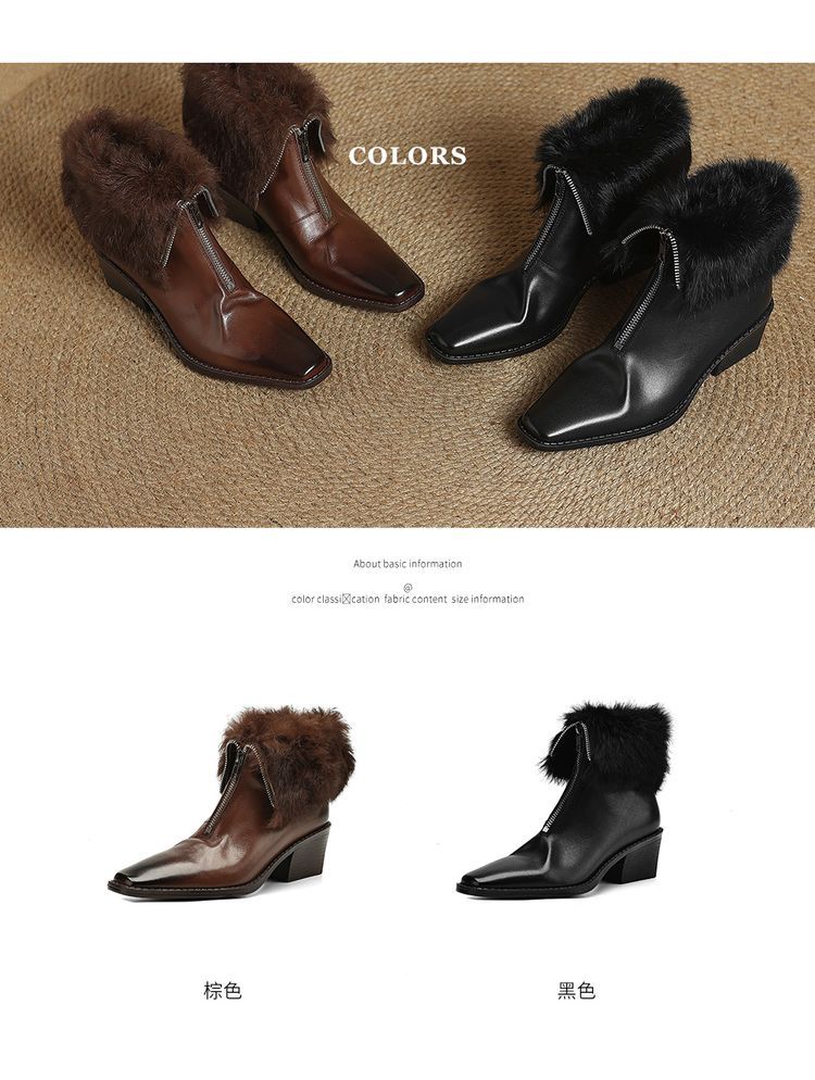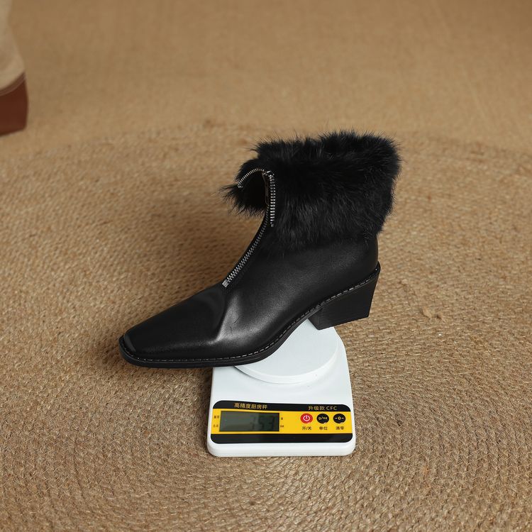 두꺼운 토끼 마오 마오 마오 내부 따뜻한 발목 부츠 여성의 2024 새로운 겨울 Cowhide 스퀘어 발가락 패션 부츠 두꺼운 힐 미드 힐 코튼 부츠스토어 가기