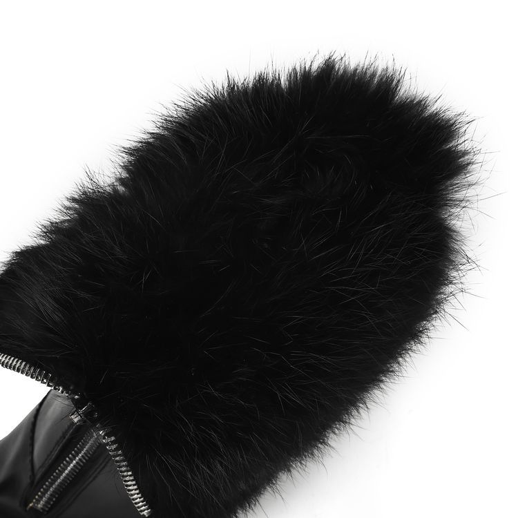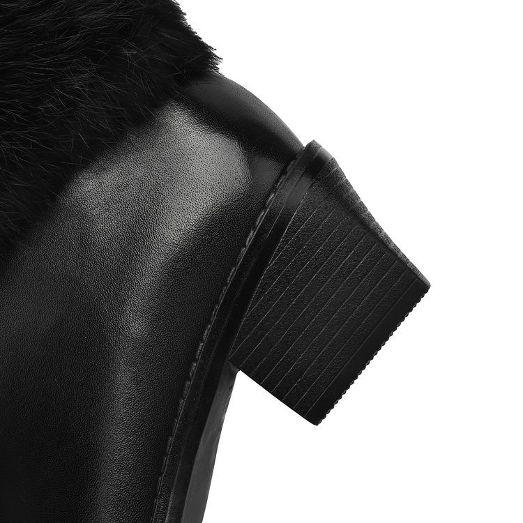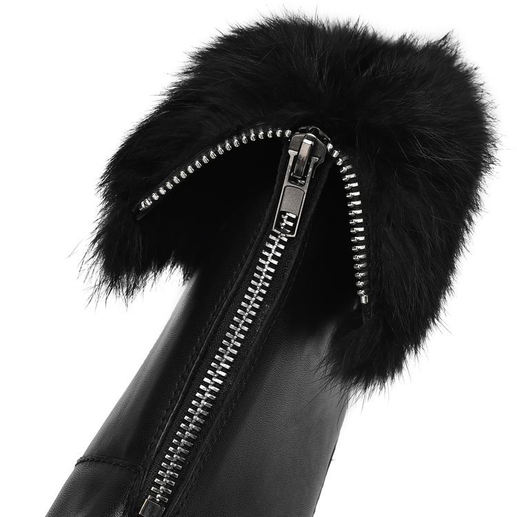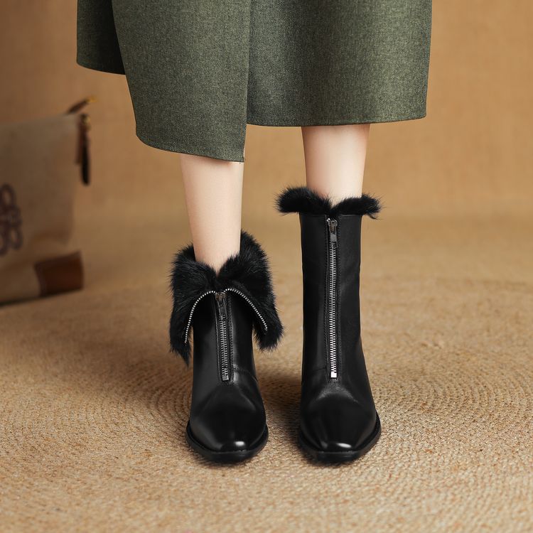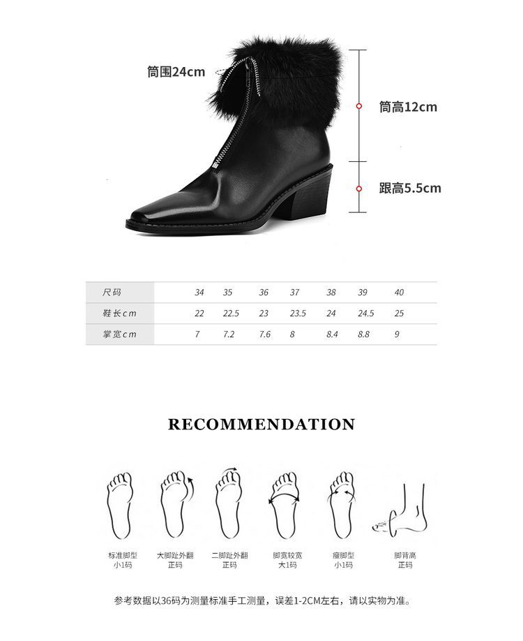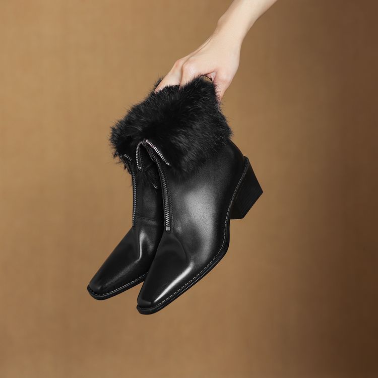 두꺼운 토끼 마오 마오 마오 내부 따뜻한 발목 부츠 여성의 2024 새로운 겨울 Cowhide 스퀘어 발가락 패션 부츠 두꺼운 힐 미드 힐 코튼 부츠스토어 가기