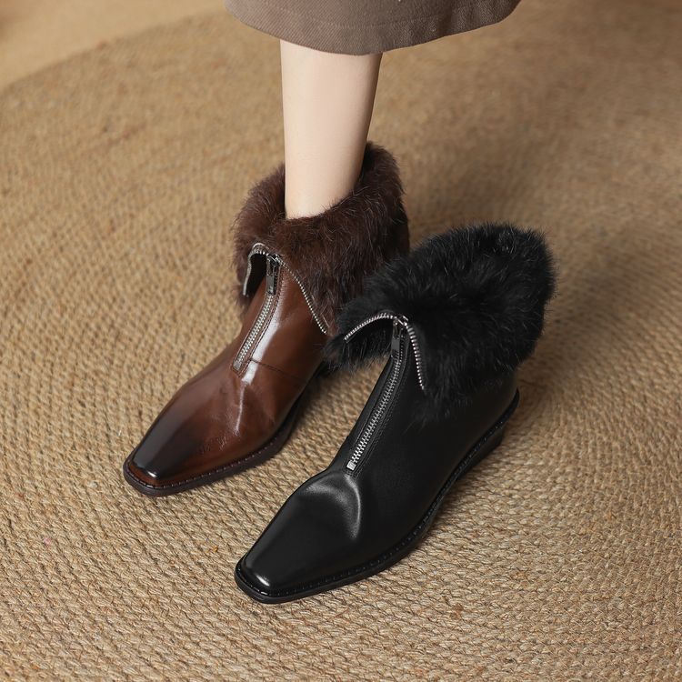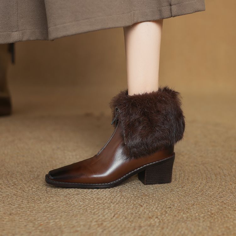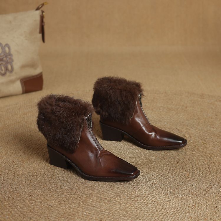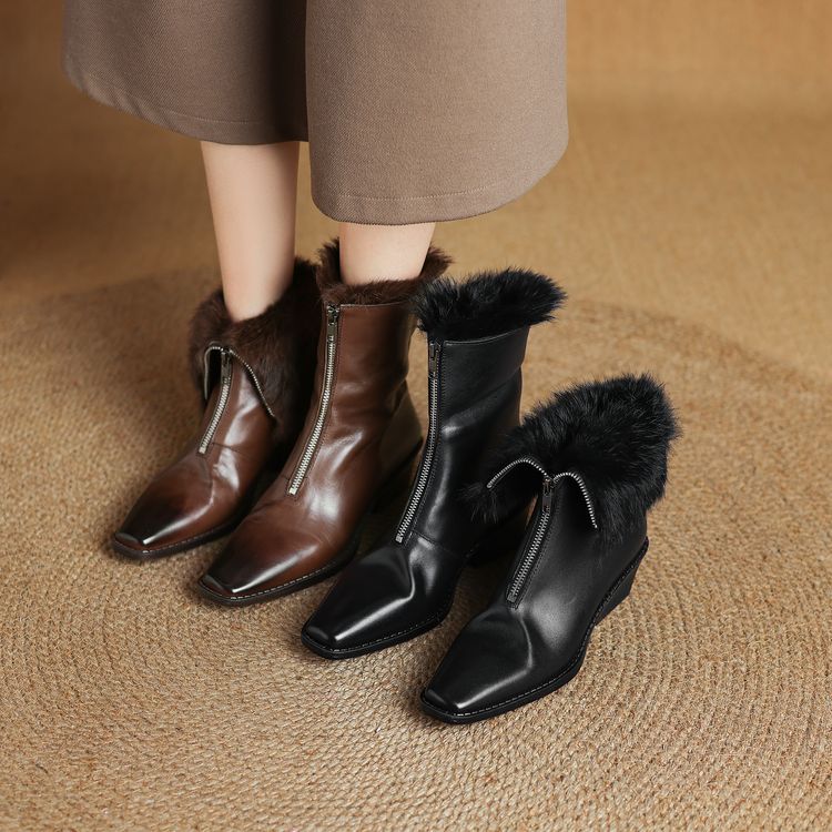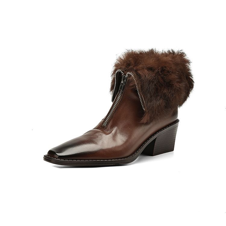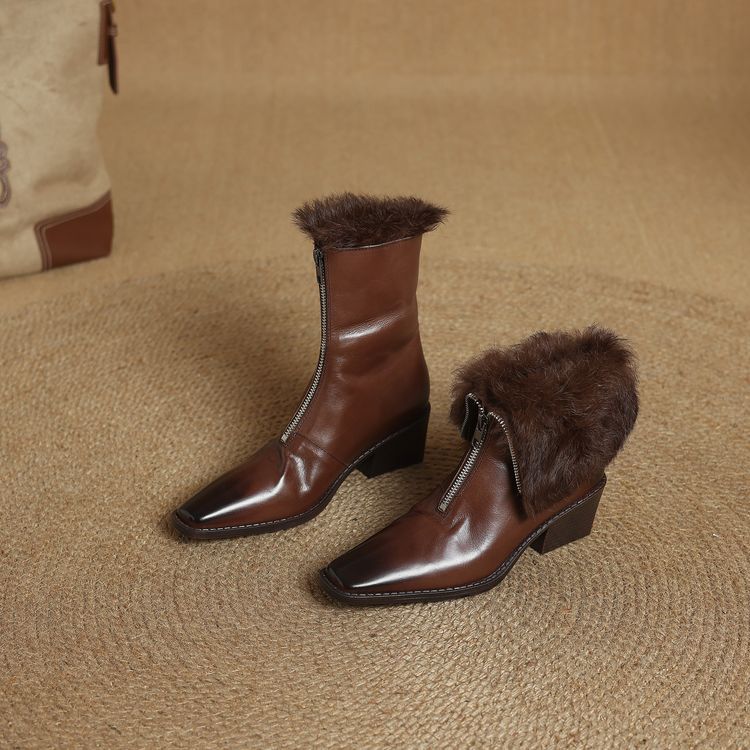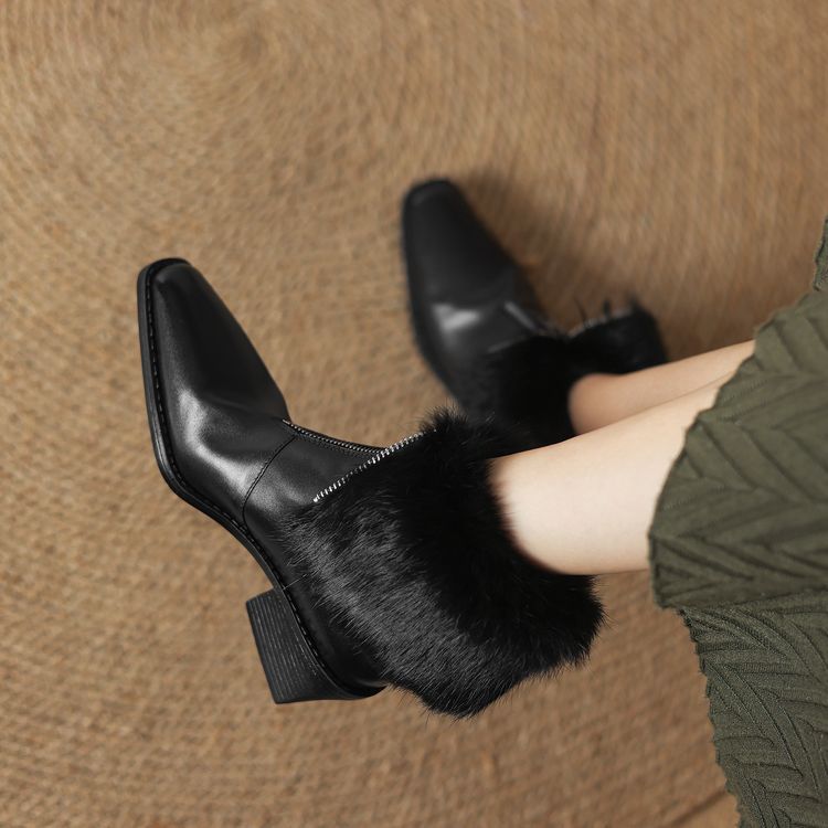 두꺼운 토끼 마오 마오 마오 내부 따뜻한 발목 부츠 여성의 2024 새로운 겨울 Cowhide 스퀘어 발가락 패션 부츠 두꺼운 힐 미드 힐 코튼 부츠
