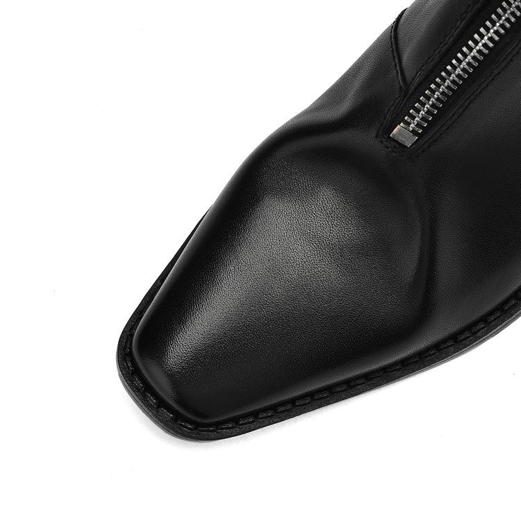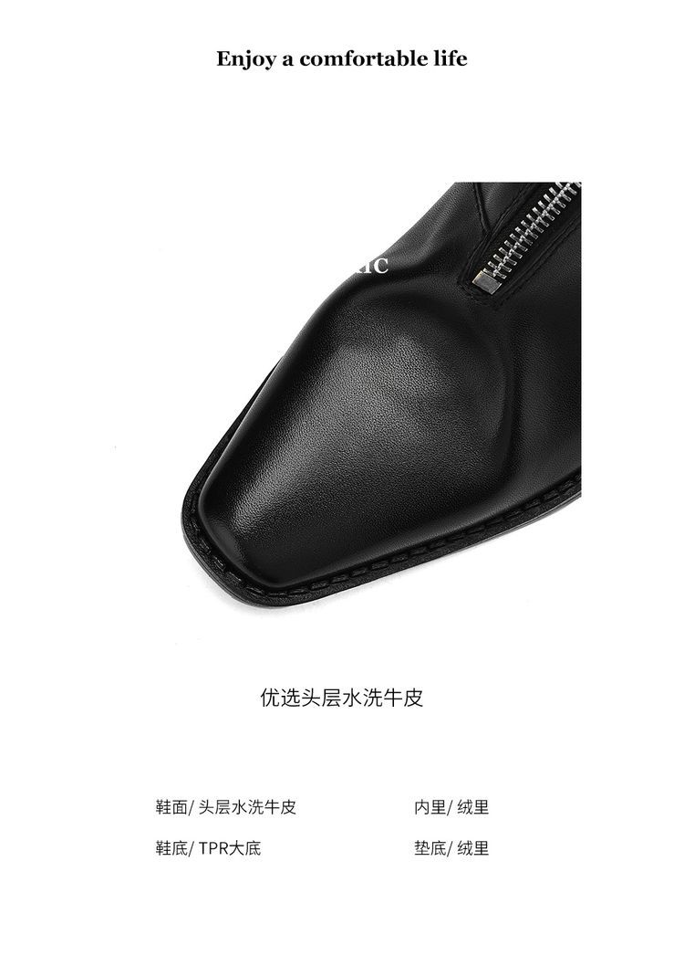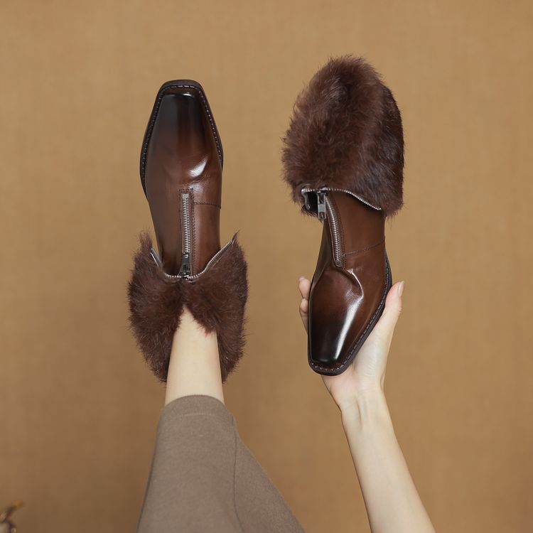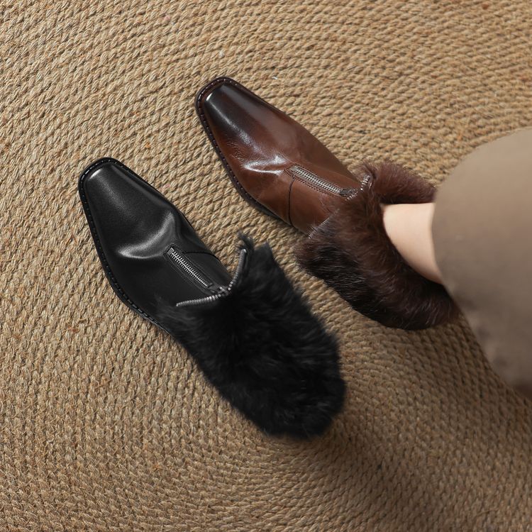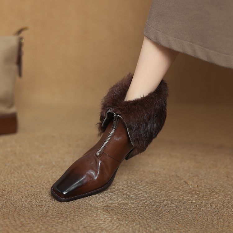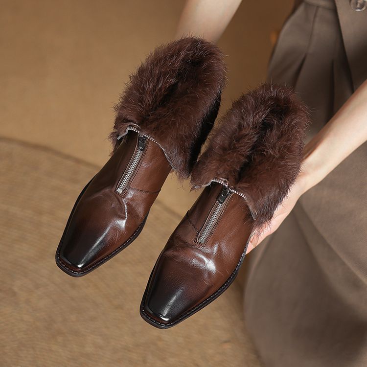 두꺼운 토끼 마오 마오 마오 내부 따뜻한 발목 부츠 여성의 2024 새로운 겨울 Cowhide 스퀘어 발가락 패션 부츠 두꺼운 힐 미드 힐 코튼 부츠