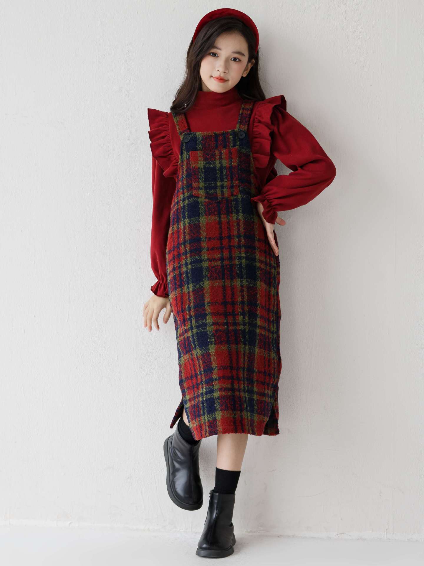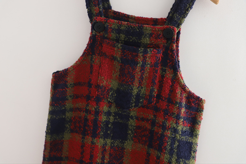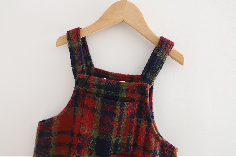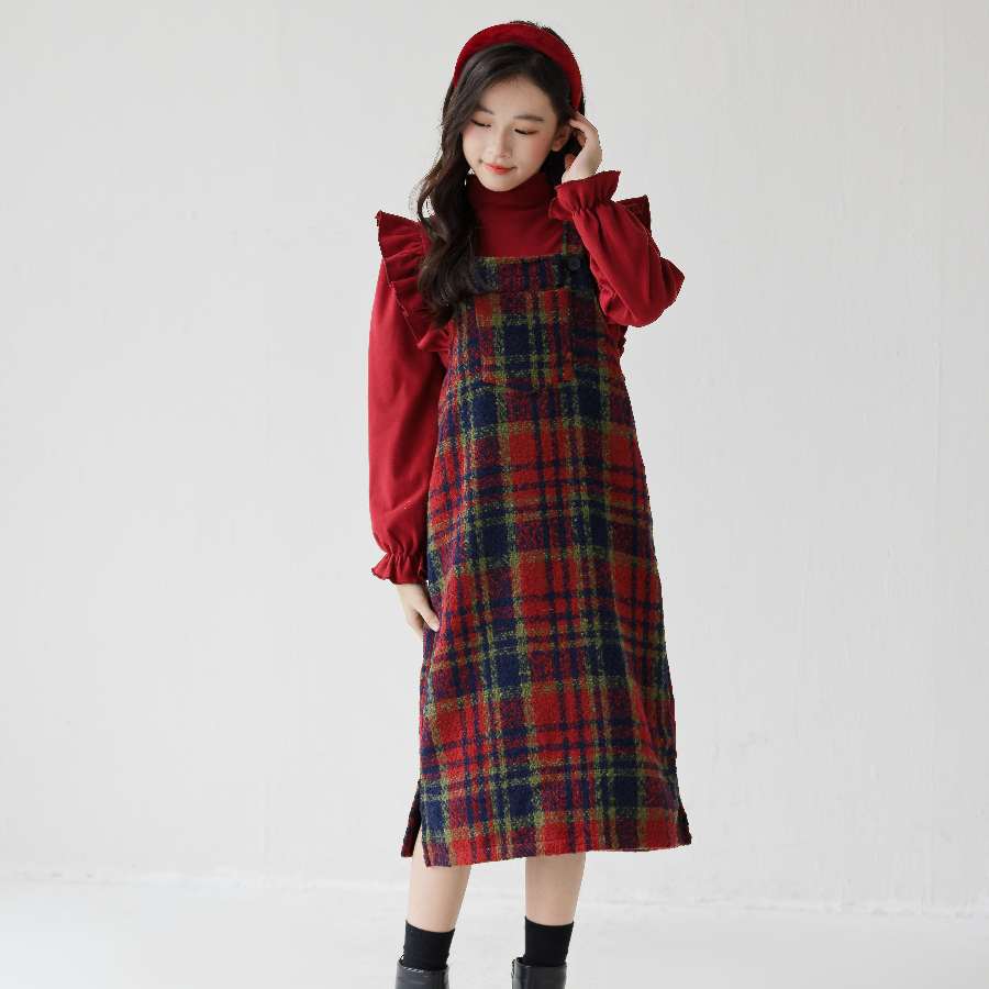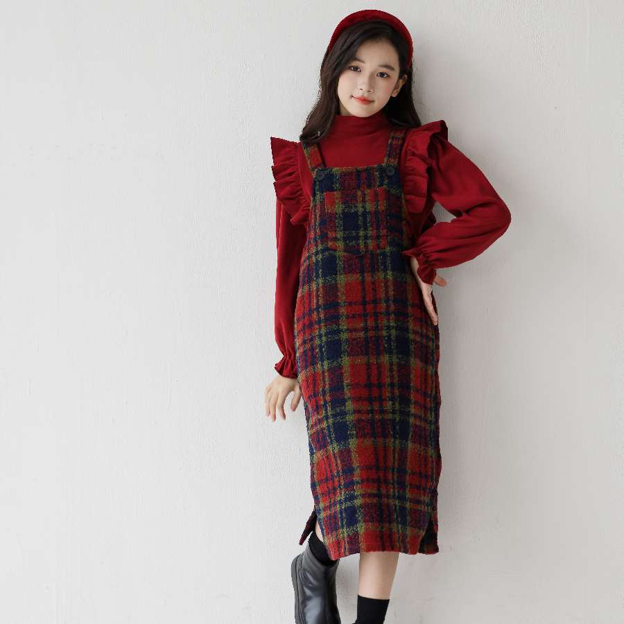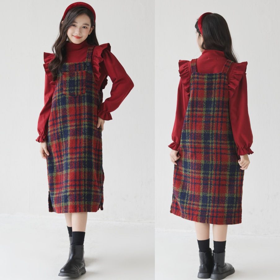 2026 여아 가을 겨울 세트, 연잎 프린트 베이스 셔츠, 레트로 체크무늬 미디 기장 멜빵 스커트, 크리스마스 및 새해 세트스토어 가기