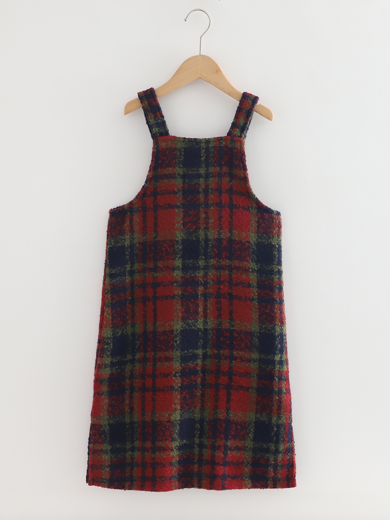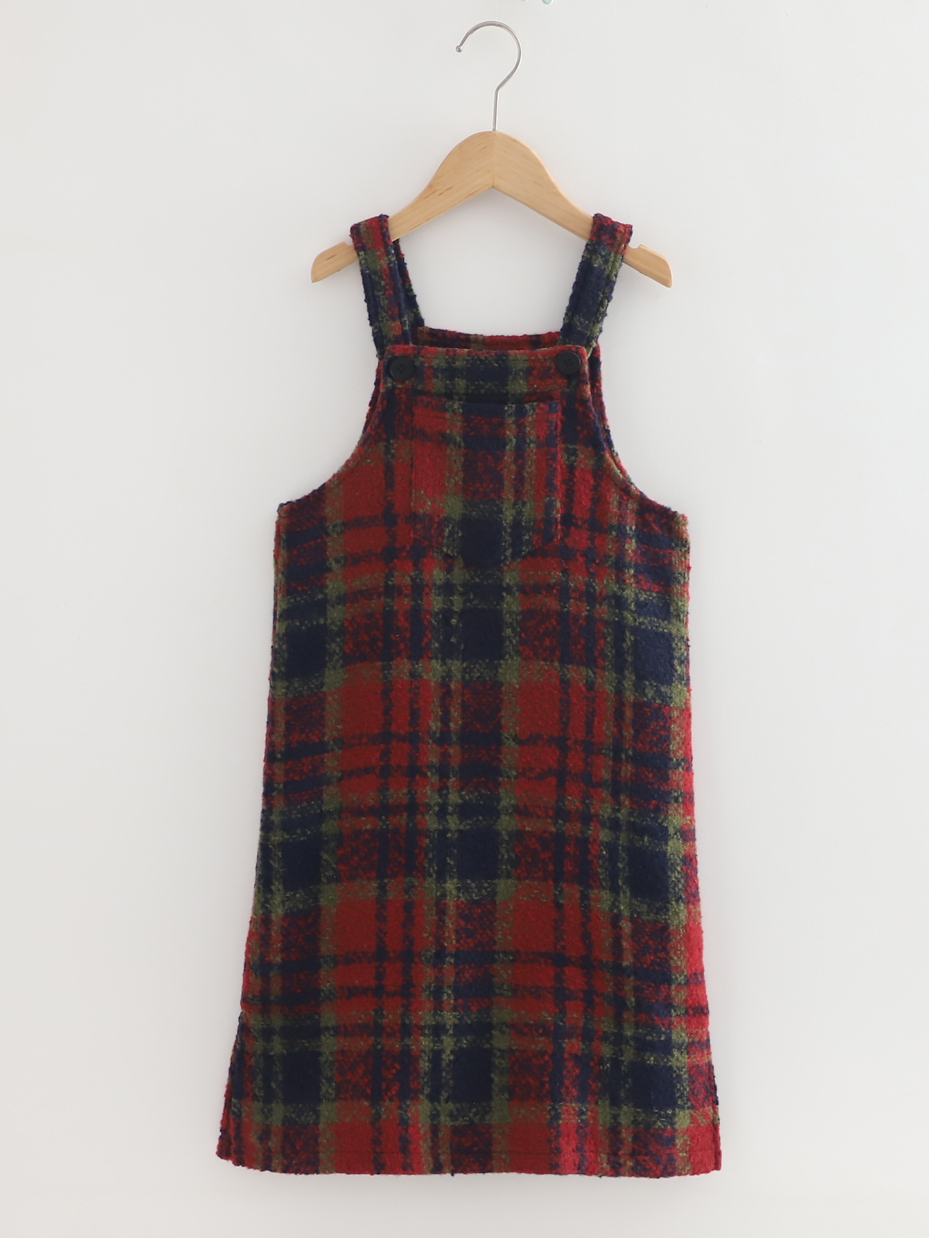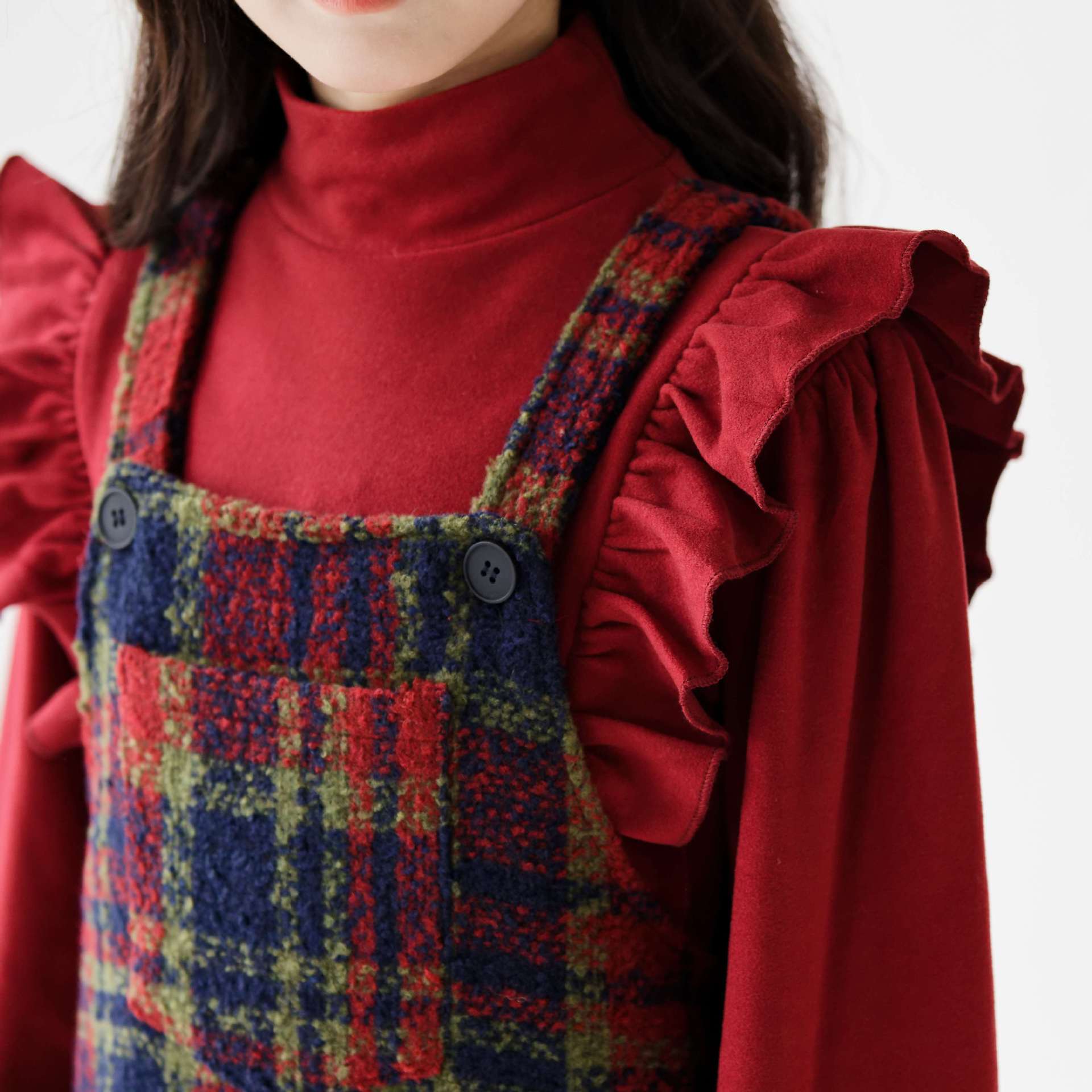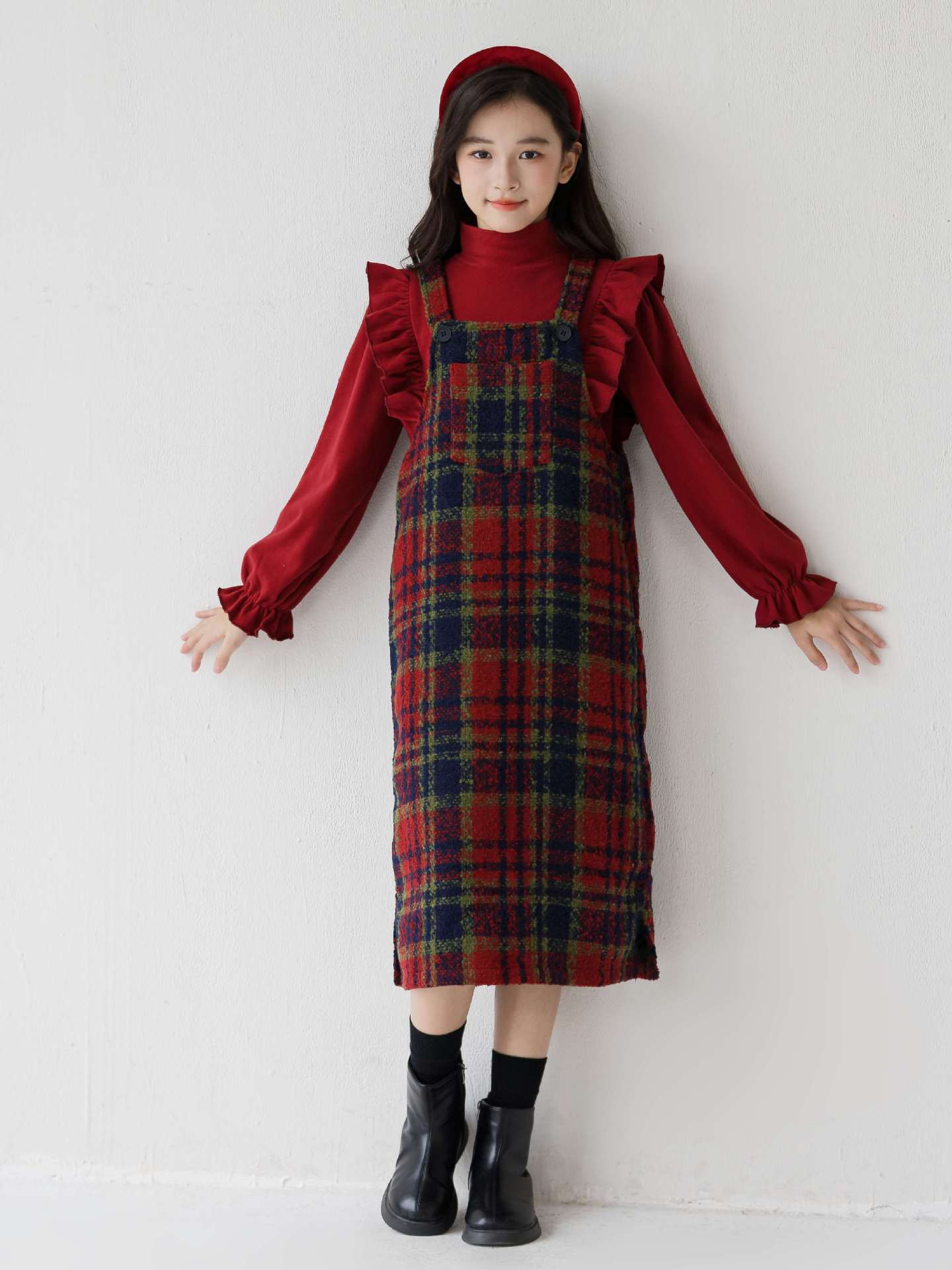2026 여아 가을 겨울 세트, 연잎 프린트 베이스 셔츠, 레트로 체크무늬 미디 기장 멜빵 스커트, 크리스마스 및 새해 세트스토어 가기