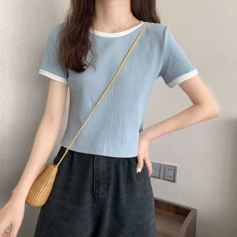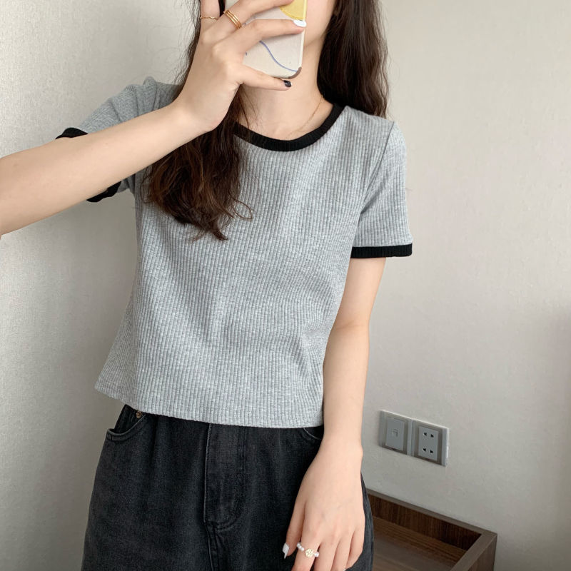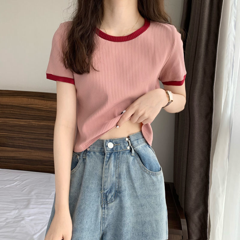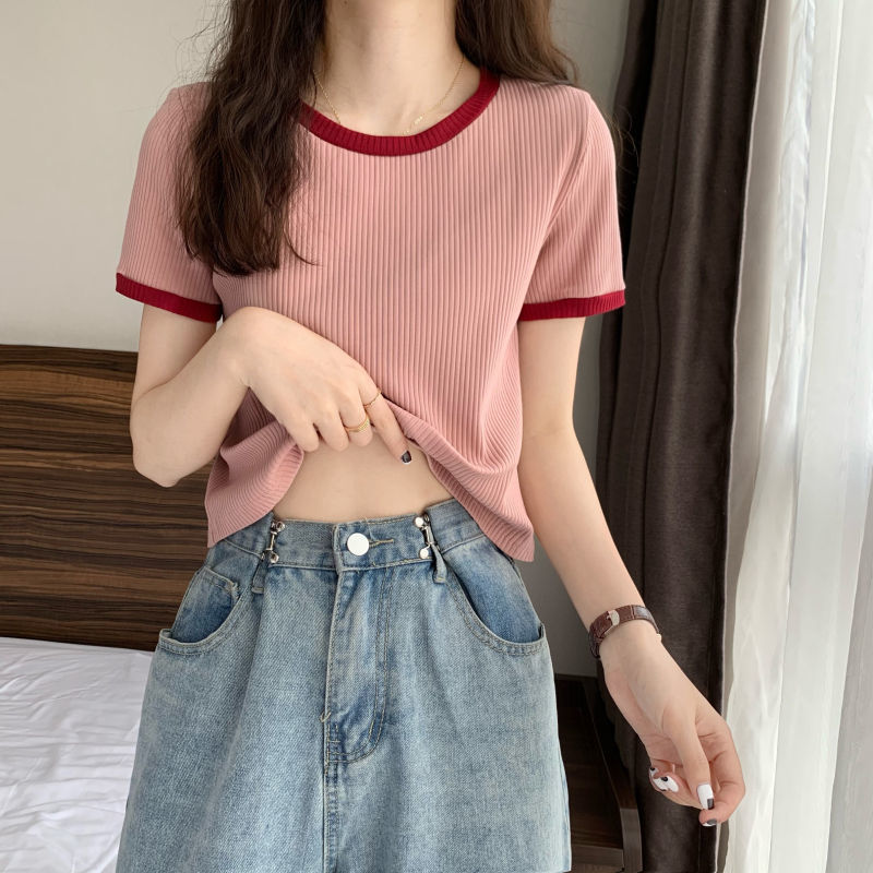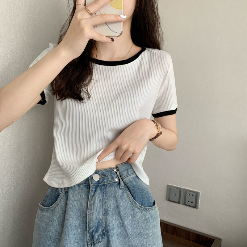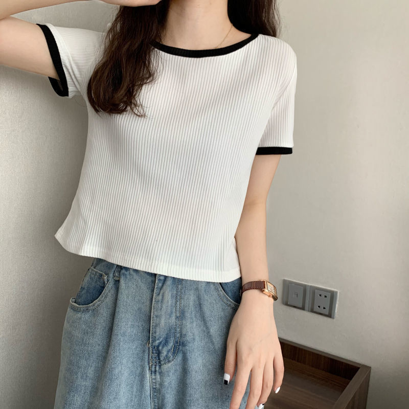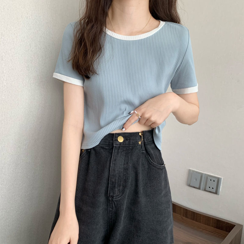 아이스 실크 라운드 넥 반팔 티셔츠 여성 여름 새로운 슬림 핏 심플한 패셔너블 슬림 핏 명암 컬러 모양의 올 매치 탑 Ins 트렌디