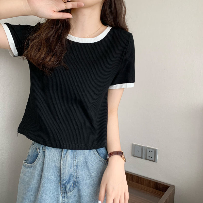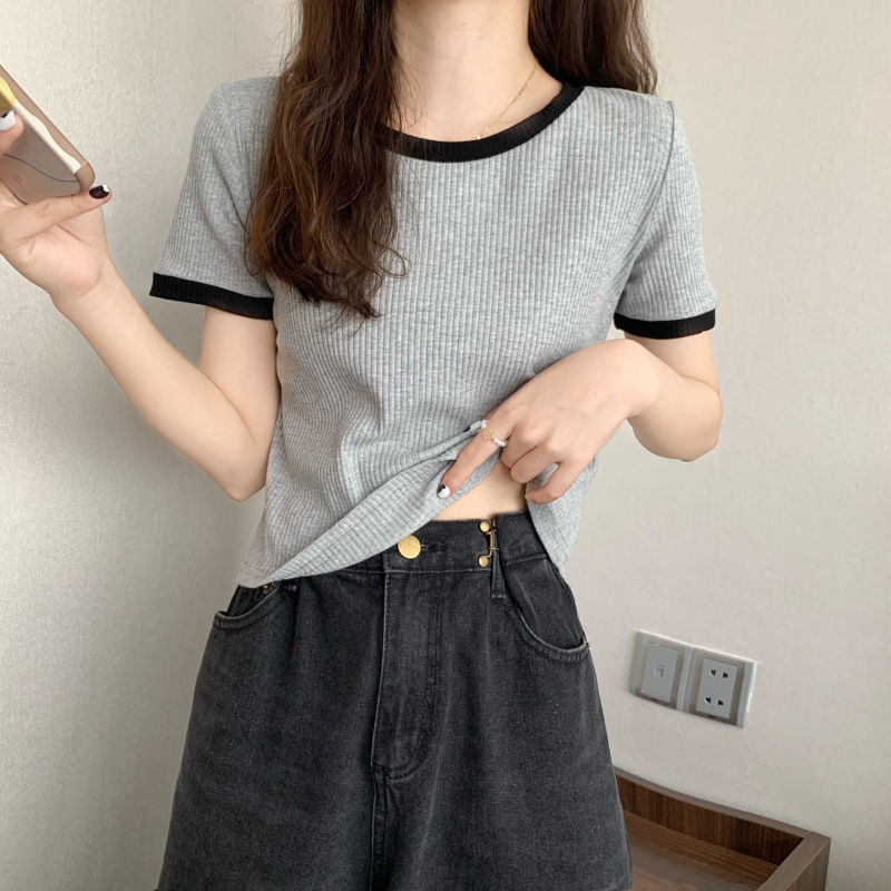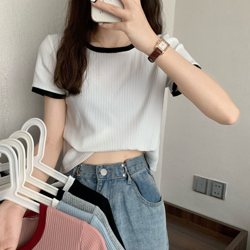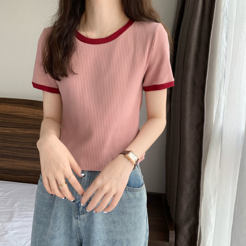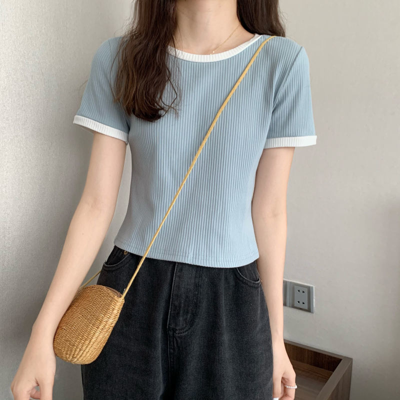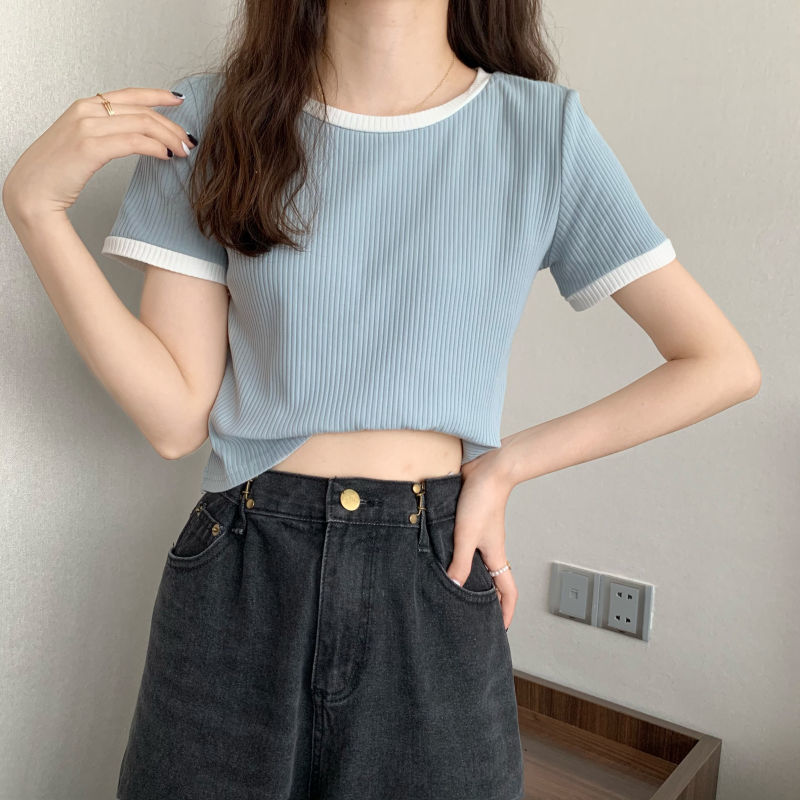 아이스 실크 라운드 넥 반팔 티셔츠 여성 여름 새로운 슬림 핏 심플한 패셔너블 슬림 핏 명암 컬러 모양의 올 매치 탑 Ins 트렌디