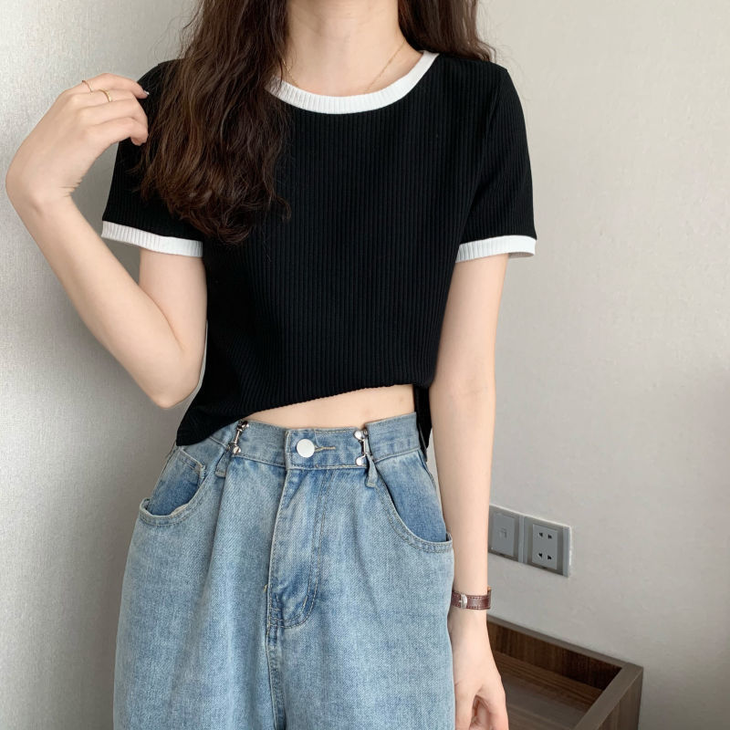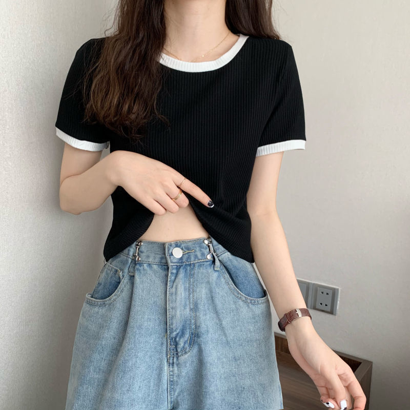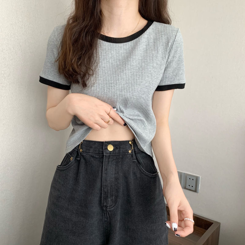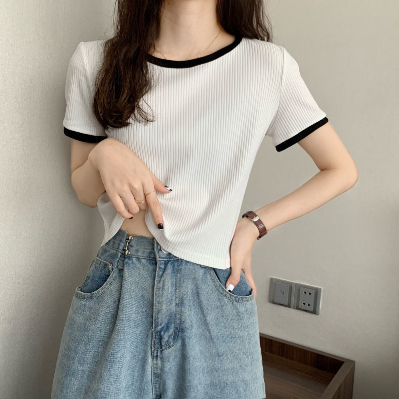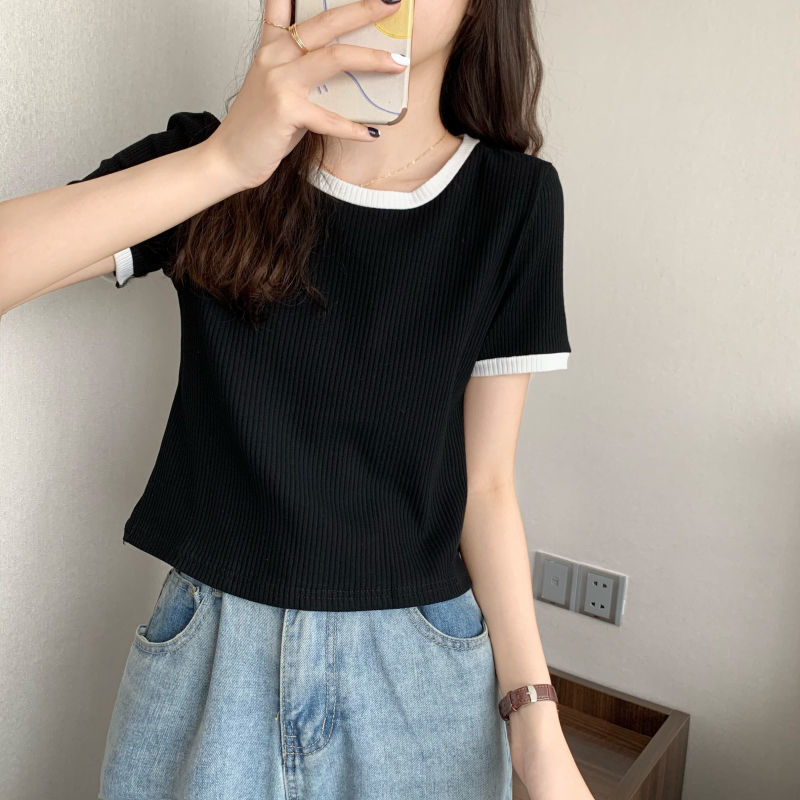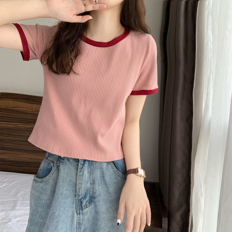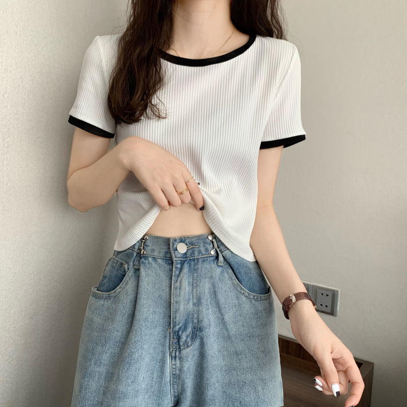 아이스 실크 라운드 넥 반팔 티셔츠 여성 여름 새로운 슬림 핏 심플한 패셔너블 슬림 핏 명암 컬러 모양의 올 매치 탑 Ins 트렌디