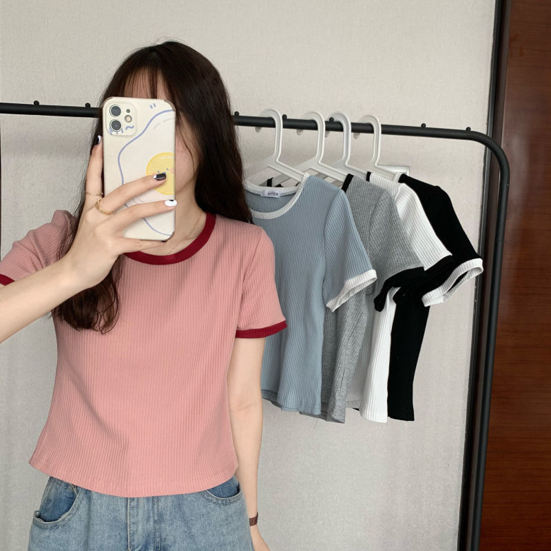 아이스 실크 라운드 넥 반팔 티셔츠 여성 여름 새로운 슬림 핏 심플한 패셔너블 슬림 핏 명암 컬러 모양의 올 매치 탑 Ins 트렌디스토어 가기