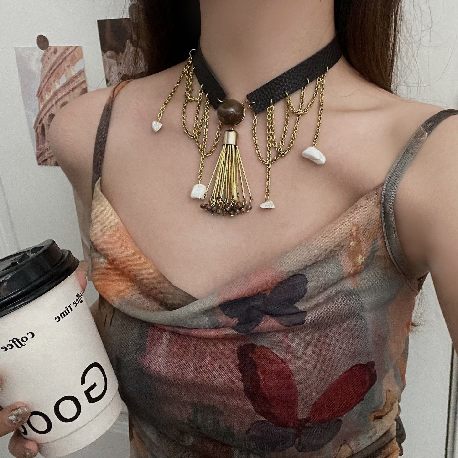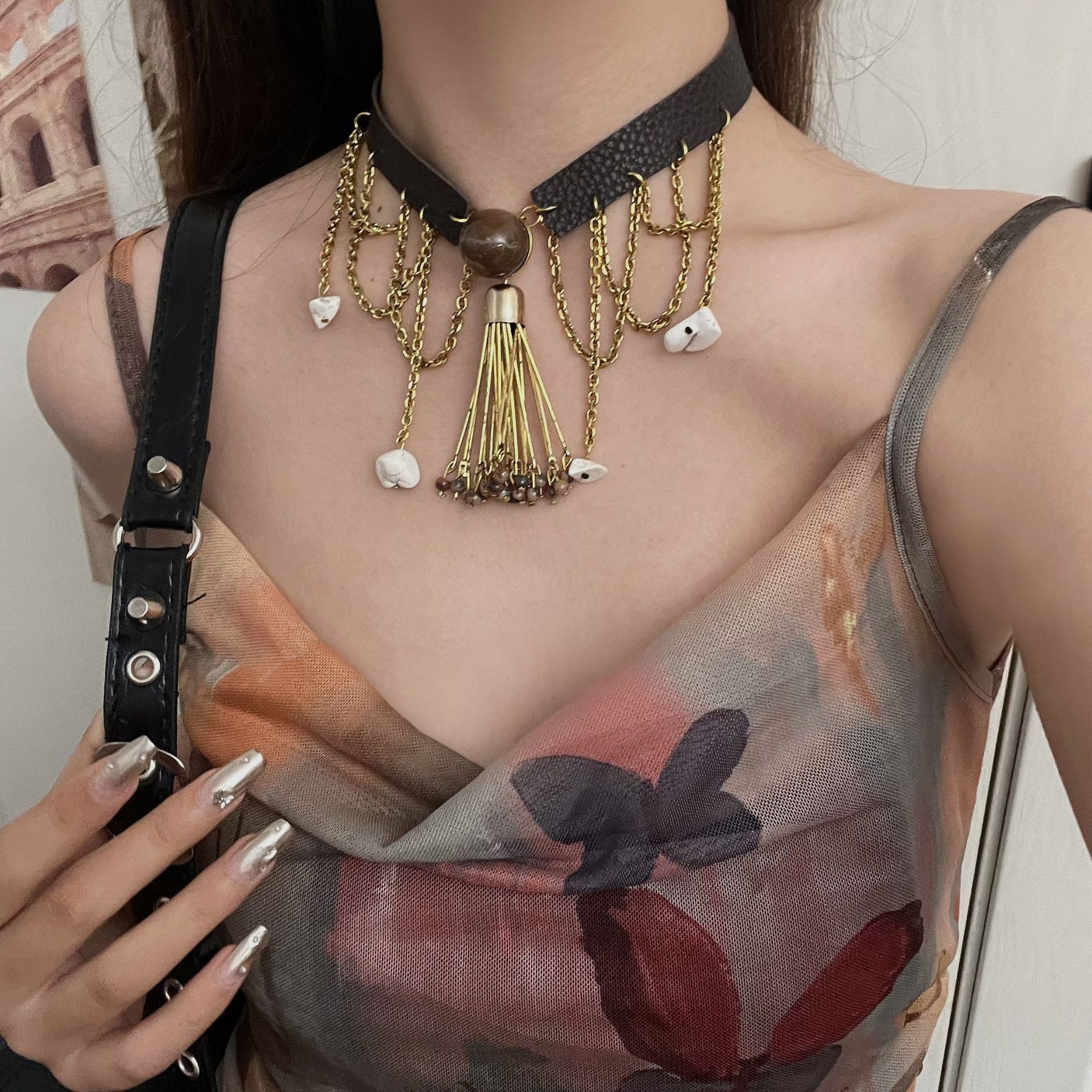 중공업 레트로 오래 된 가죽 술 칼라 목걸이 틈새 디자인 센스 폐기물 지구 스타일 펑크 초커 쇄골 체인