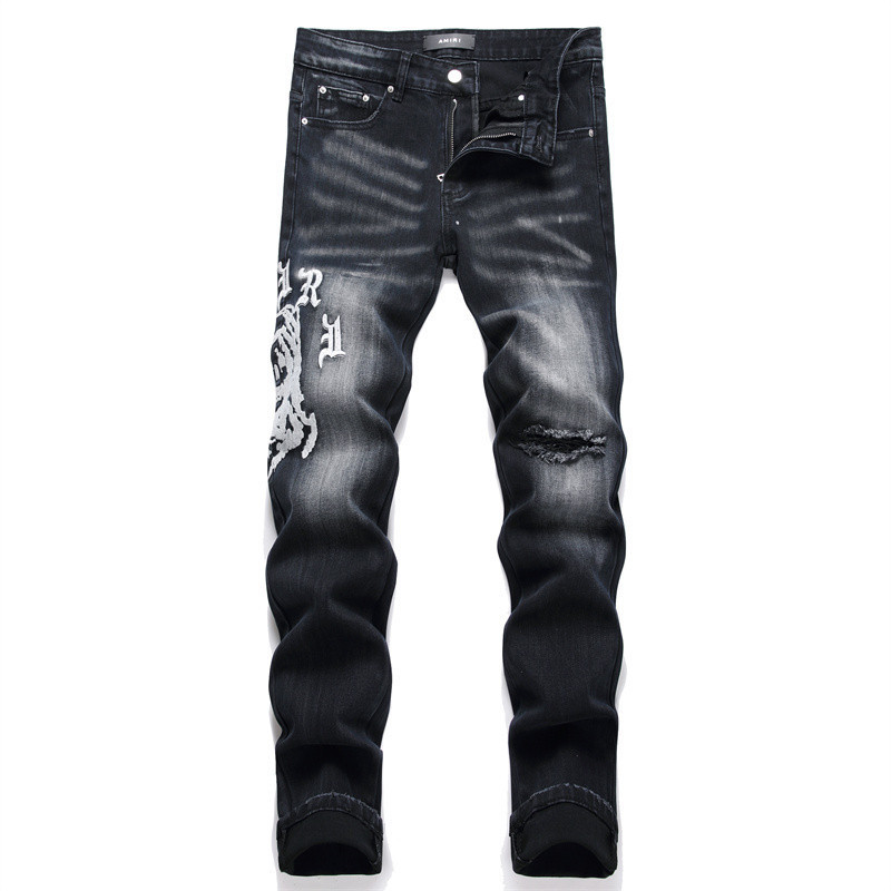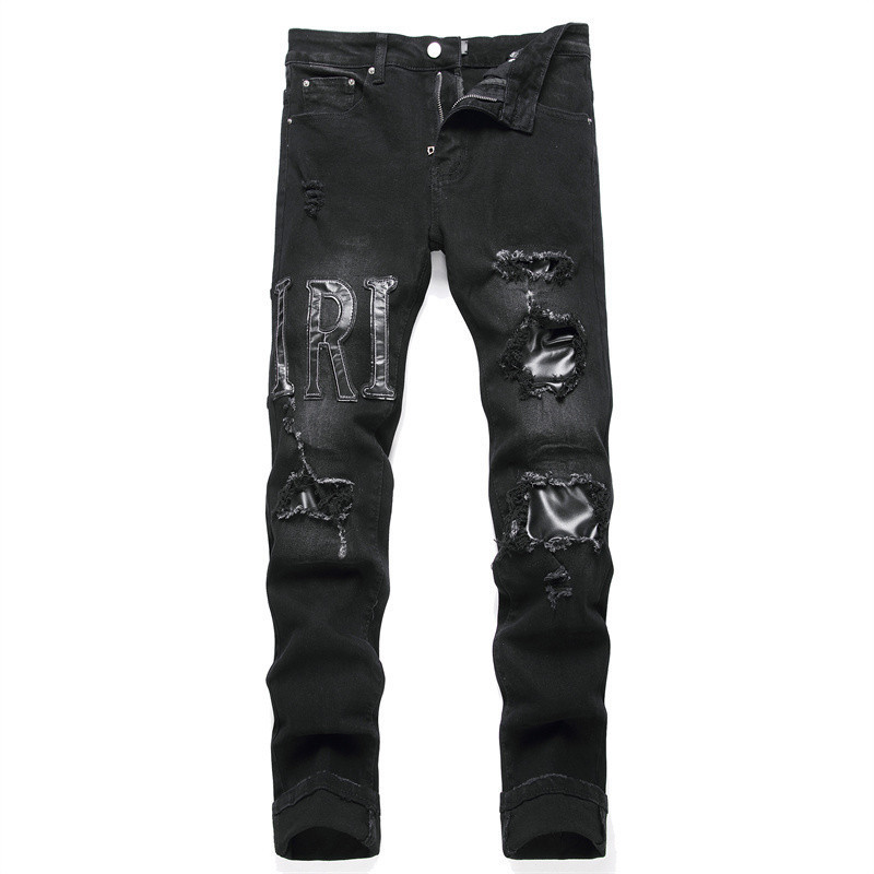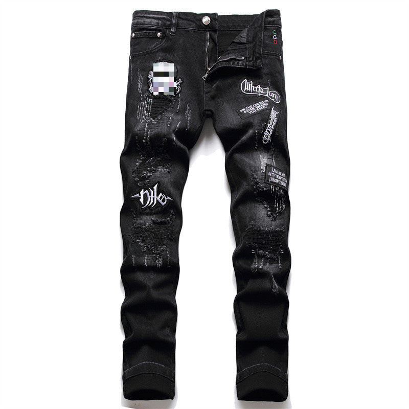 가을 새로운 하이 스트리트 남성용 찢어진 청바지 자수 크로스 인 타이트 미드 웨이스트 남성용 트렌디 한 캐주얼 블랙 팬츠