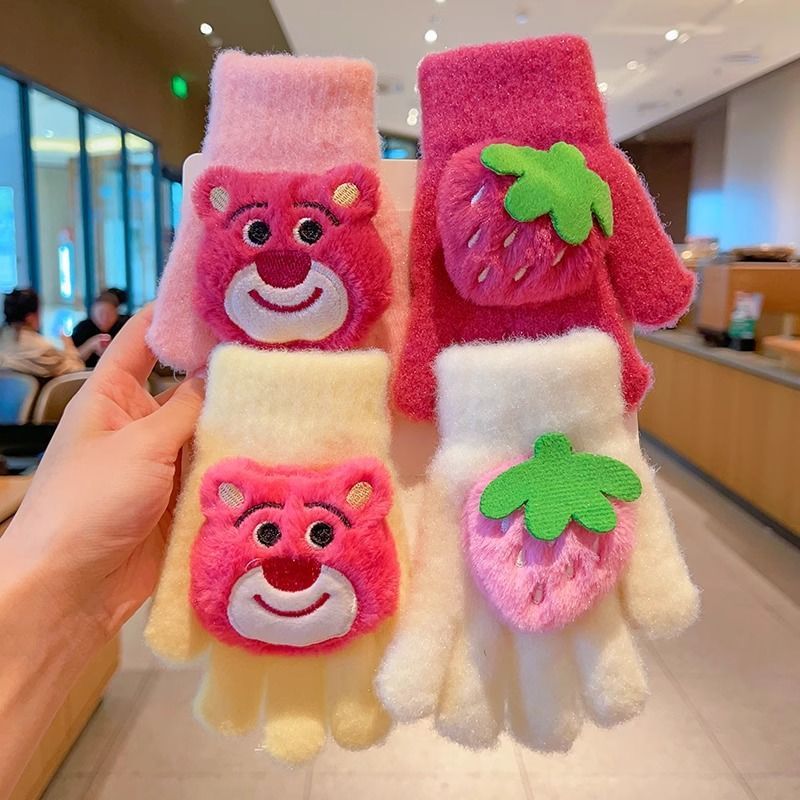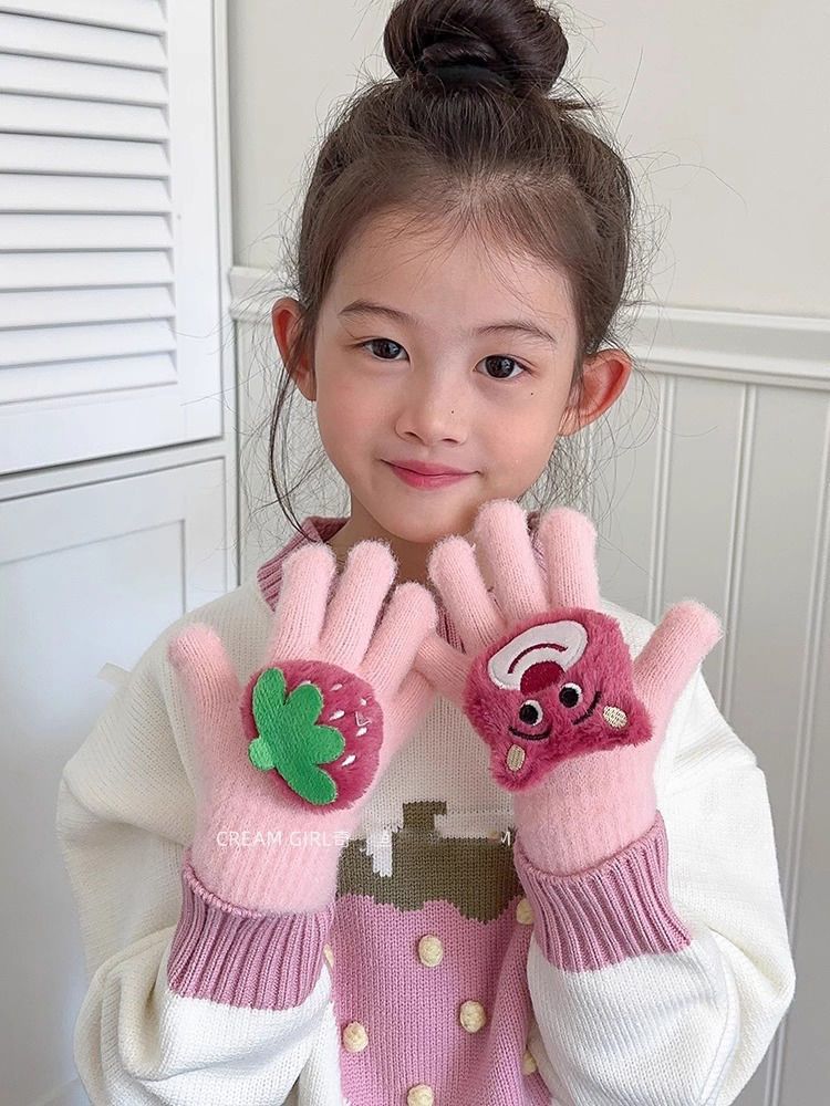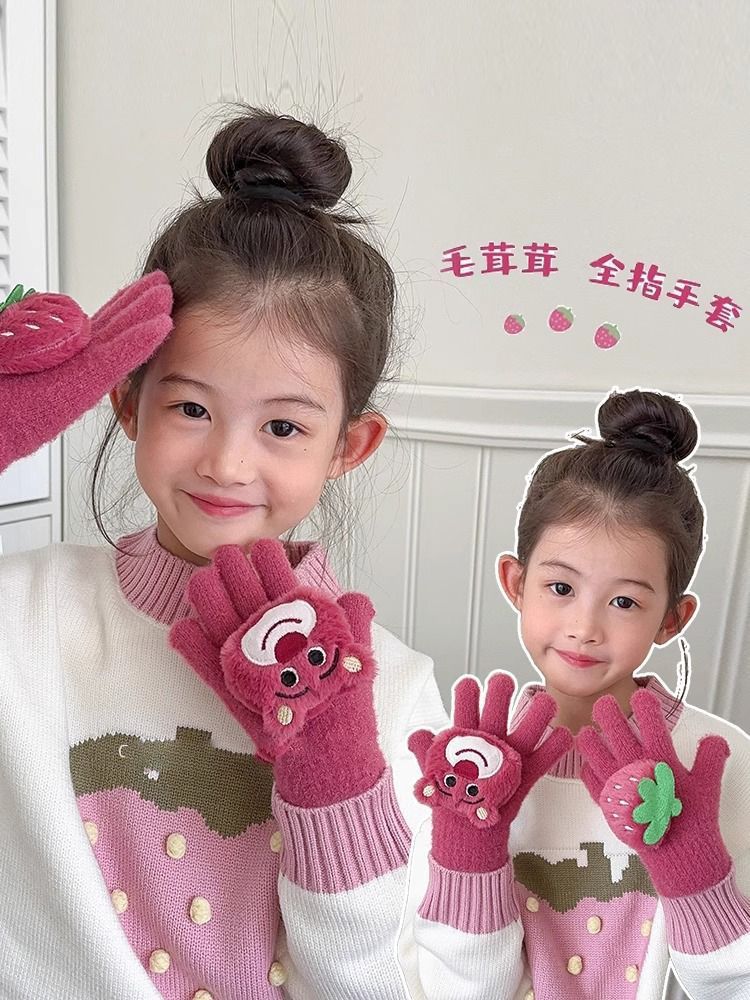 어린이 장갑 만화 귀여운 딸기 곰 장갑 소녀 두꺼운 다섯 손가락 장갑 겨울 중간 아이 따뜻한 손가락 세트