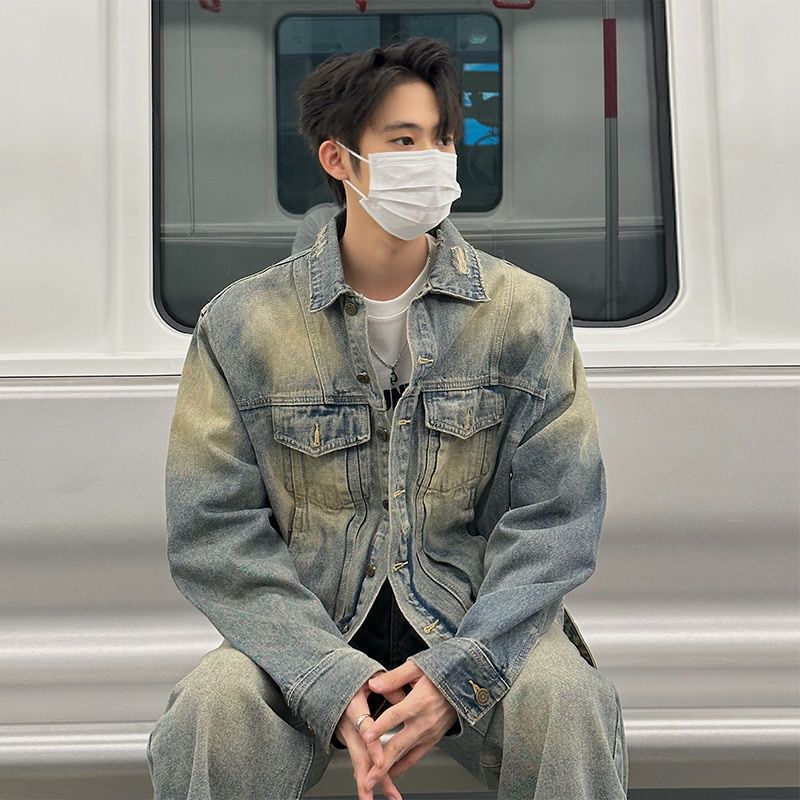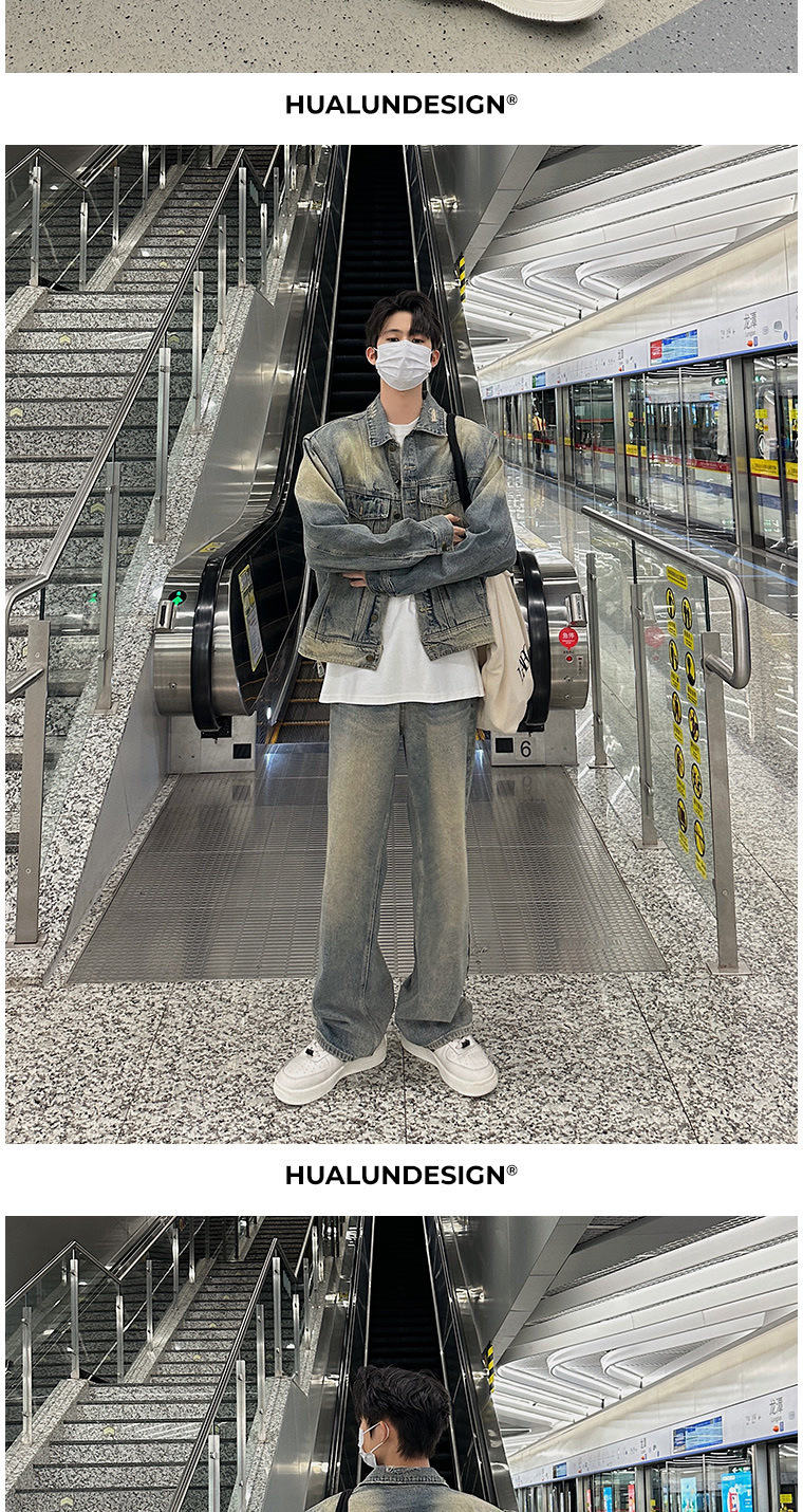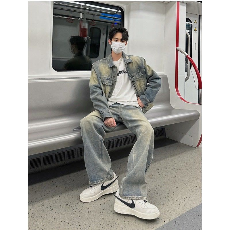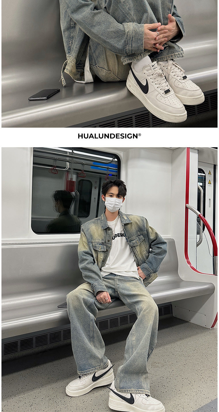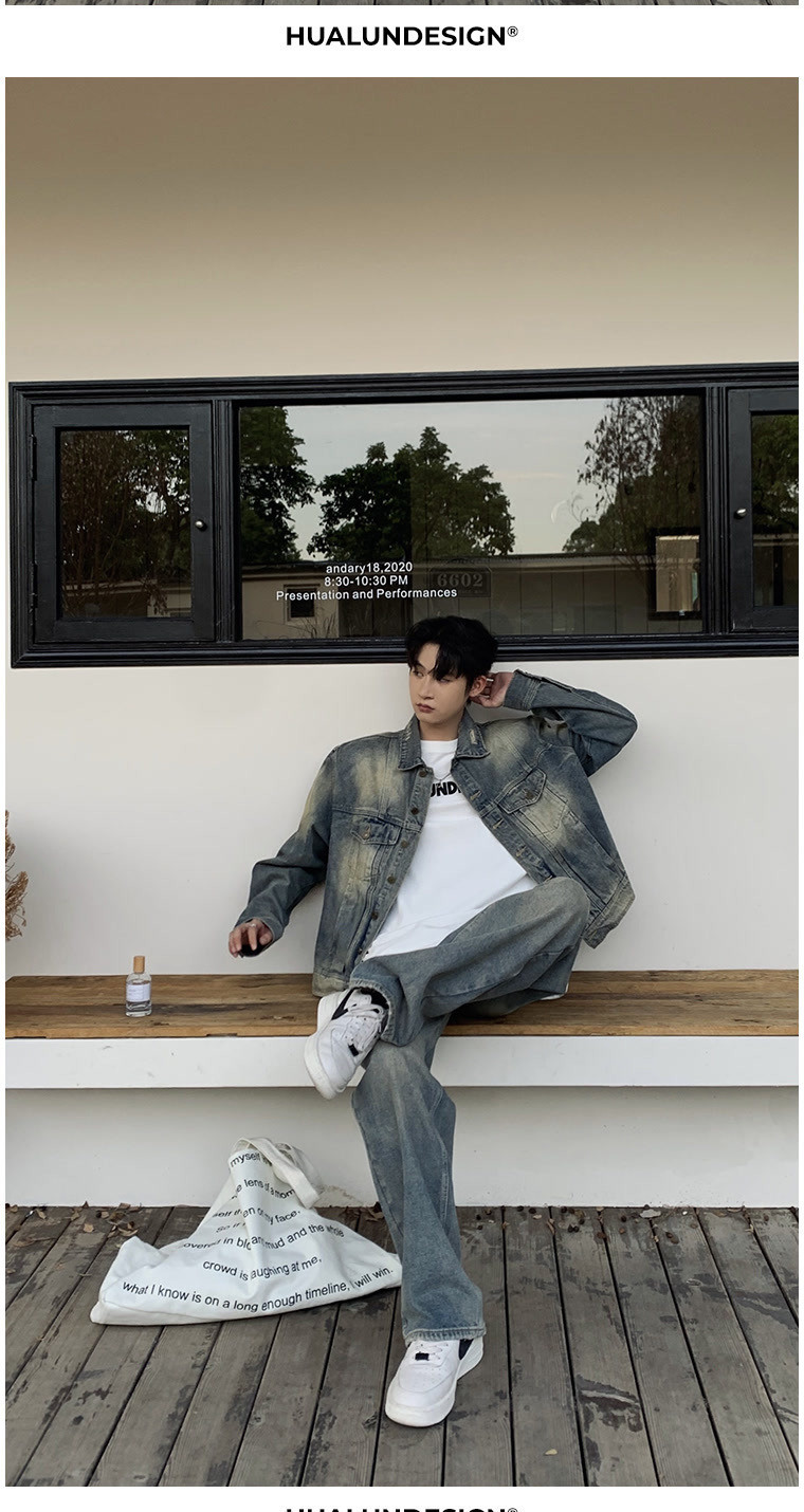 가을 조수 브랜드 복고풍 데님 세트 남성용 러피 잘 생긴 빈티지 홍콩 스타일 남성 재킷 코트 조수 세트스토어 가기