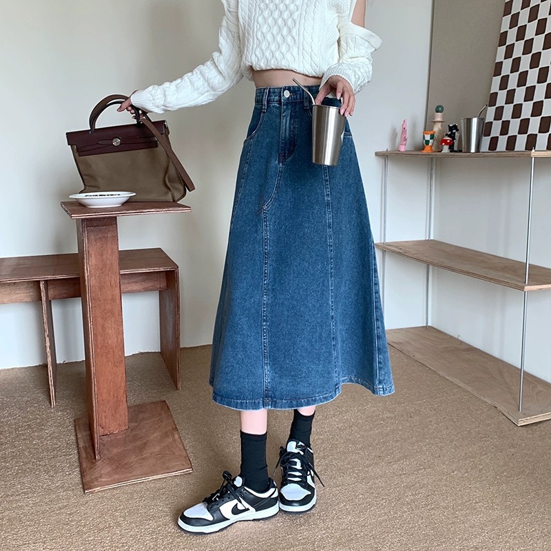 디자인 감각 스티칭 데님 스커트 A 라인 우산 스커트 봄 한국어 버전 2024 새로운 높은 허리 슬리밍 스커트 여성 의류스토어 가기