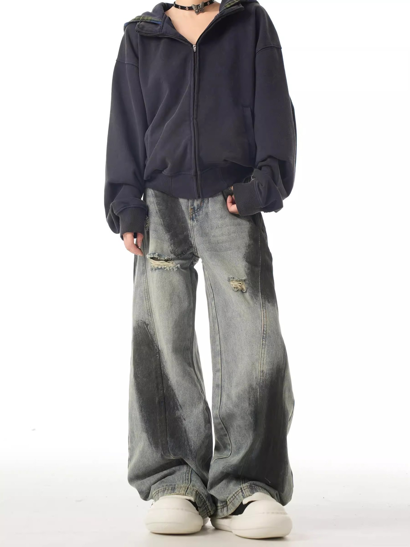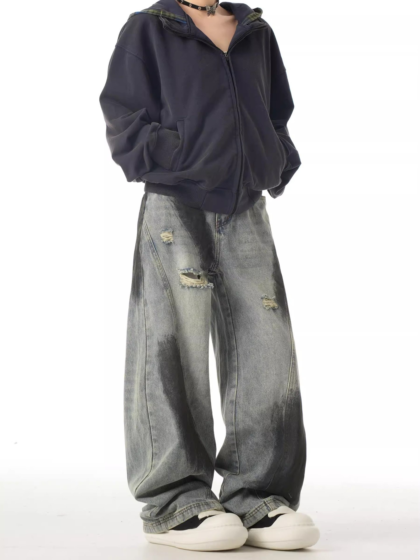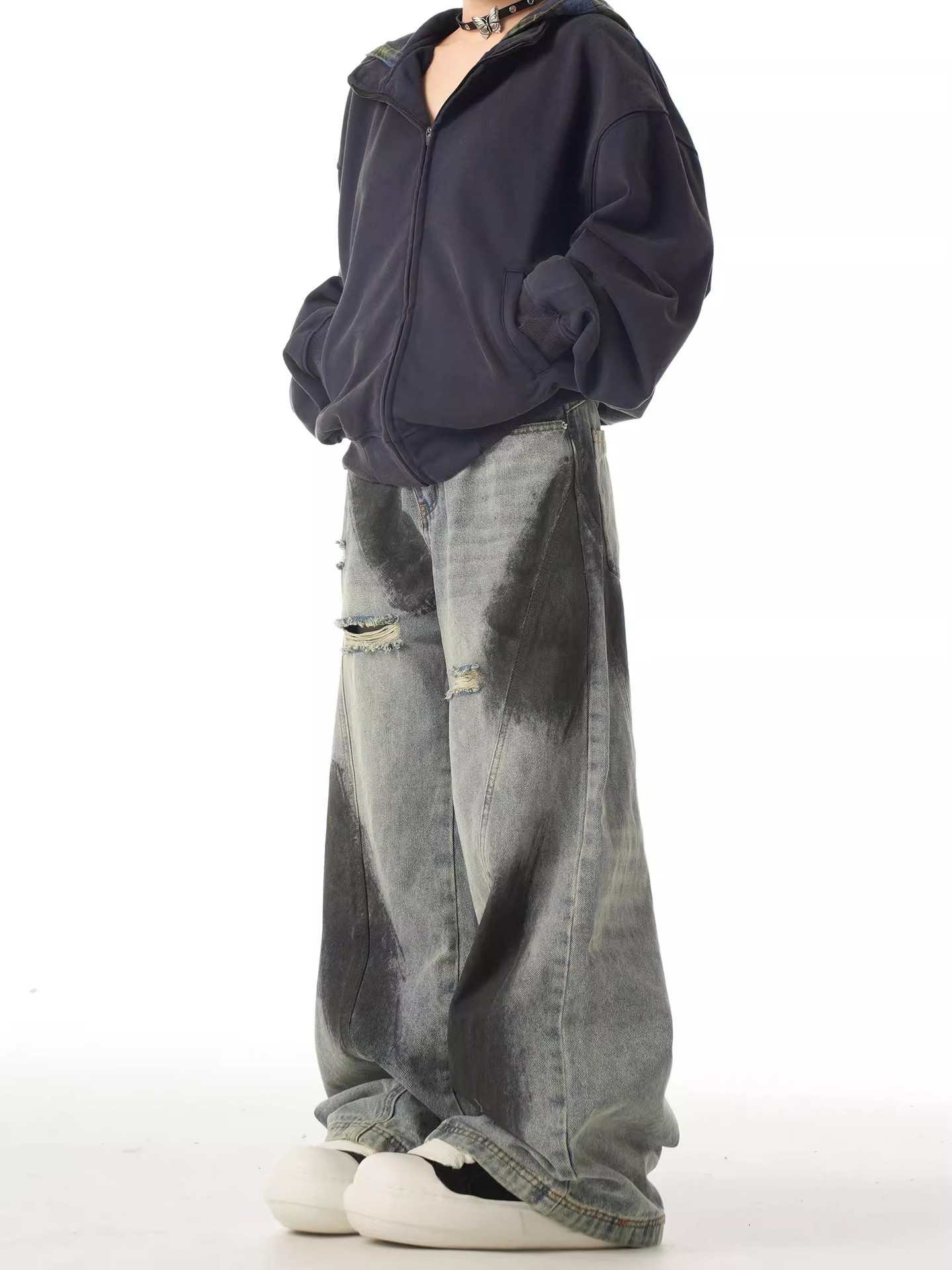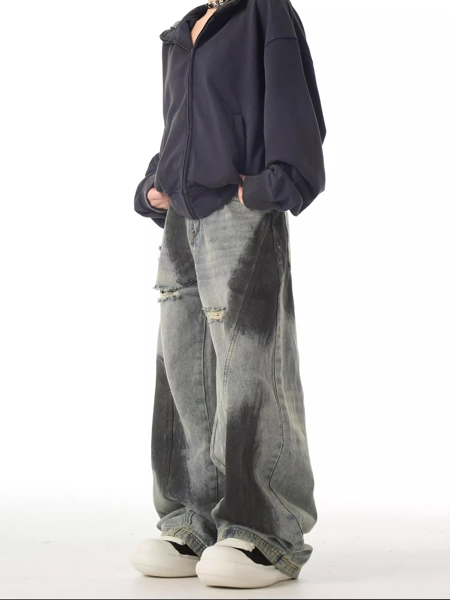 2024 미국식 하이 스트리트 바이브 스플래쉬 잉크 찢어진 청바지 유니섹스 루즈 해체 올매치 스트레이트 와이드 레그 롱 팬츠스토어 가기