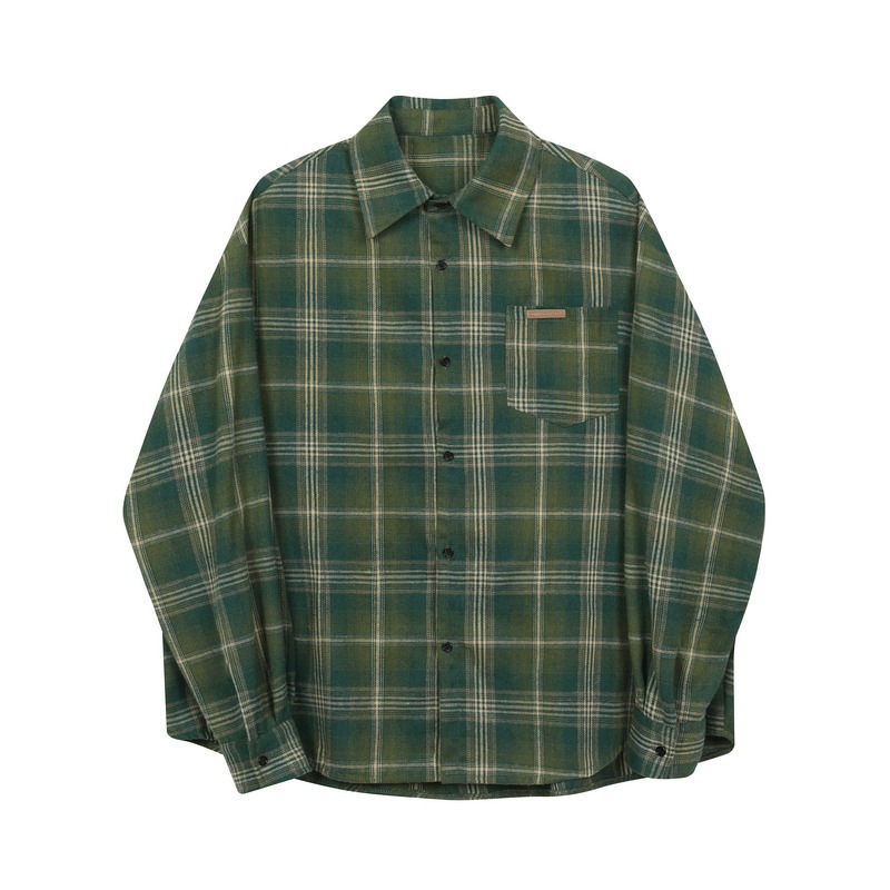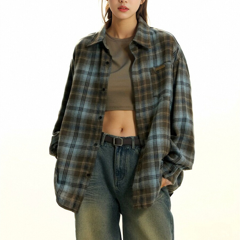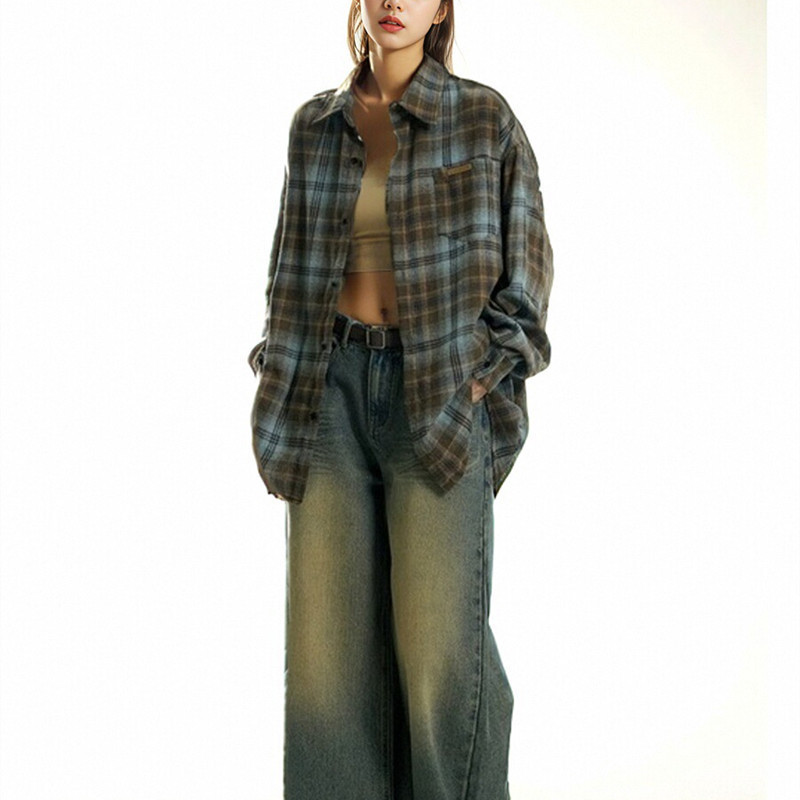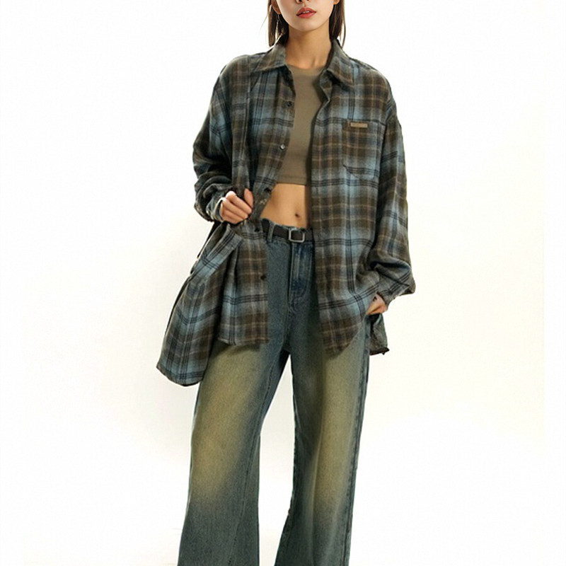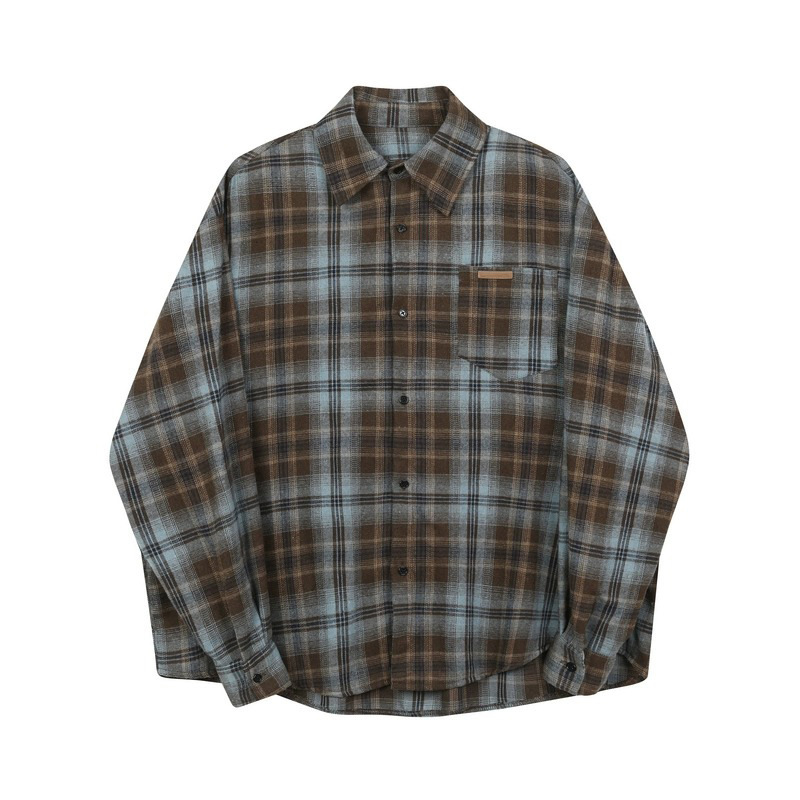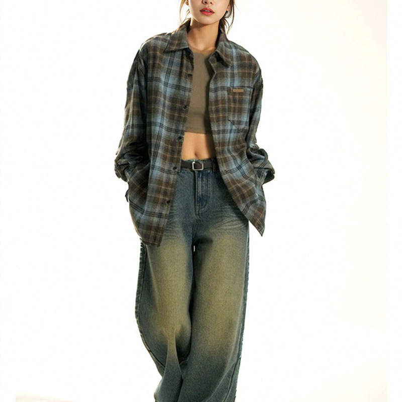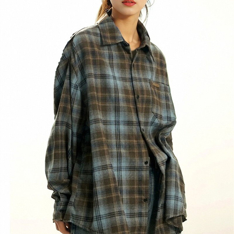 트렌디 한 브랜드 2 색 샌딩 플레이드 셔츠 남성과 여성을위한 봄 레트로 미국 루즈 캐주얼 긴팔 셔츠 커플 재킷