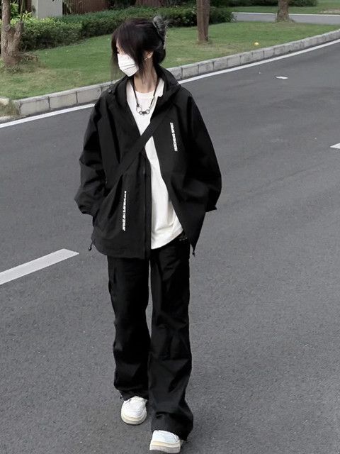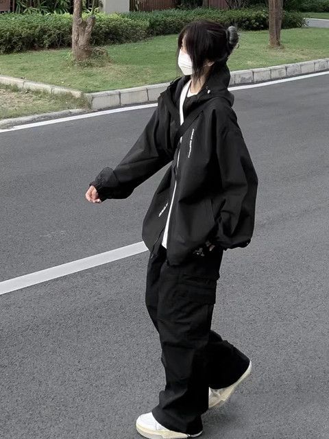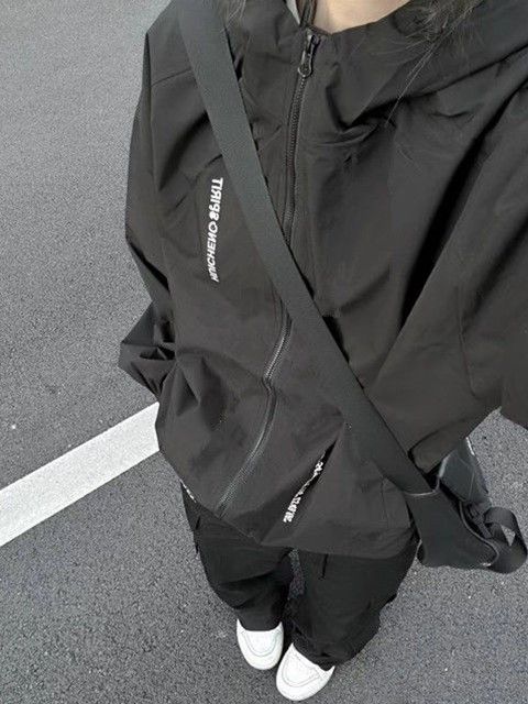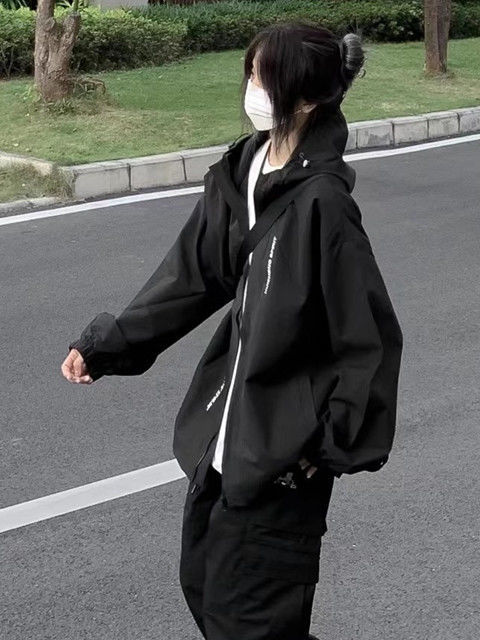 미국 스타일 기능성 스타일 블랙 재킷 코트 여성의 봄과 가을 새로운 문자는 느슨한 후드 자켓 Ins 트렌디를 인쇄했습니다.스토어 가기