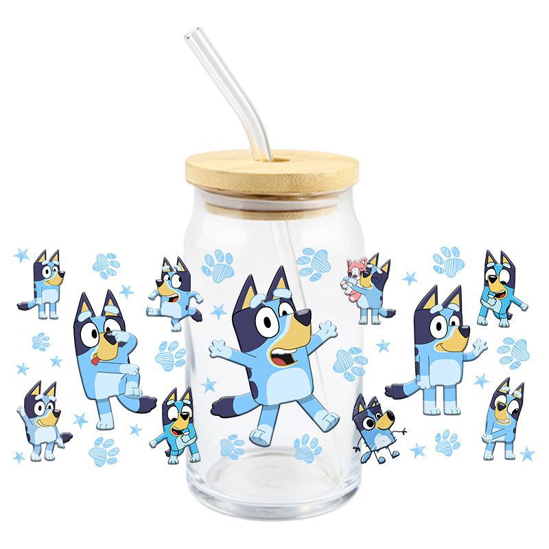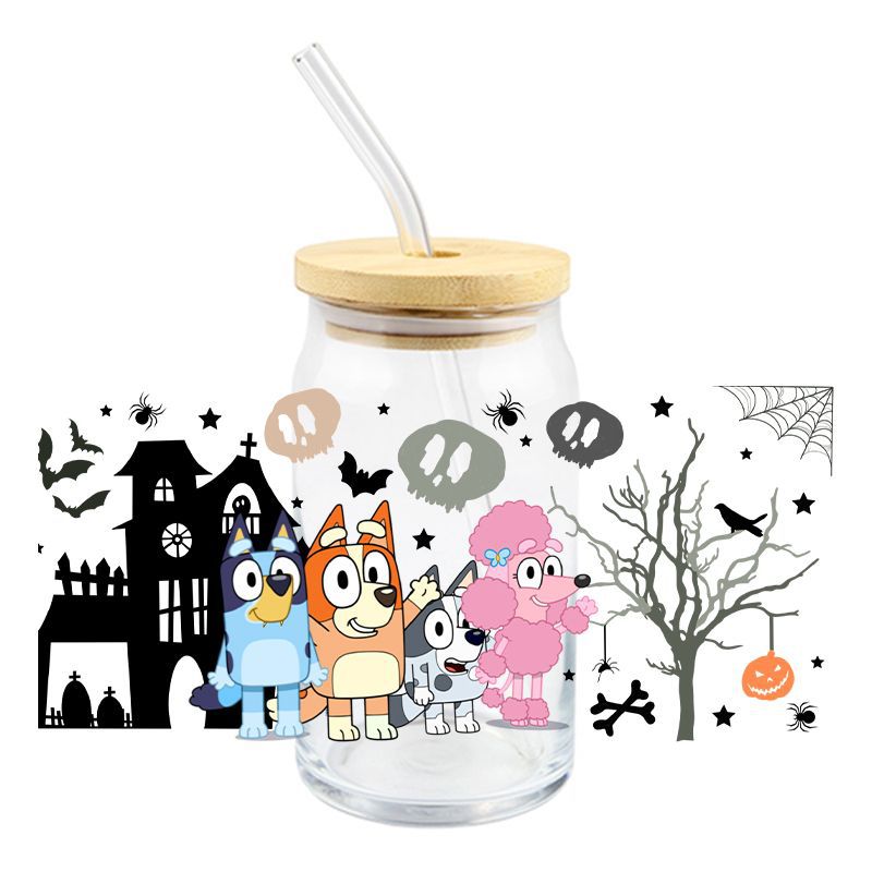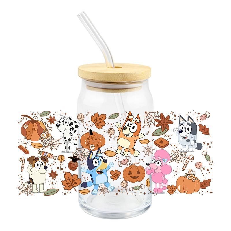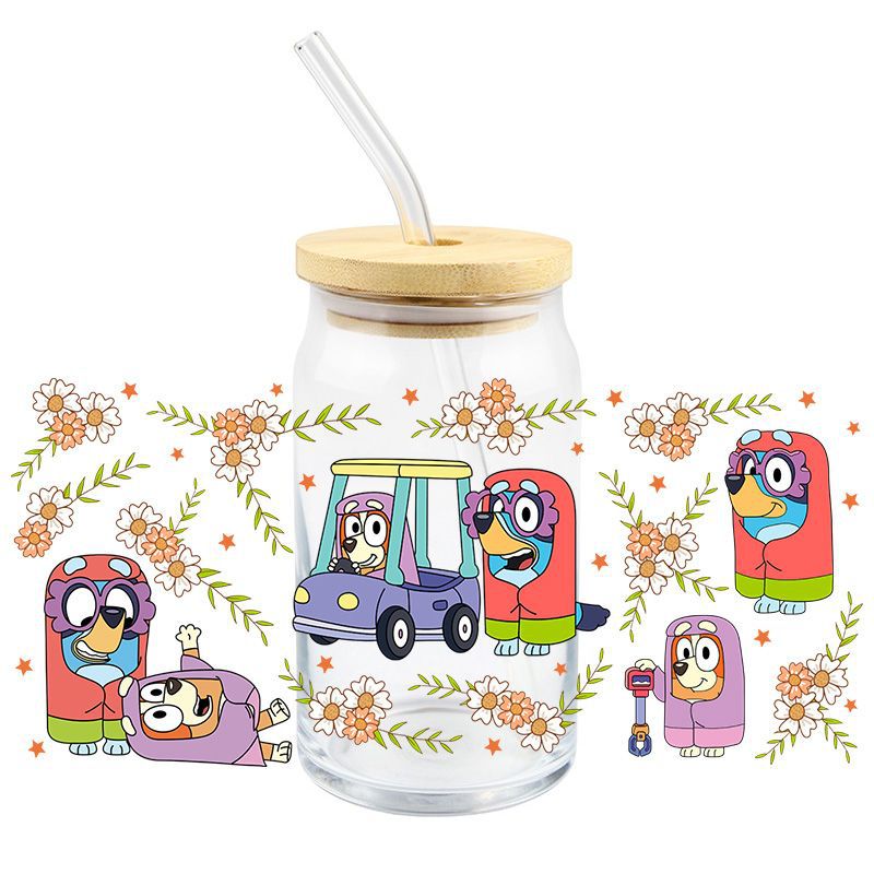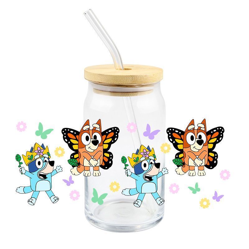 Brui UV DTF 크리스탈 투명 스티커 귀여운 만화 패턴 16 oz 유리 컵 방수 스크래치 방지 크로스 테두리스토어 가기