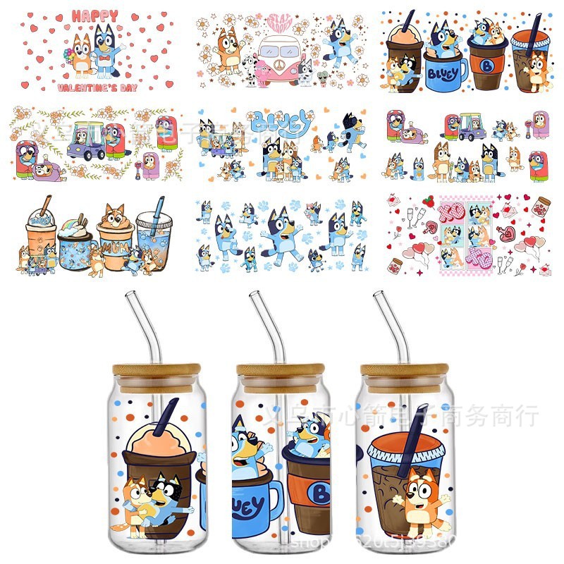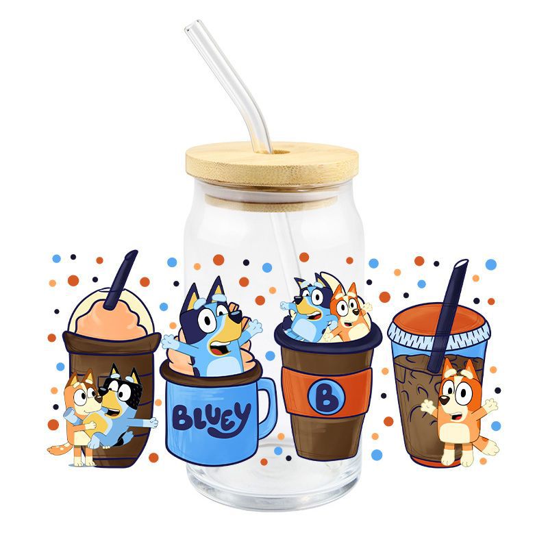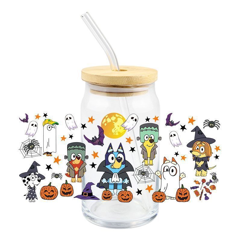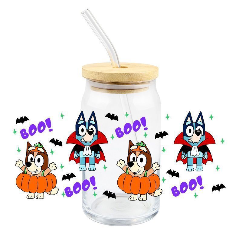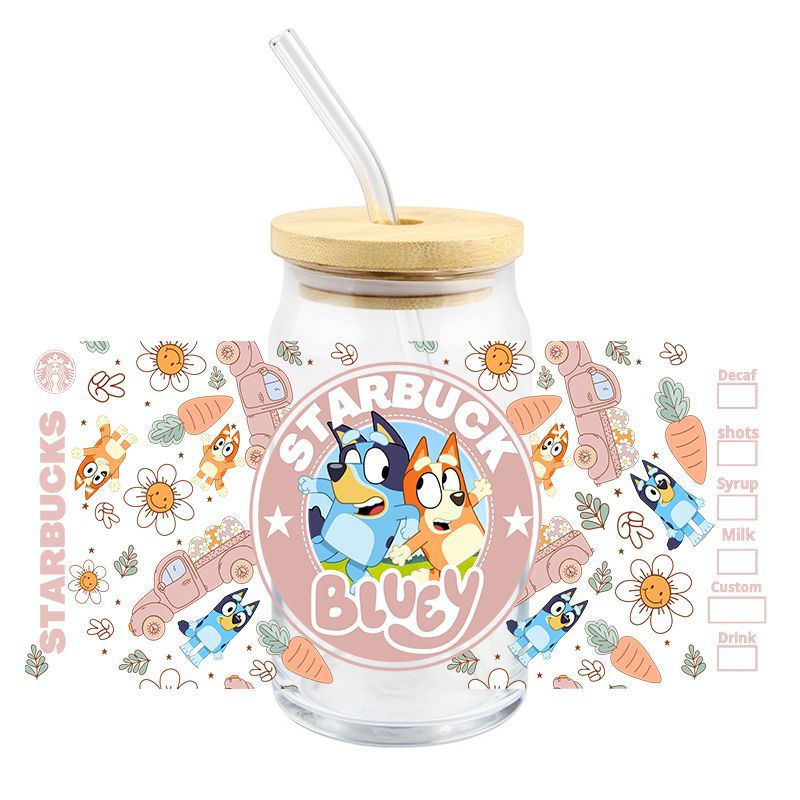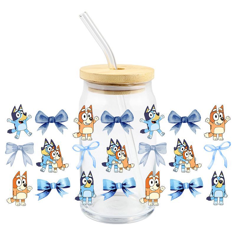 Brui UV DTF 크리스탈 투명 스티커 귀여운 만화 패턴 16 oz 유리 컵 방수 스크래치 방지 크로스 테두리스토어 가기