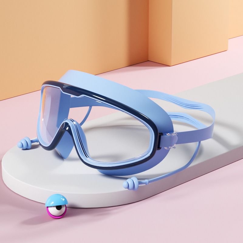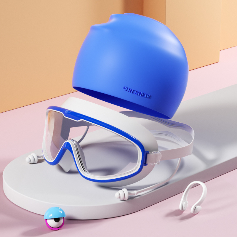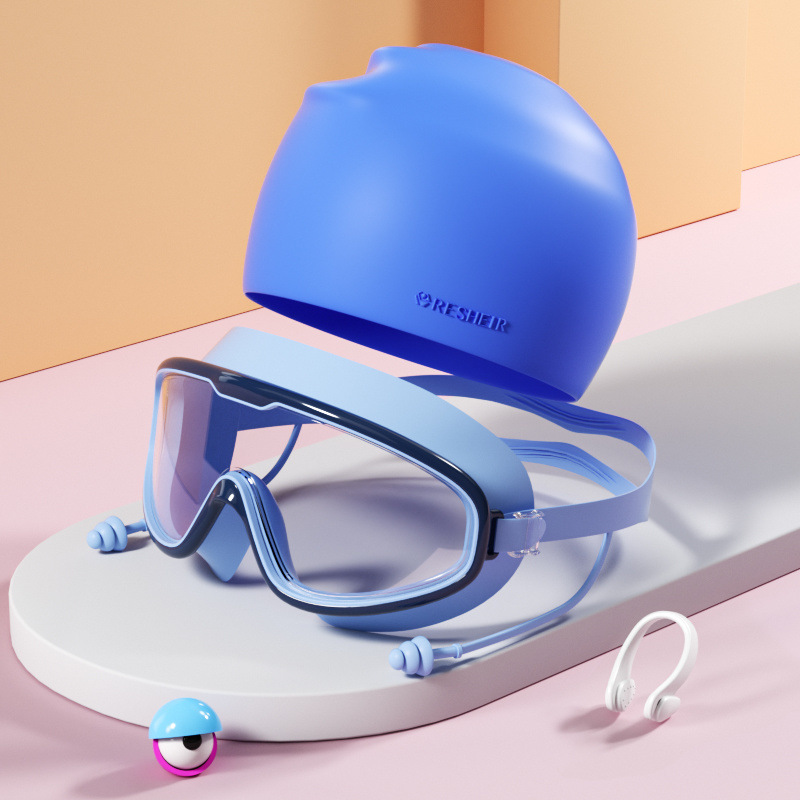 • 진한 파란색 [어린이용 대형 프레임 수영 고글] - 수영 고글 + (고급 수영 고글 상자) + 수영 모자 + 코 클립 귀마개