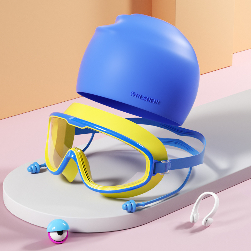 • 파란색과 노란색 [어린이용 대형 프레임 수영 고글] - 수영 고글 + (고급 수영 고글 상자) + 수영 모자 + 코 클립 귀마개