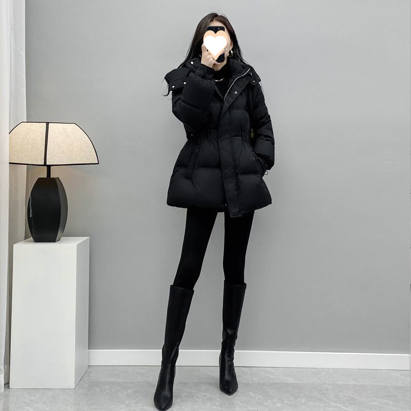 2024 겨울 새 블랙 후드 허리 다운 재킷 여성 한국 스타일 우아한 짧은 흰색 오리 다운 재킷스토어 가기