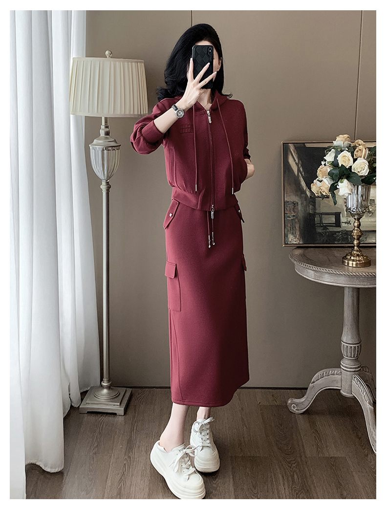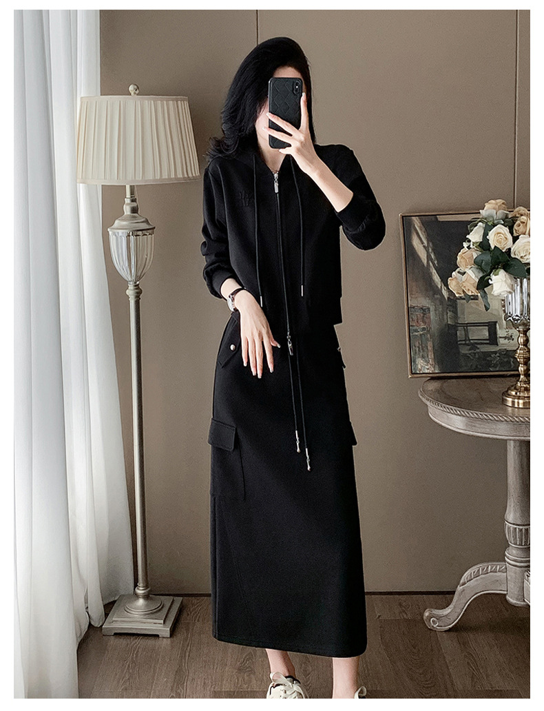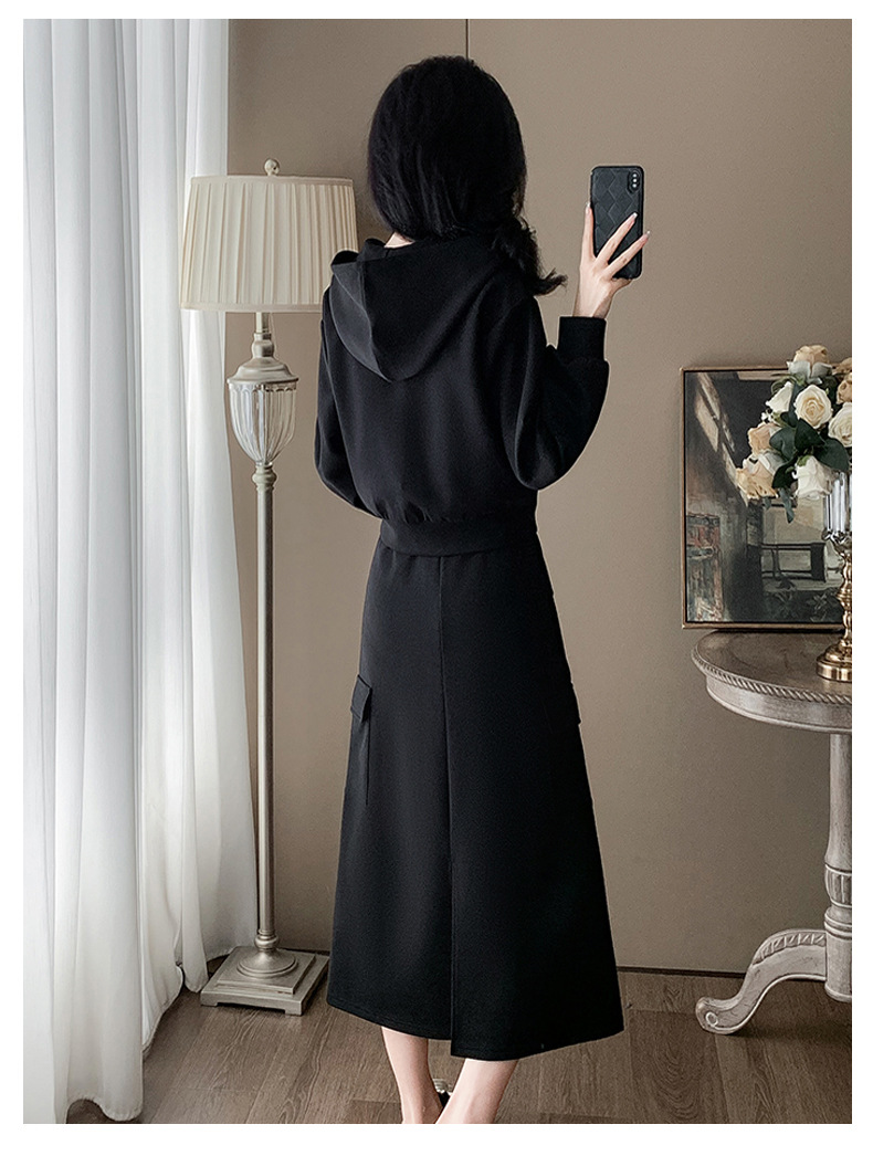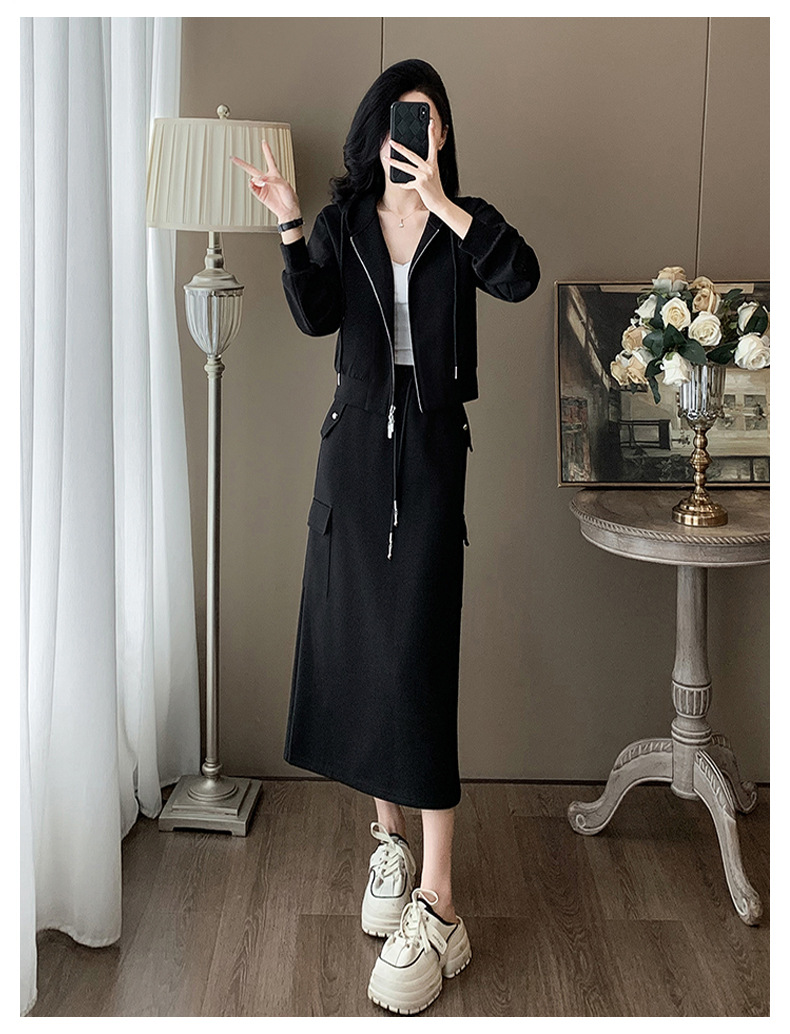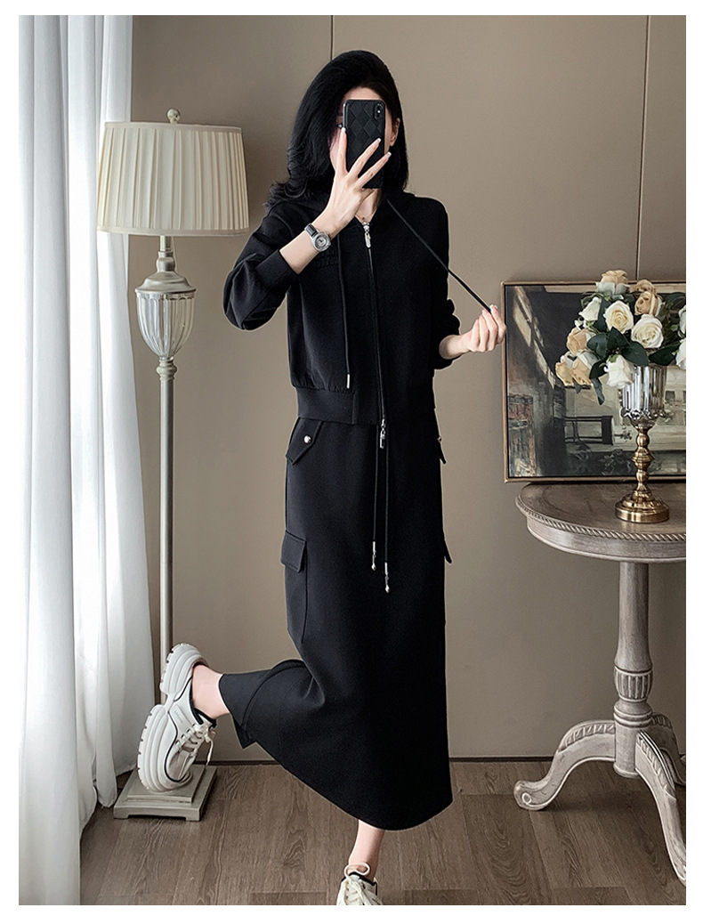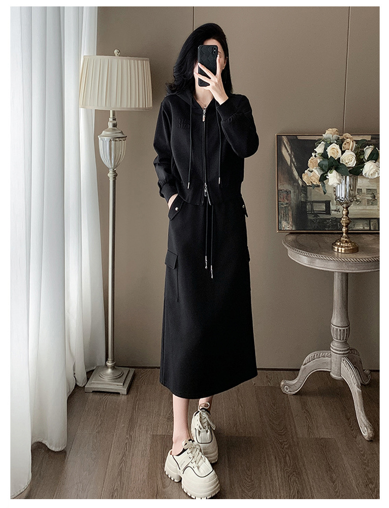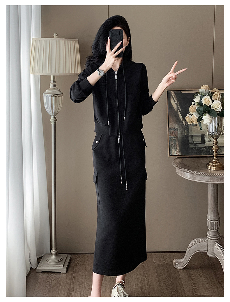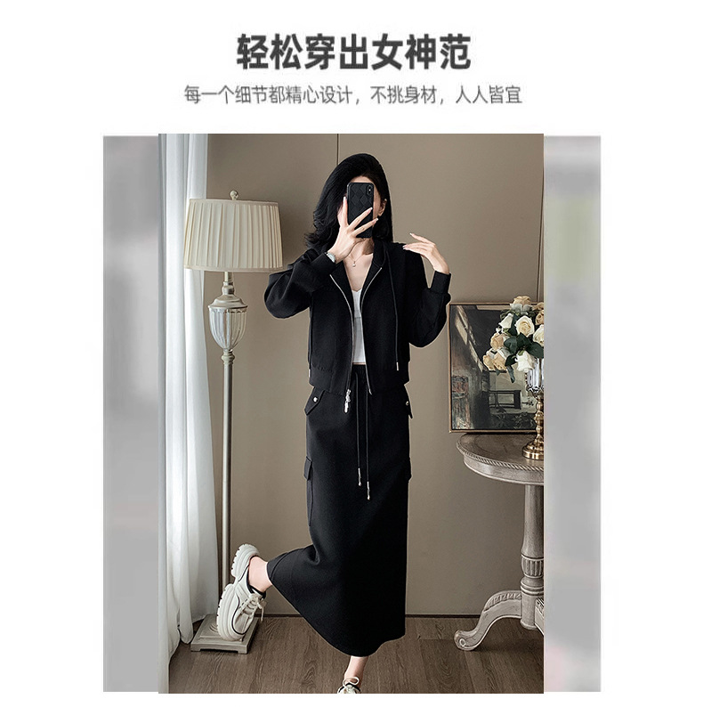 스포츠 레저 세트 여성의 가을 2024 새로운 패션 하이 엔드 블랙 후드 스웨터 스커트 투피스 세트스토어 가기