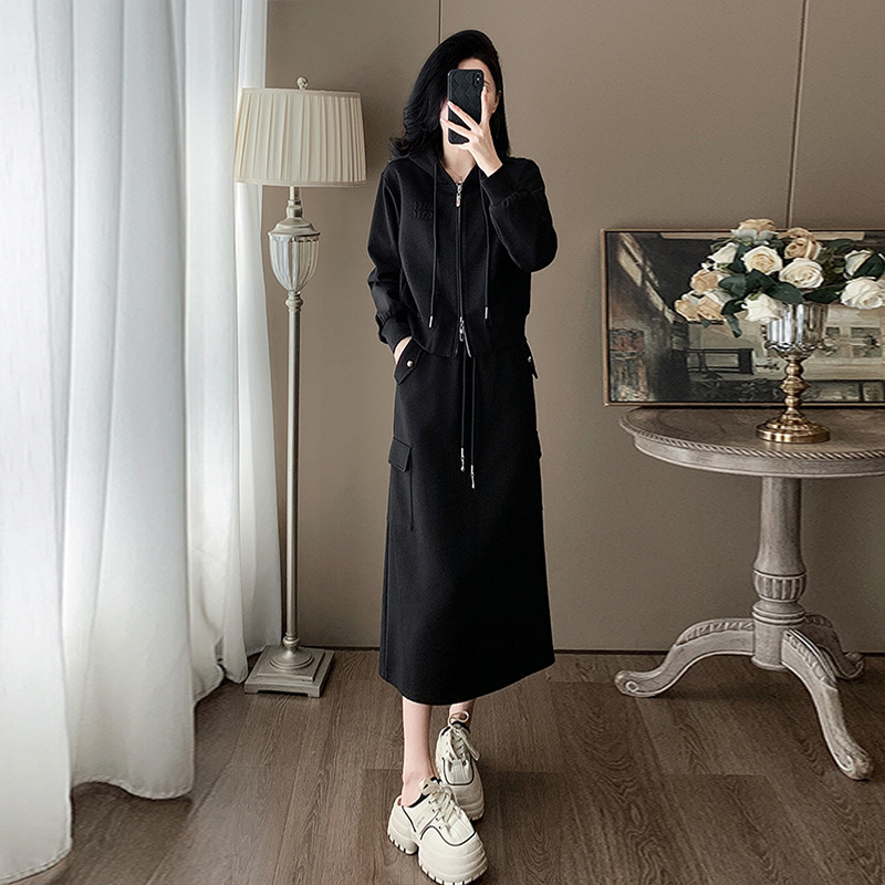 스포츠 레저 세트 여성의 가을 2024 새로운 패션 하이 엔드 블랙 후드 스웨터 스커트 투피스 세트