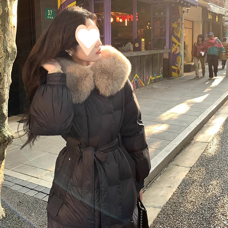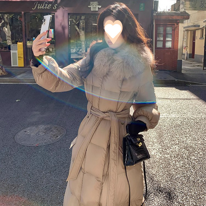 90 흰 오리 다운 긴 무릎 높이 양모 칼라 다운 재킷 여성 겨울 2024 새로운 스타일 레이스 업 허리 하이 엔드 코트 트렌디스토어 가기