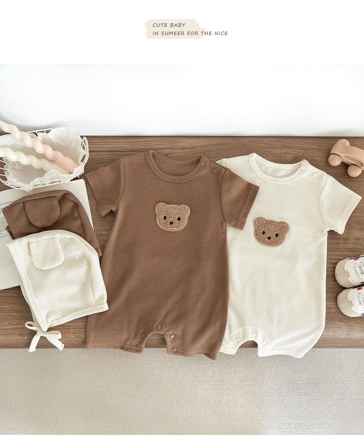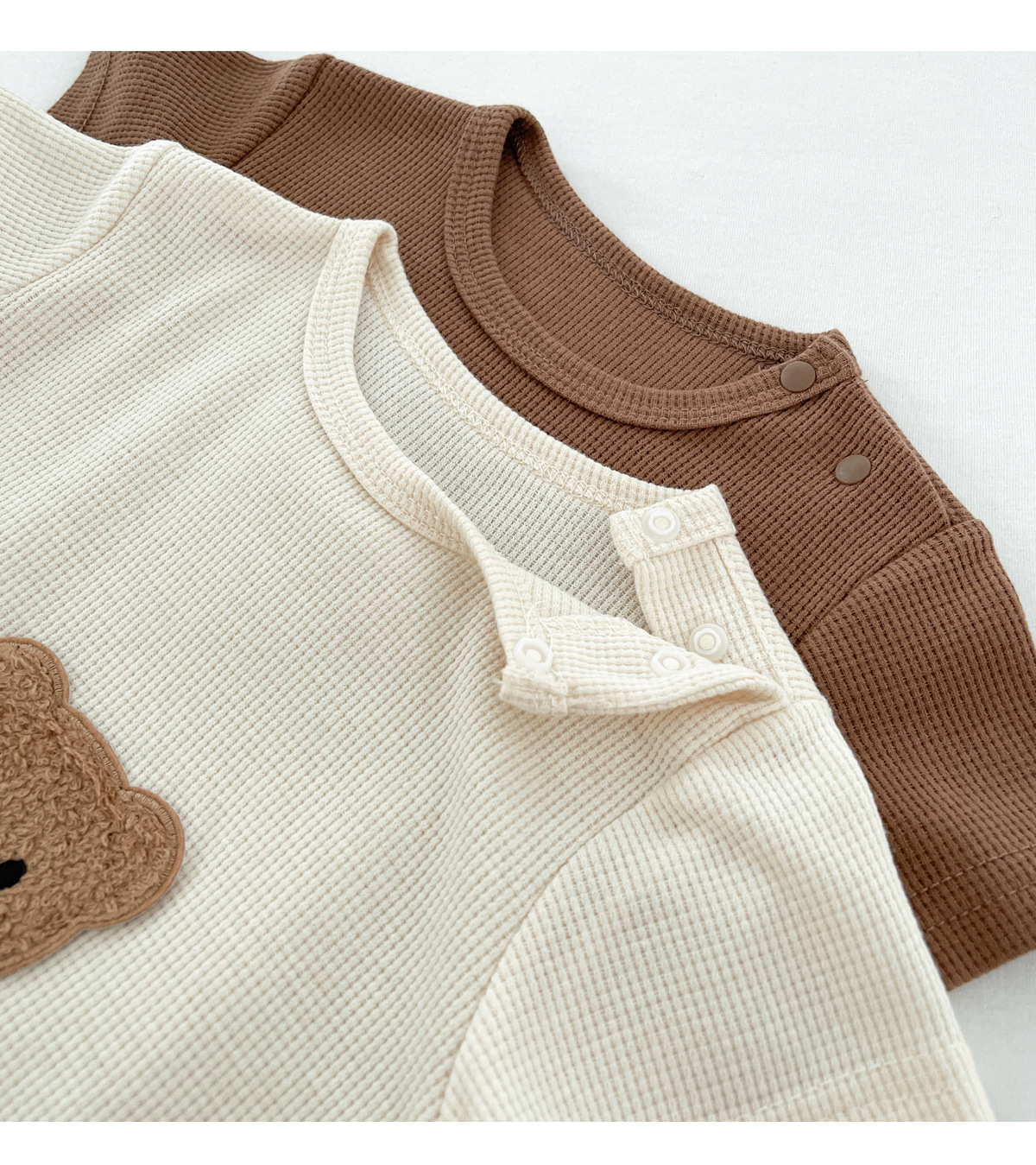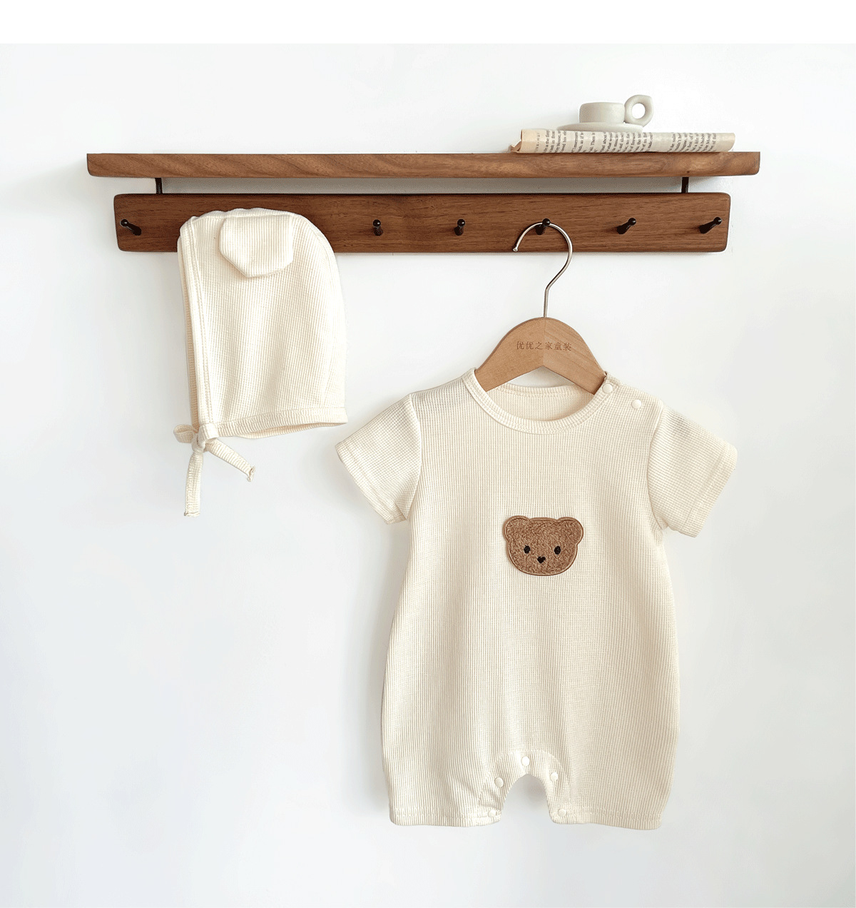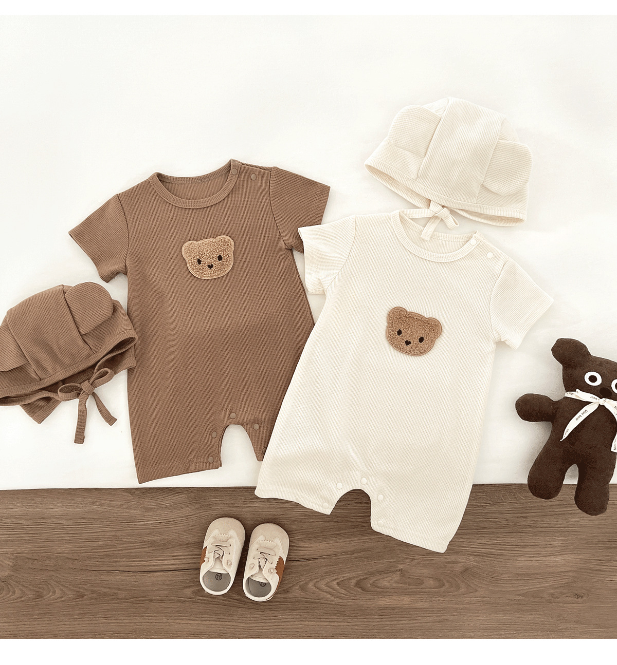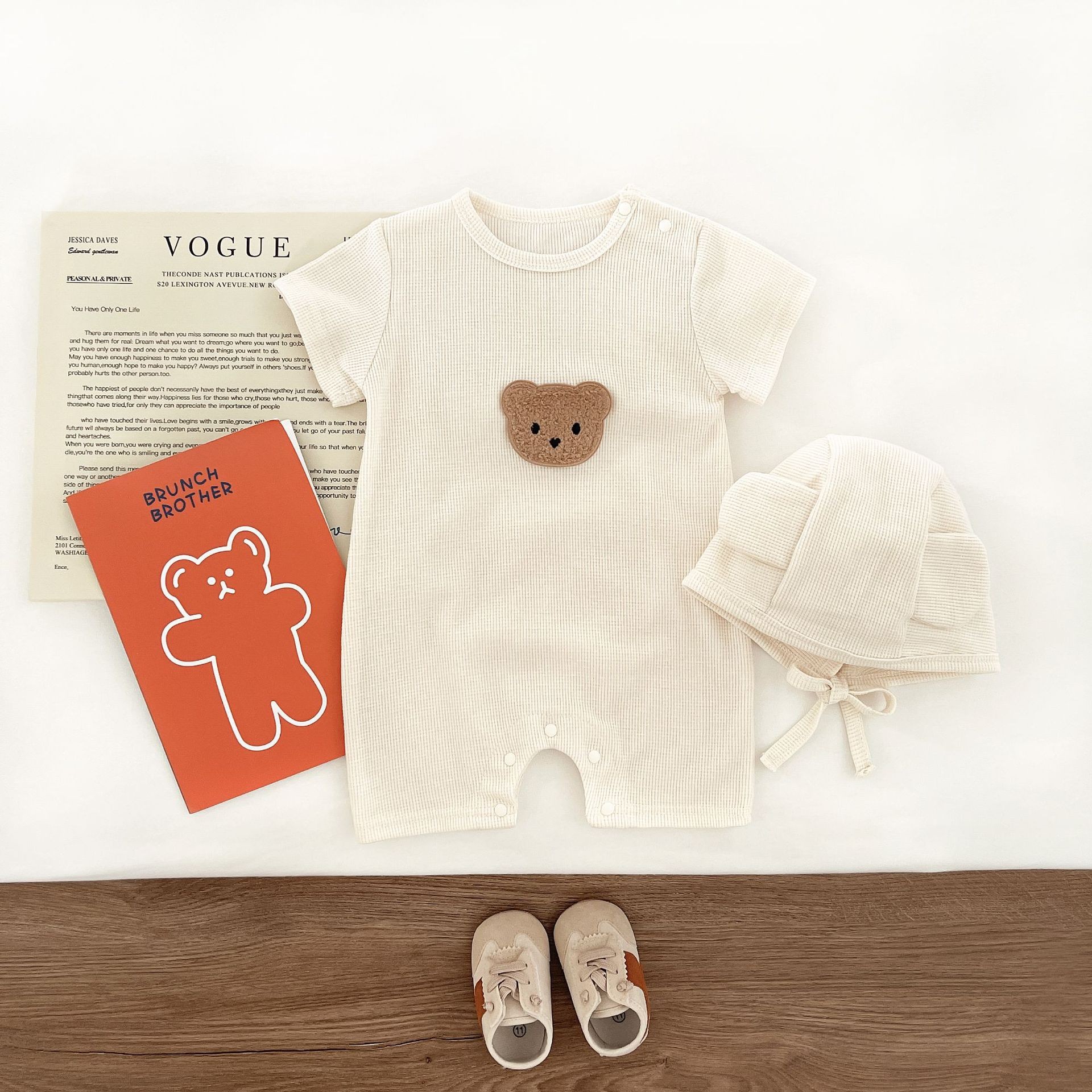어린이 의류 아기 점프 수트 여름 와플 큰 포켓 베어 아기 옷 아기 반팔 점프 수트