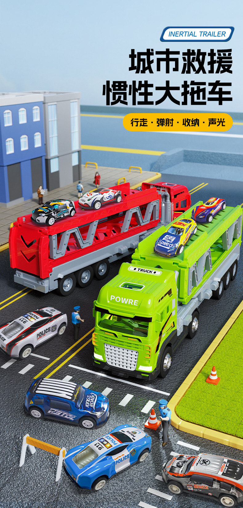 대형 관성 수송기 2 층 트레일러 관성 공학 차량 소년의 소리와 가벼운 차량 배출 장난감 자동차 어린이 장난감스토어 가기
