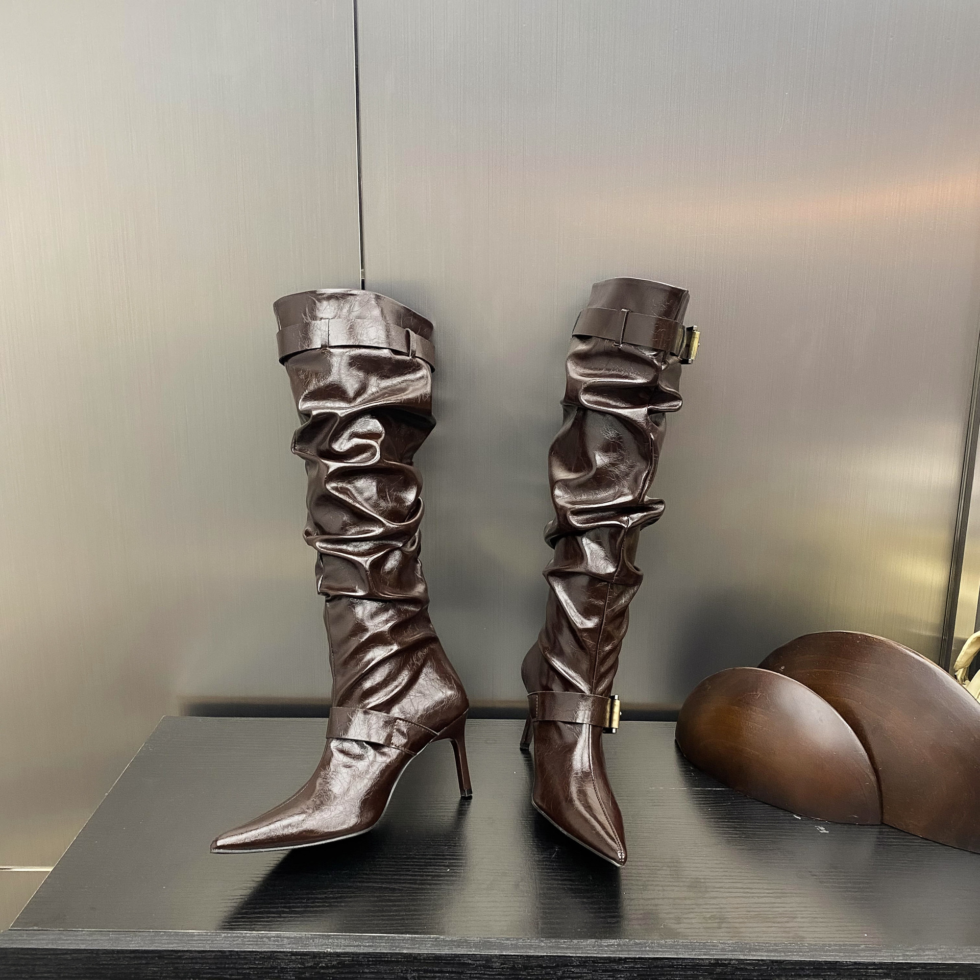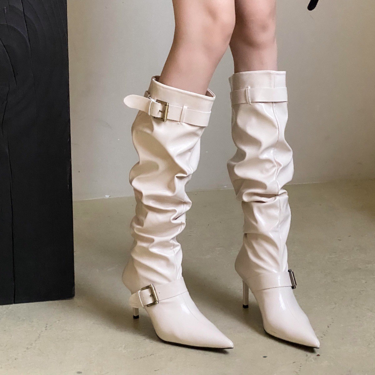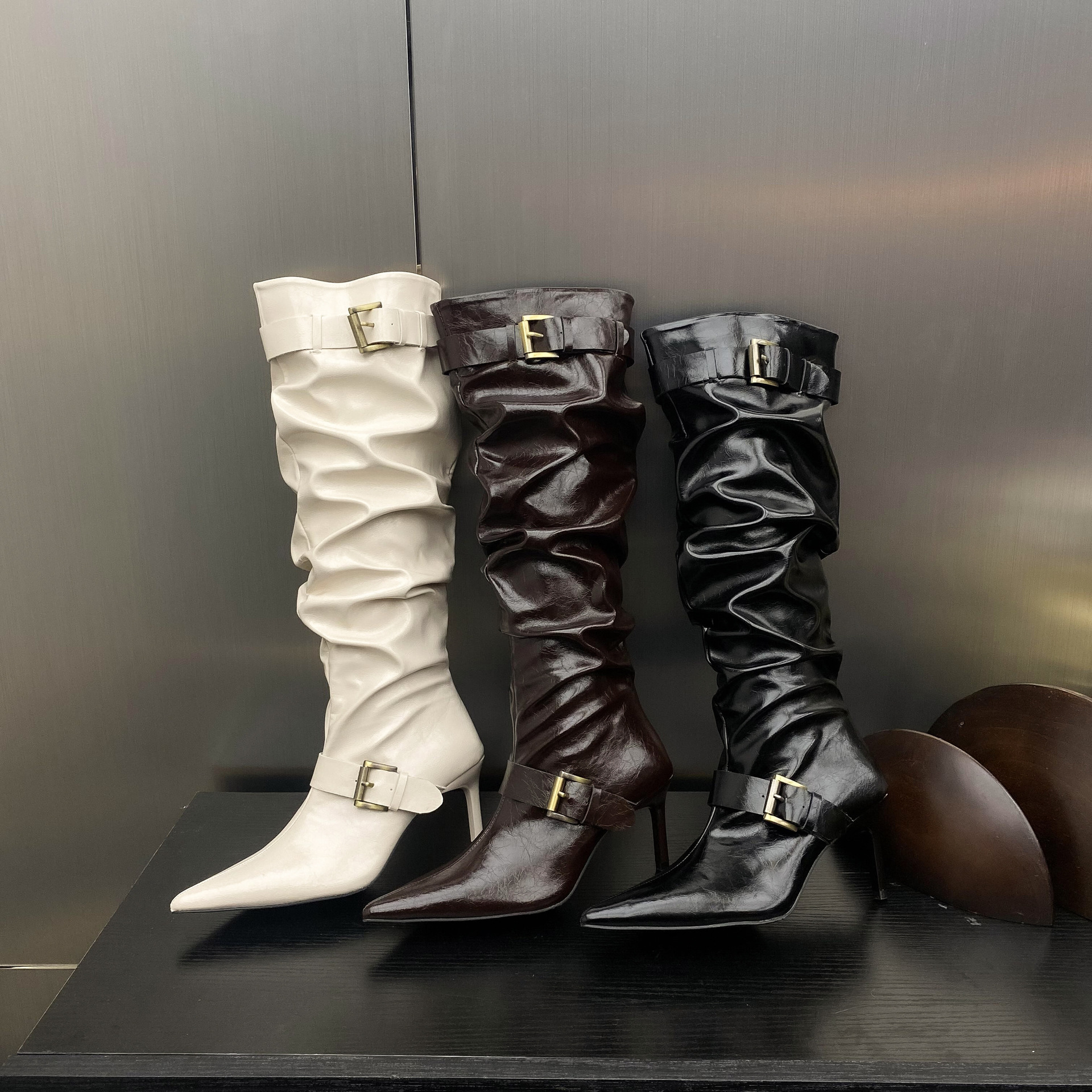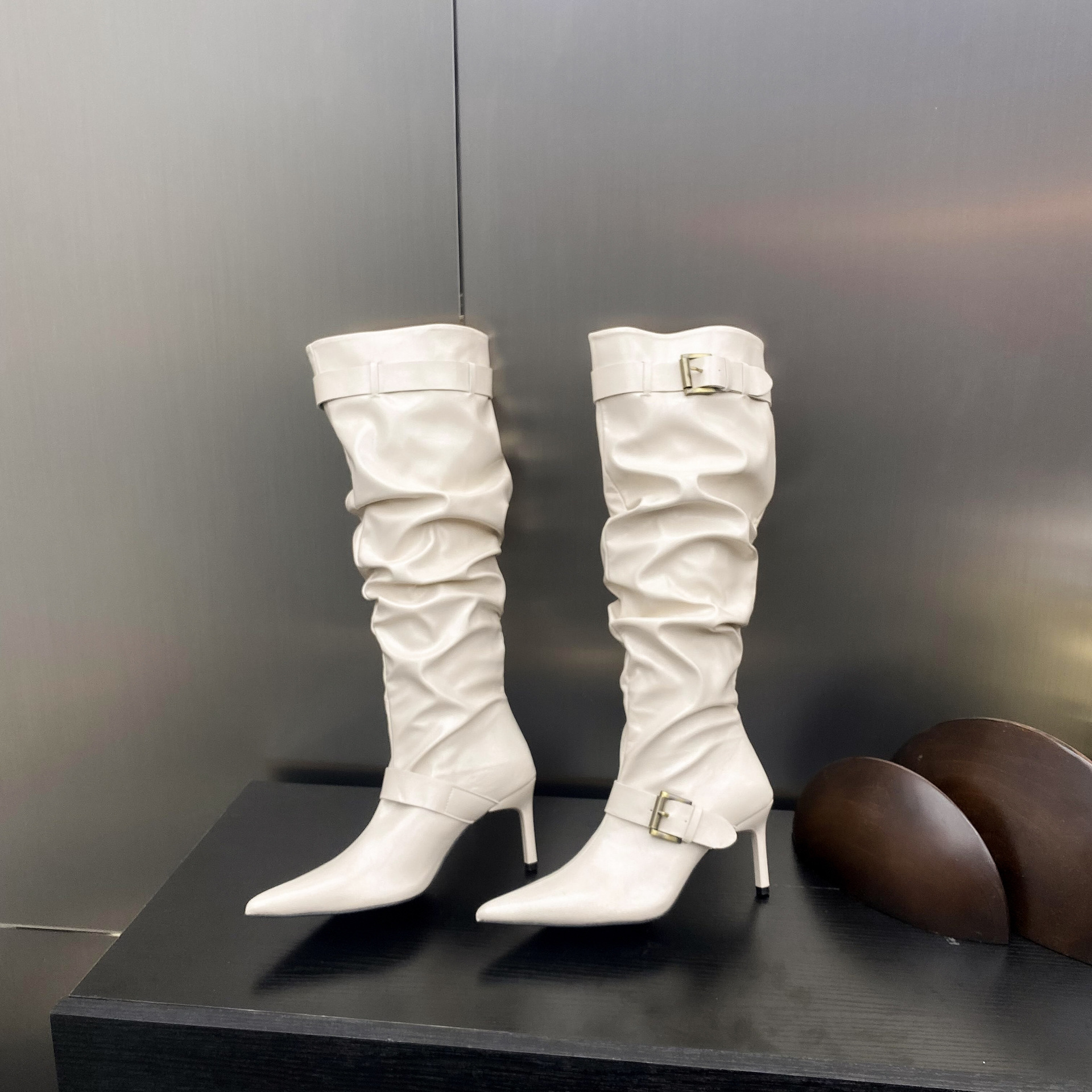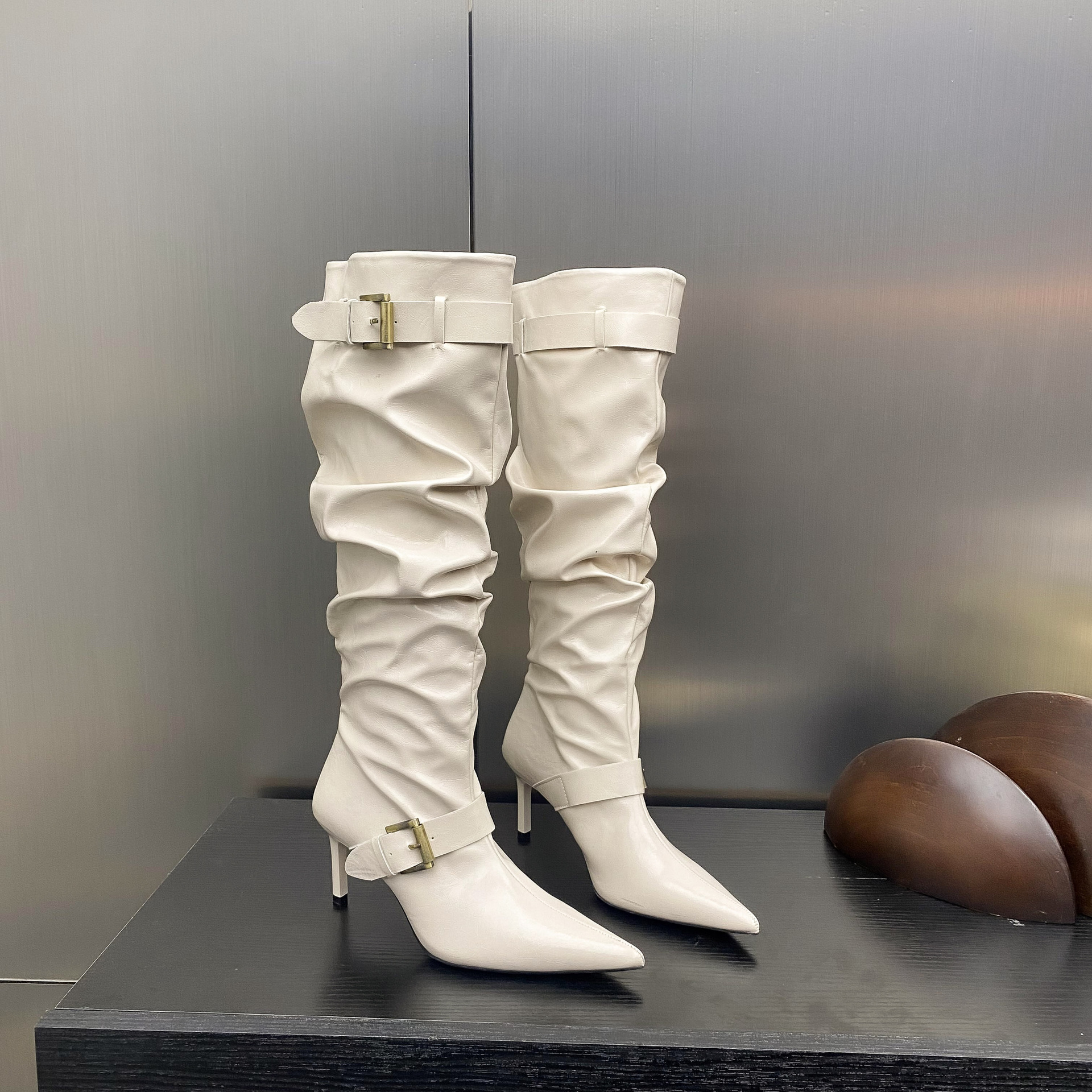 2024 가을 및 겨울 새로운 도착 벨트 버클 얇은 힐 미드 힐 하이힐 부츠 주름 여성 부츠 힙 부츠 마틴 부츠 웨스턴 부츠스토어 가기