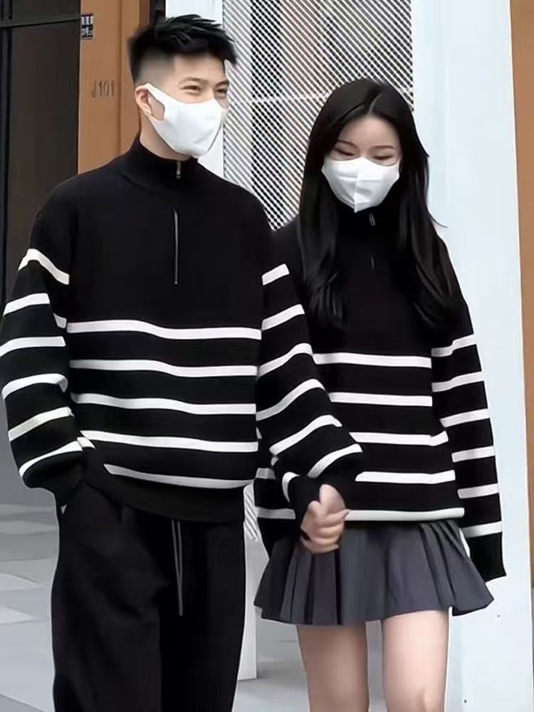 흑백 줄무늬 칼라 하프 Zip 순수 호주 울 남자 가을과 겨울 캐주얼 느슨한 게으른 스타일 풀오버 스웨터
