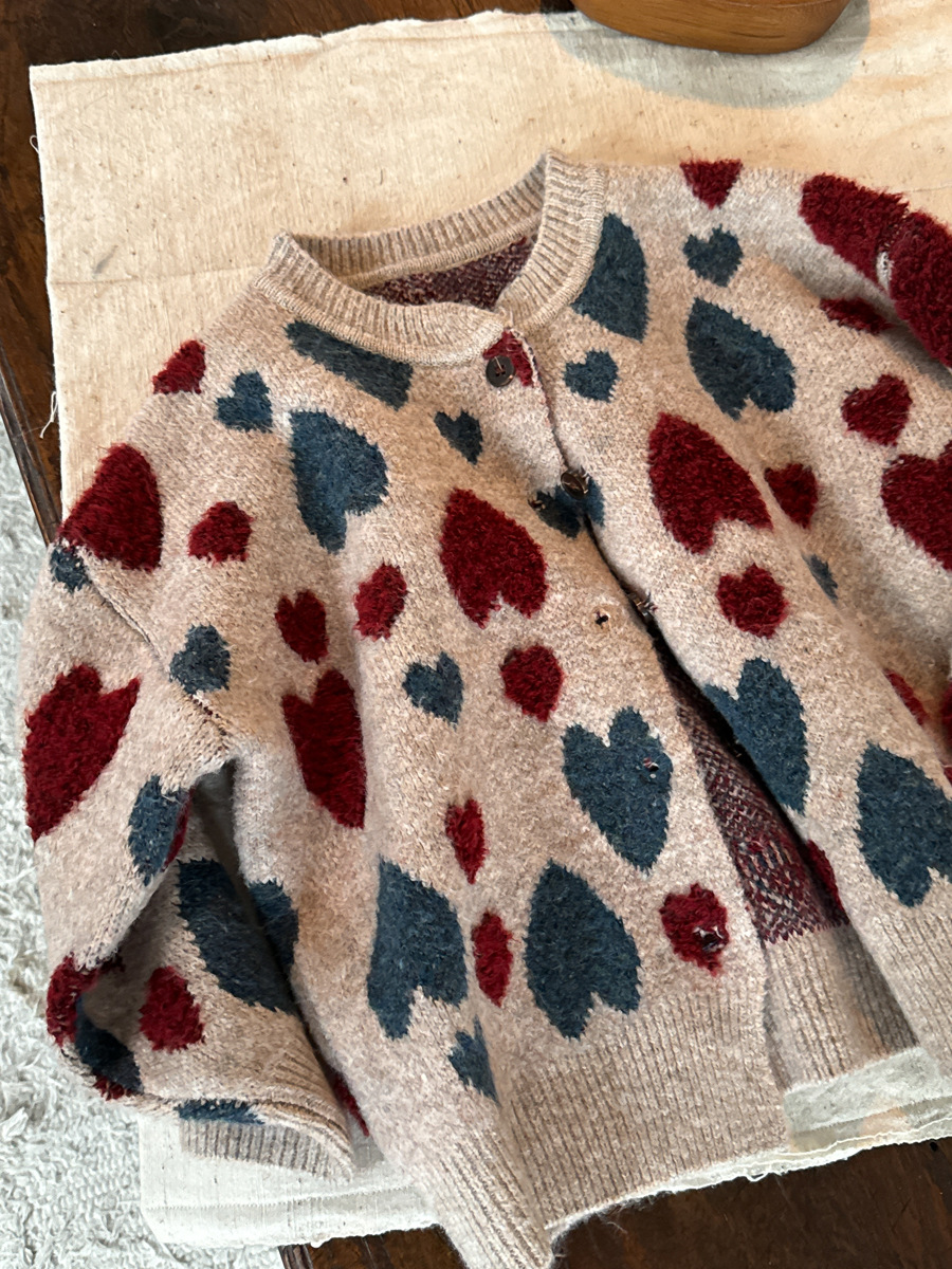 유유 공주 소녀의 가을과 겨울 일본 스타일 레트로 살구색 그레이 컬러 스웨터 아기 소녀 대비 컬러 러브 카디건 재킷스토어 가기